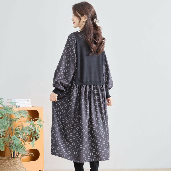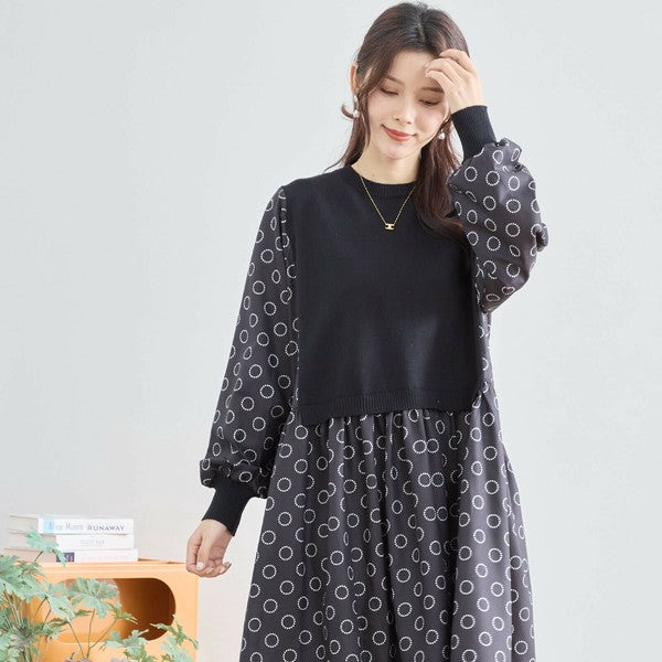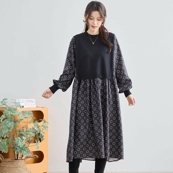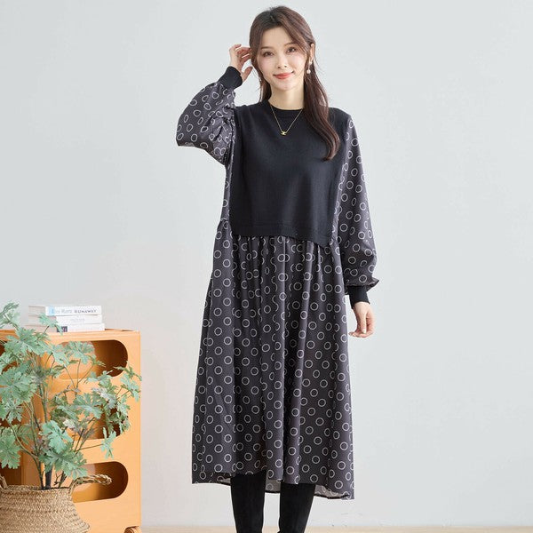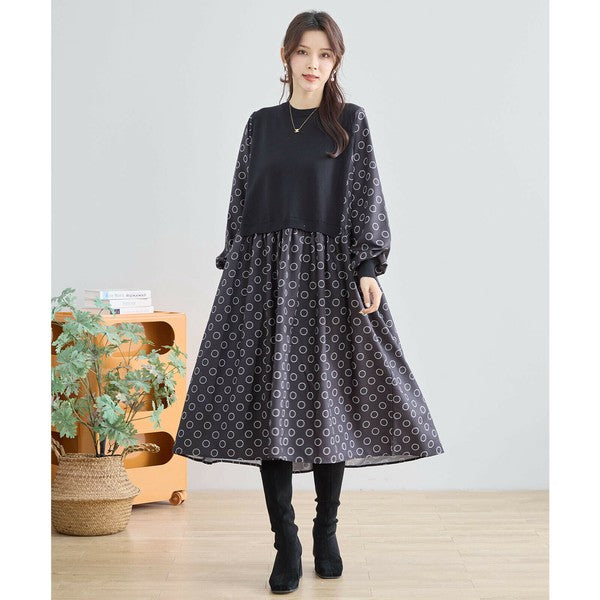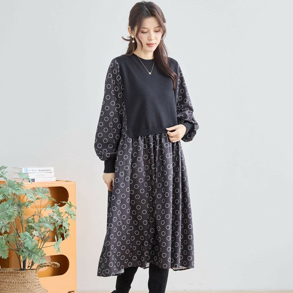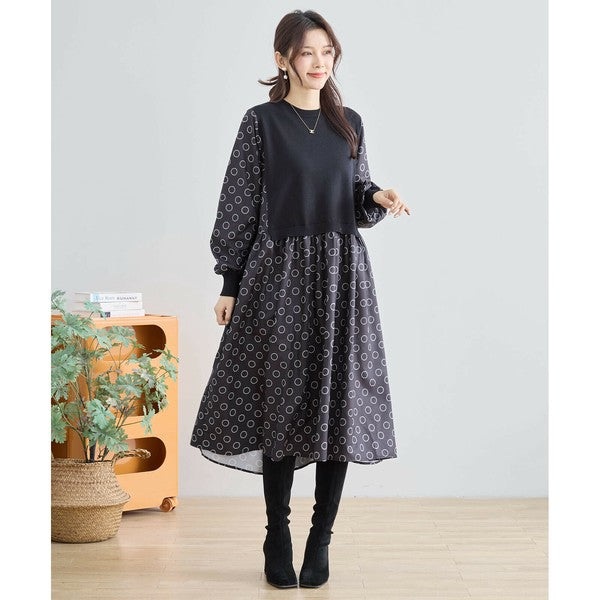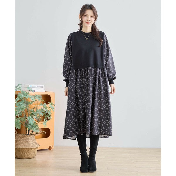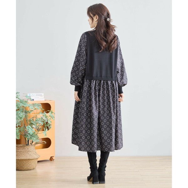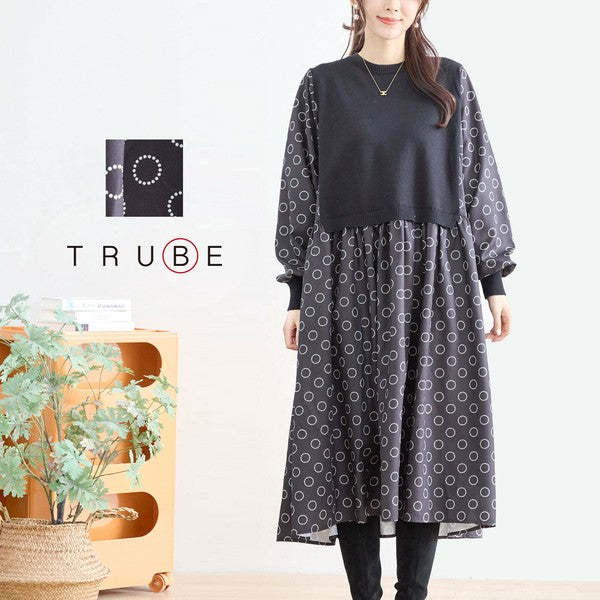 【L〜LL】異素材ドッキングサークル柄ワンピース|TRUBE 秋冬 レディース 長袖 ロング丈 体型カバー 大人可愛い N83-012