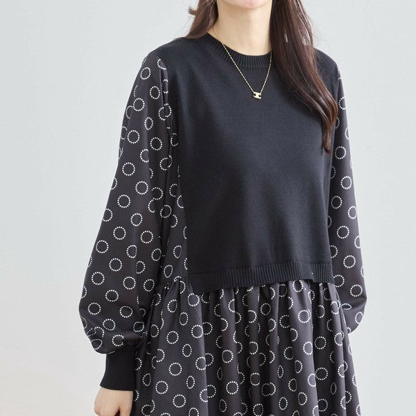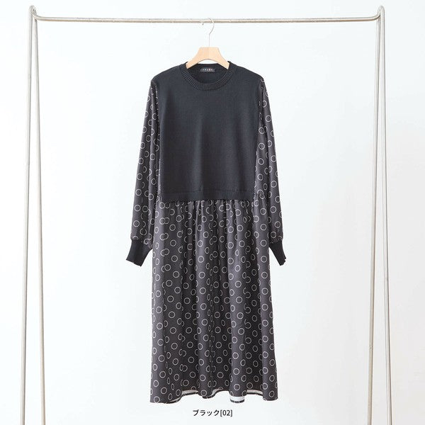上身頃は柔らかなニット調素材、スカート部分には軽やかなサークル柄生地を使用し、動くたびに表情を変えるデザインが魅力です。
