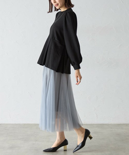・腰下から広がるプリーツ風のゆるいフレアが美シルエットをメイク