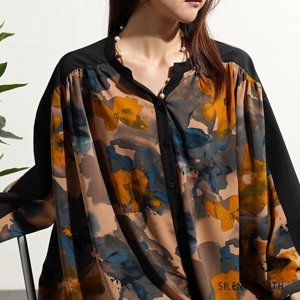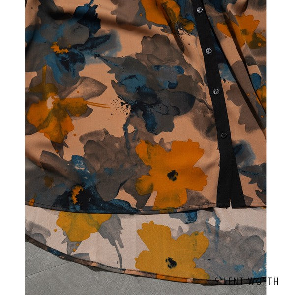 【M】ペイント柄 配色切替 ビッグシャツ ぼかし花柄 チュニック オーバーサイズ SILENT WORTH