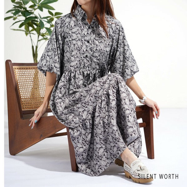 SILENT WORTHの「袖バルーン総柄ワンピース」は、シックなモノトーン柄と女性らしいバルーン袖がポイント。ゆったりとしたシルエットで体型を選ばず、着心地も快適。カジュアルにもきれいめにもスタイリングできる、大人のワードローブにおすすめの一枚です。