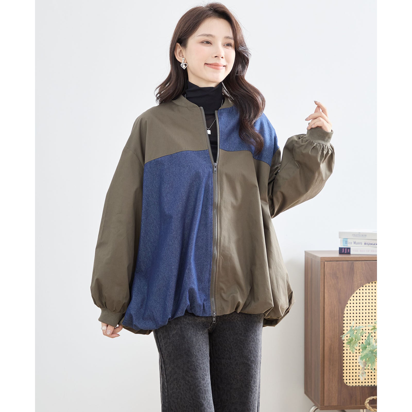 デニム素材とブラックのコンビネーションが特徴的なビッグシルエットのブルゾン。ゆったりとしたシルエットで、リラックス感がありながらもスタイリッシュに着こなせます。裾のバルーンデザインが個性的なアクセントとなり、カジュアルシーンやトレンド感を取り入れたスタイリングに最適な一着です。