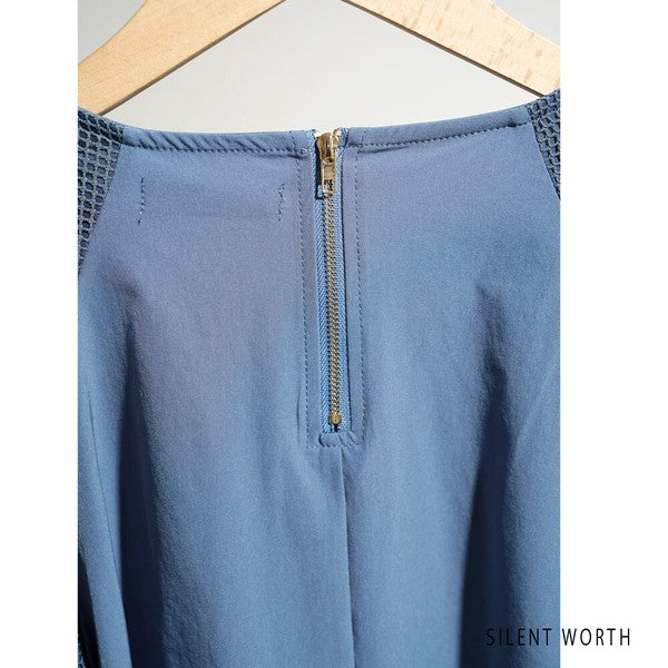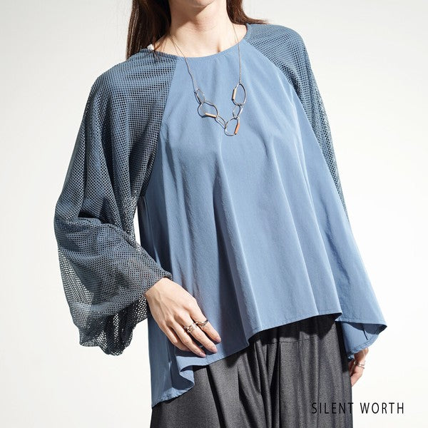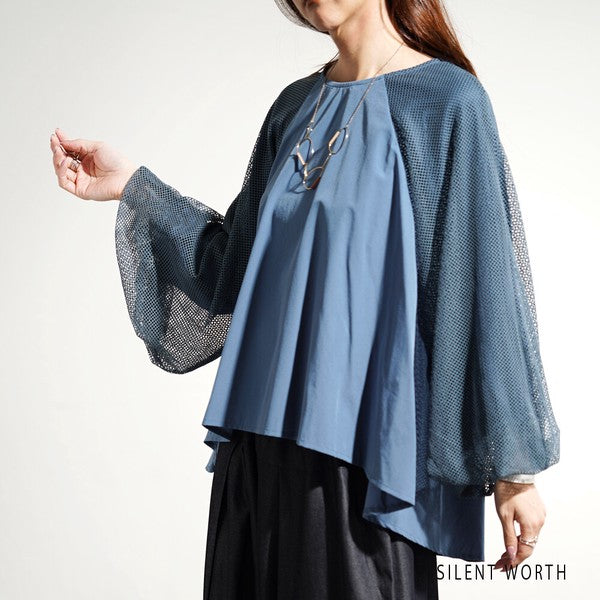 【M】袖メッシュ バルーンスリーブ プルオーバー 異素材切替 バックジップ ブラウス SILENT WORTH