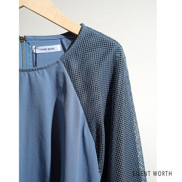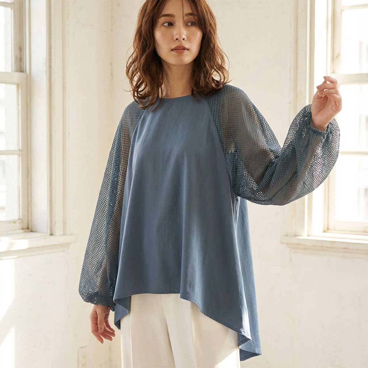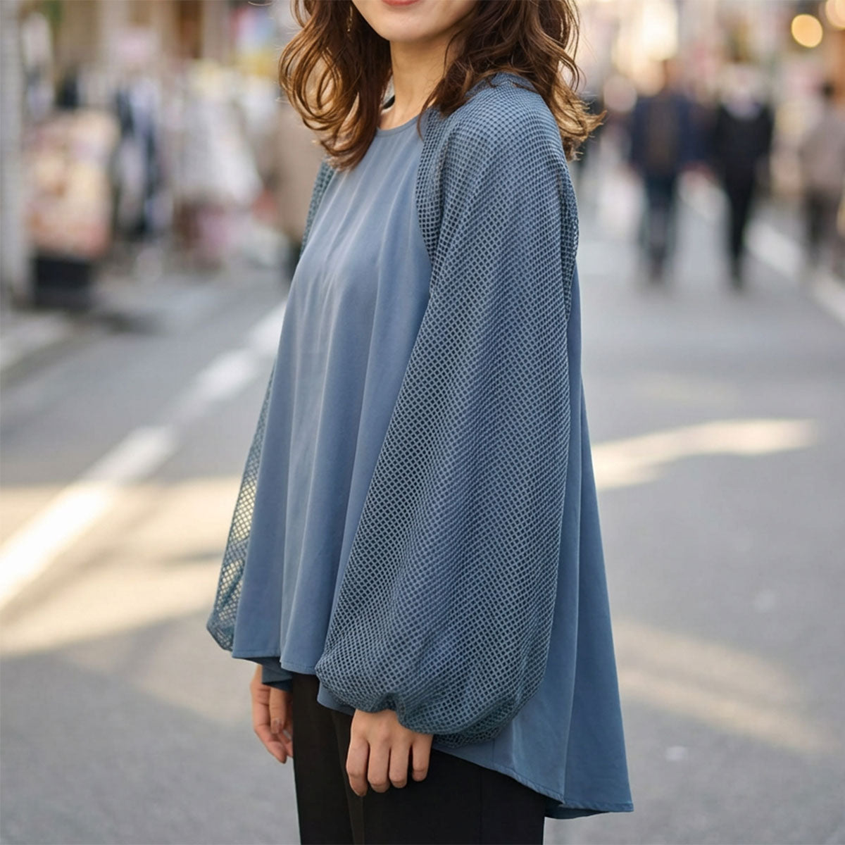 最大の特徴は、袖に重ねられた「メッシュ素材」。 ふんわりとしたバルーンシルエットが女性らしさを引き立てつつ、メッシュの透け感が甘さを抑えた大人の抜け感を演出します。