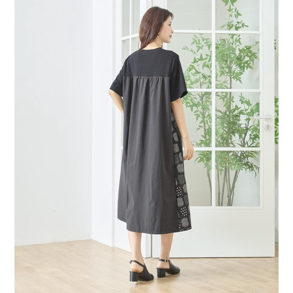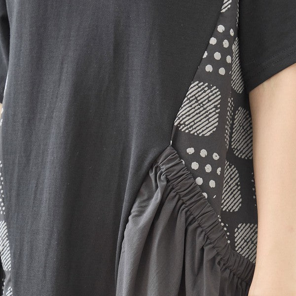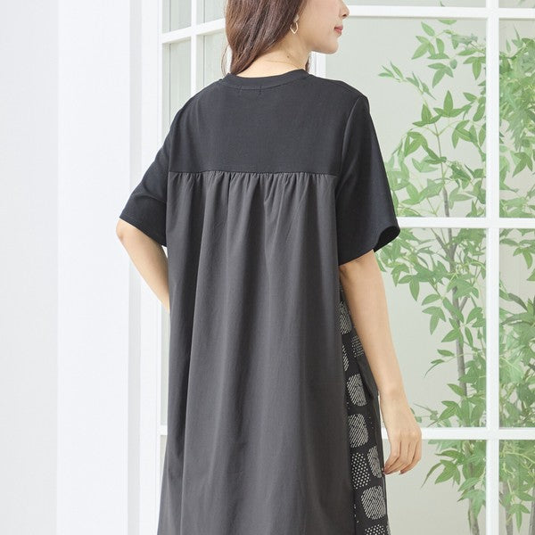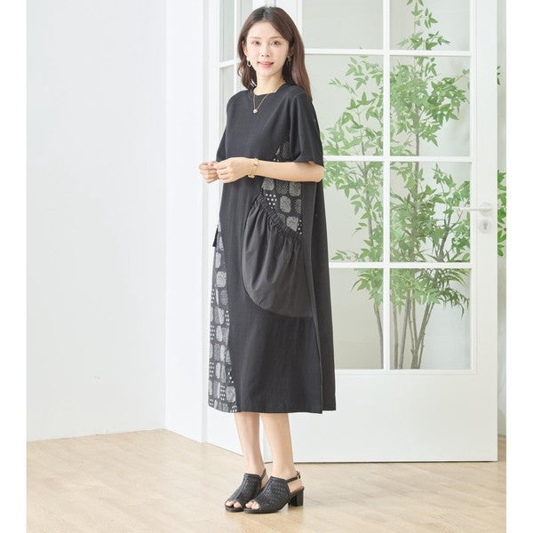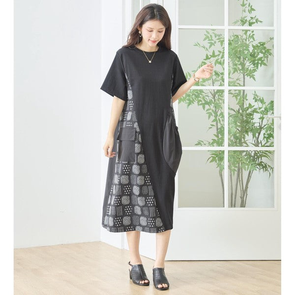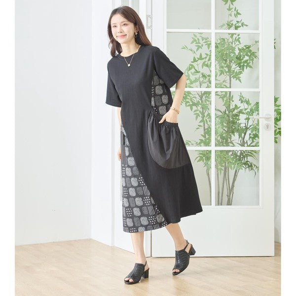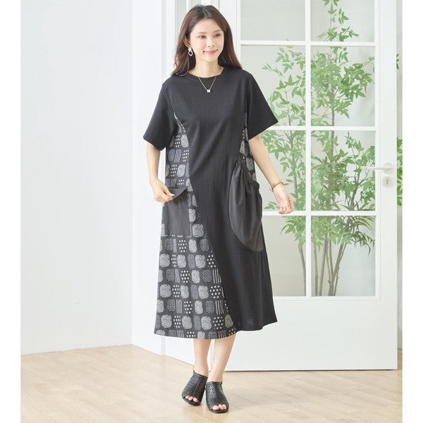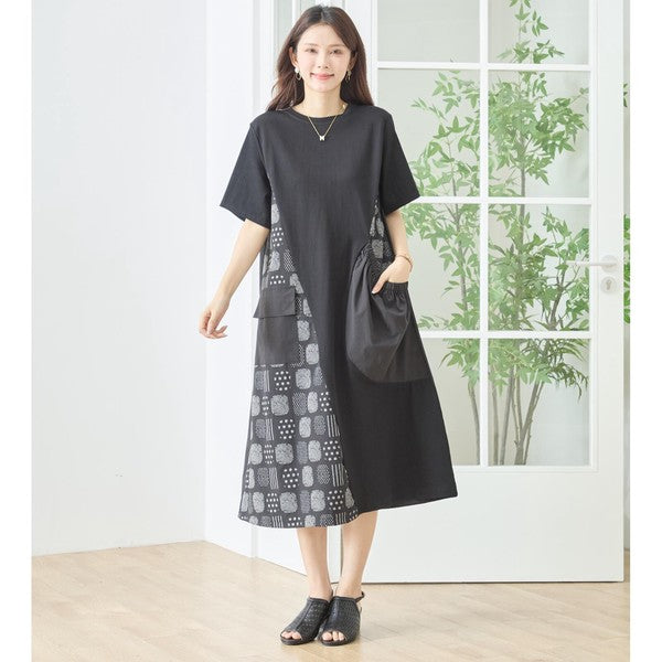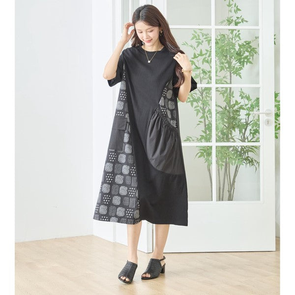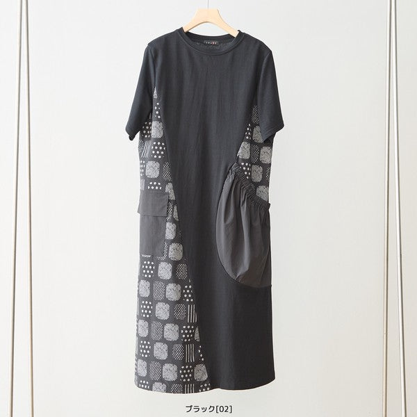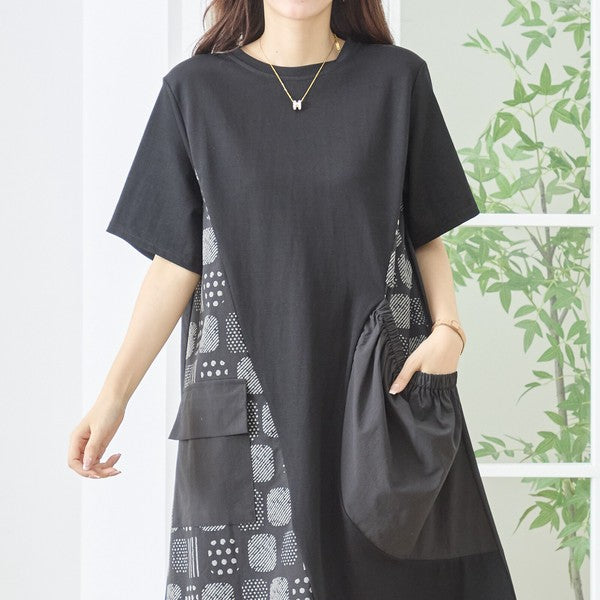幾何学柄 切替 ギャザーポケット ワンピース 半袖 綿混 ゆったり 体型カバー M-L