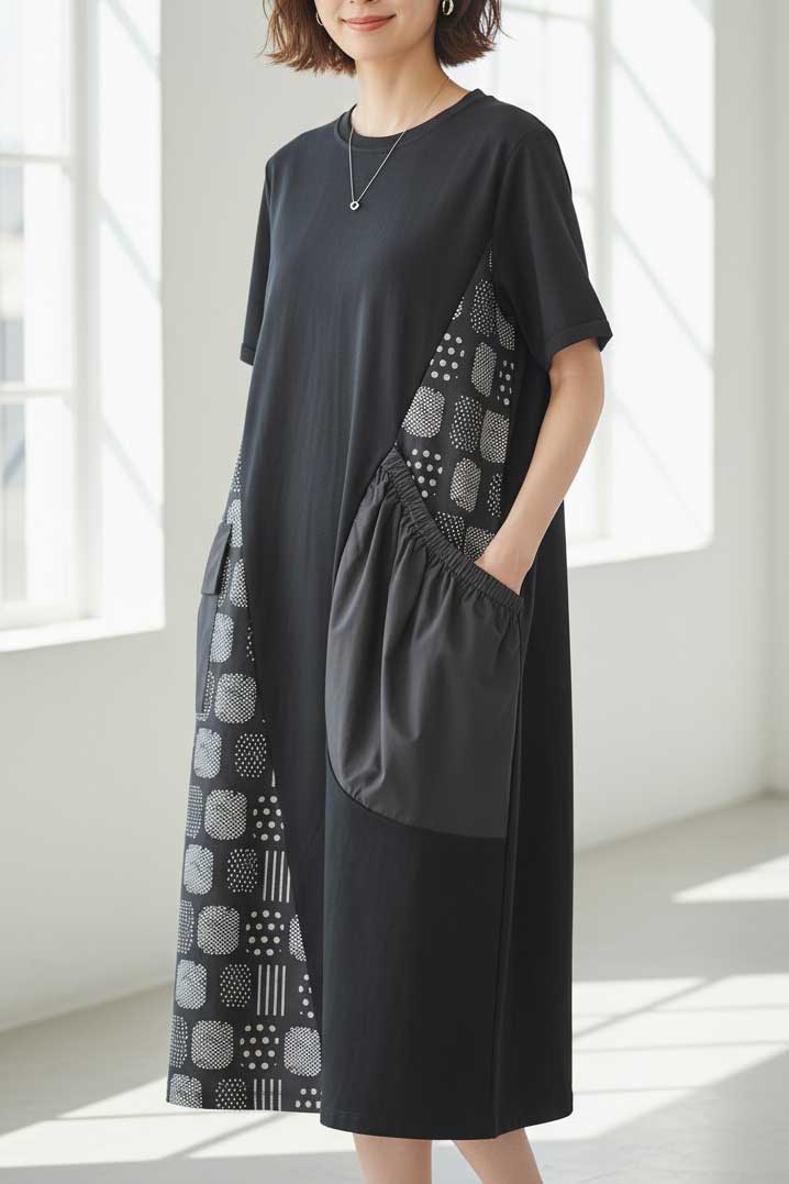 ストンと着るだけで、遊び心と細見えを両立。アシンメトリーなポケットが目を惹く、大人の洗練デザインワンピース。