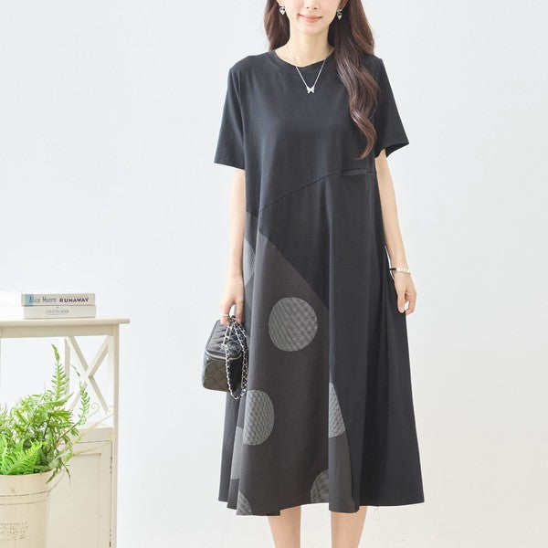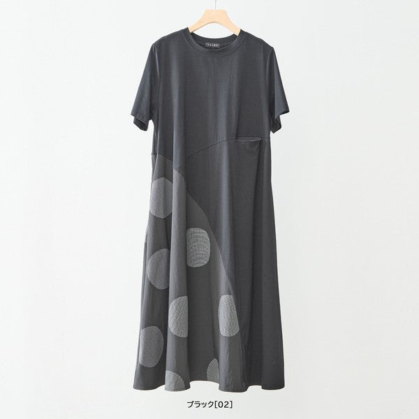 モノトーン 大ドット柄 切替 フレア ワンピース 半袖 ゆったり 体型カバー M-L