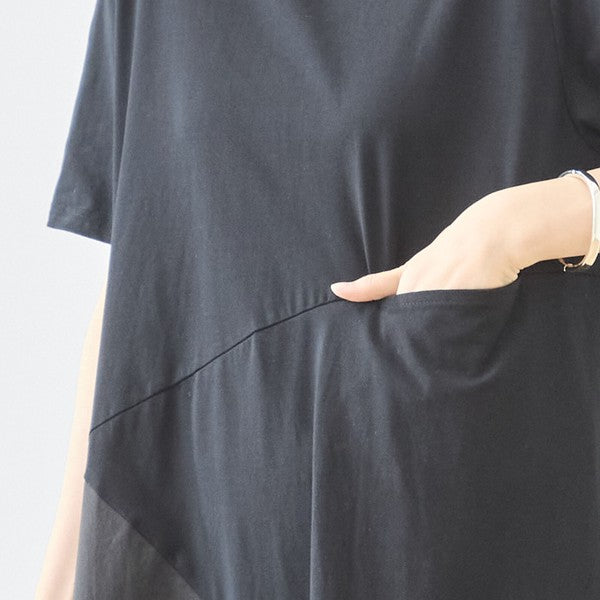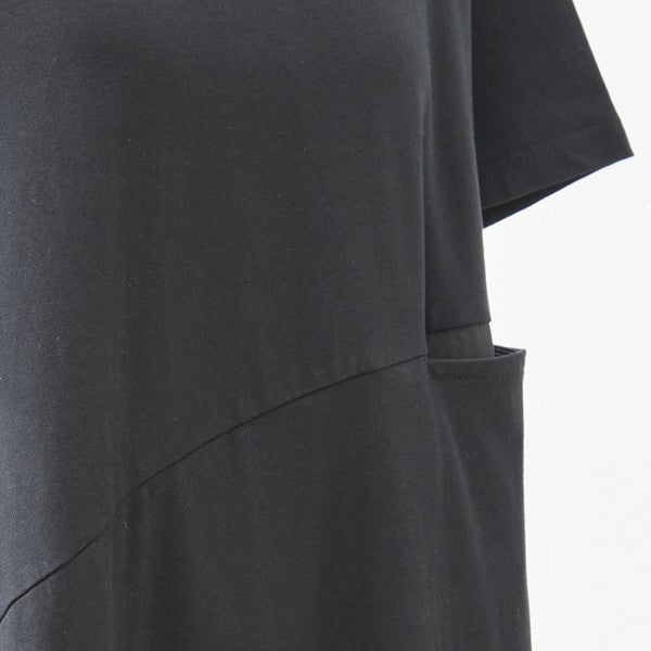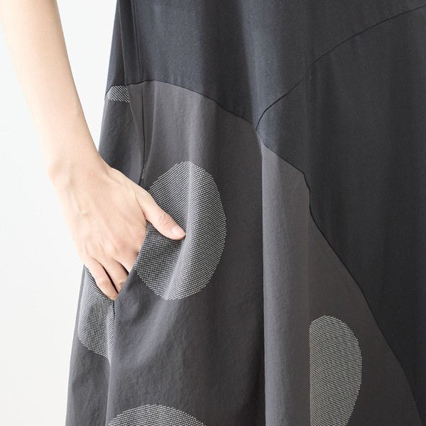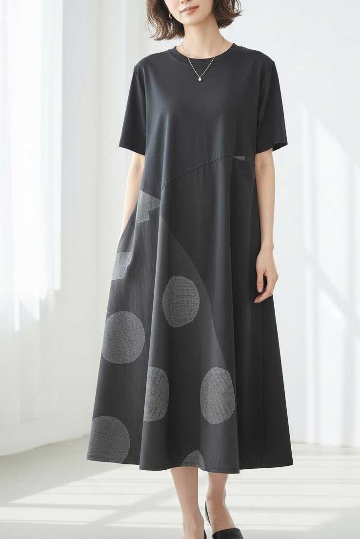 ・視線を騙す「アシンメトリー切替」 大胆な斜めの切替ラインと、存在感のある大きなドット柄を組み合わせたデザイン性の高い一枚。モノトーンの配色がドット特有の甘さを抑え、40代〜60代の女性にふさわしい洗練された大人のモード感を演出してくれます。胸元にあしらわれたフェイクポケットも、さりげないアクセントに。