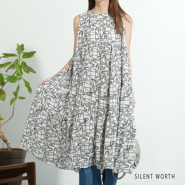 華やかな総柄プリントが印象的なノースリーブワンピース。4段構成のティアードシルエットがふんわりと広がり、フェミニンさとリラックス感を兼ね備えた一枚です。安全ピン柄の個性豊かなパターンをご用意。軽やかな着心地と上品なデザインで、日常使いからリゾートシーンまで活躍します。