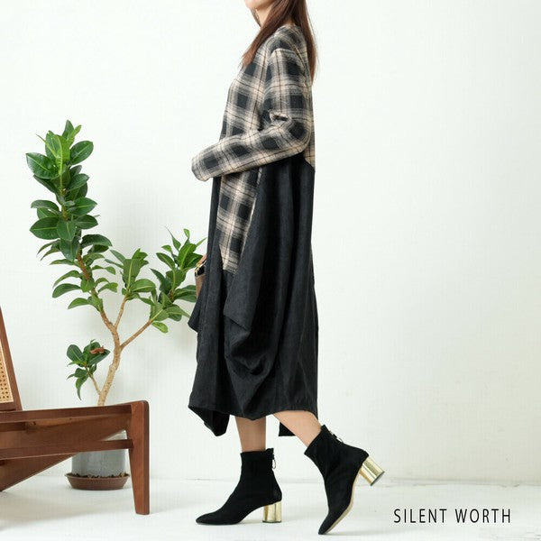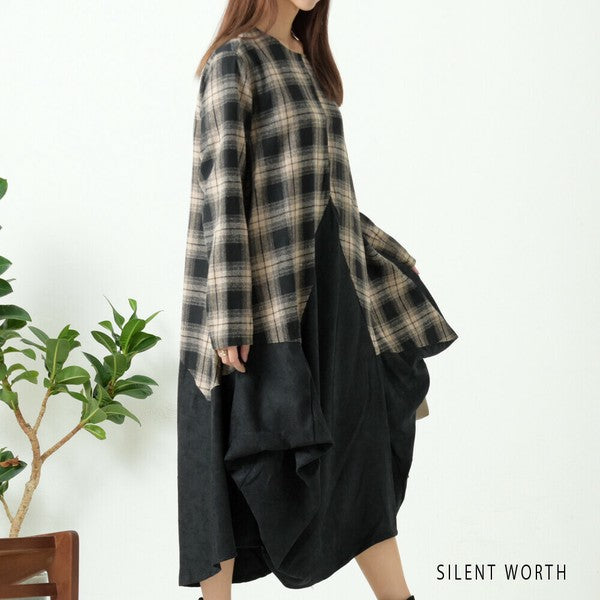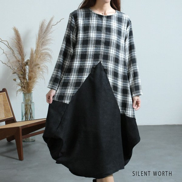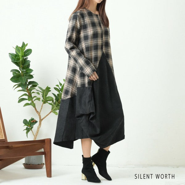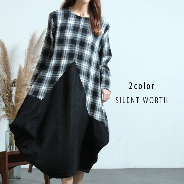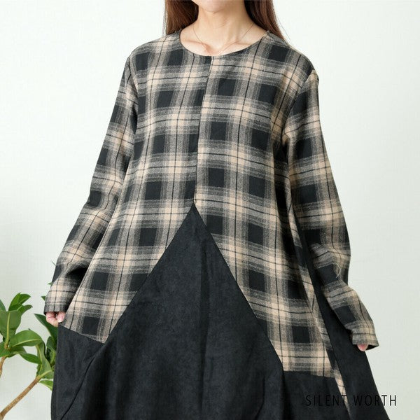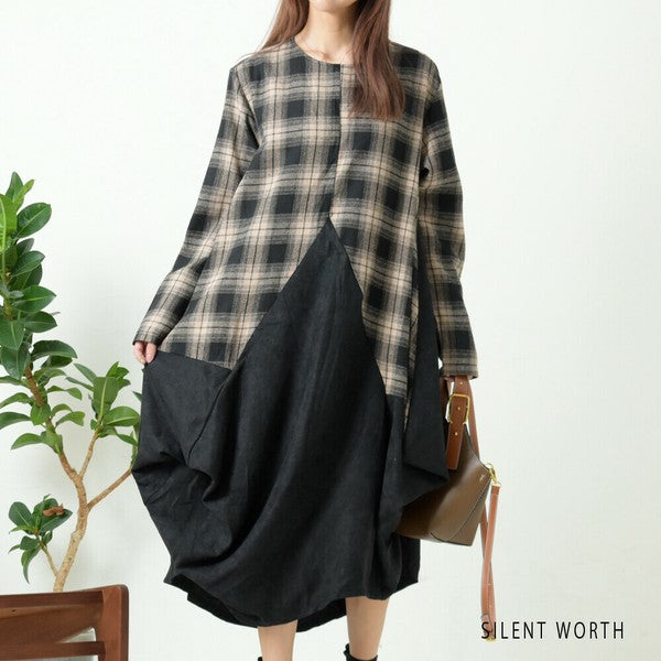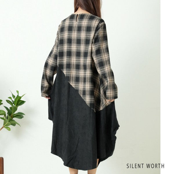 【M】チェック異素材配色ワンピース|切替デザイン・コクーンシルエット・秋冬・Z-090