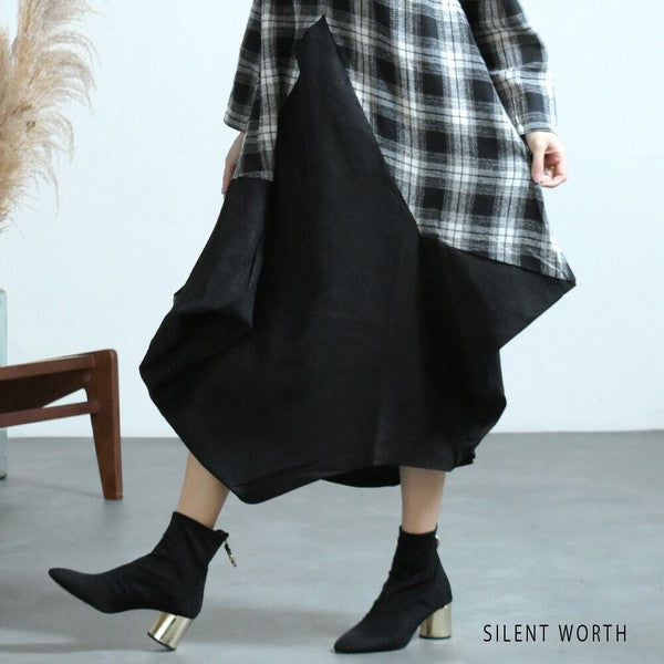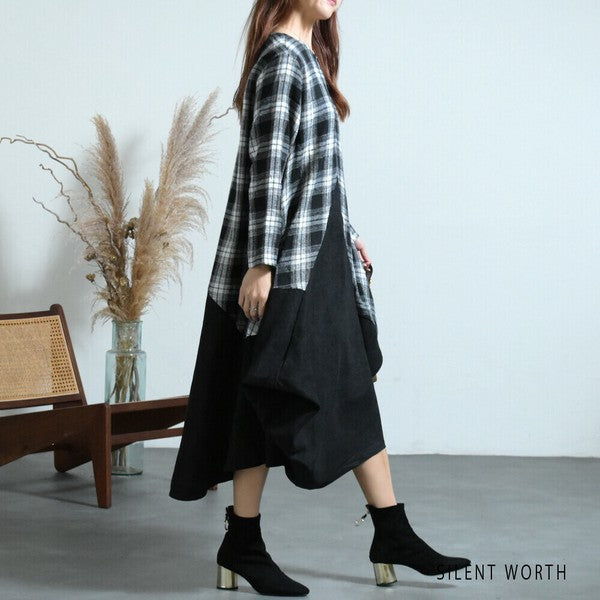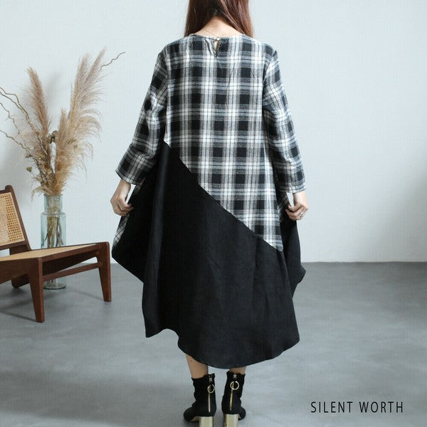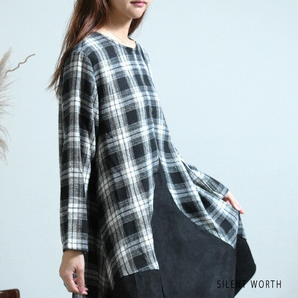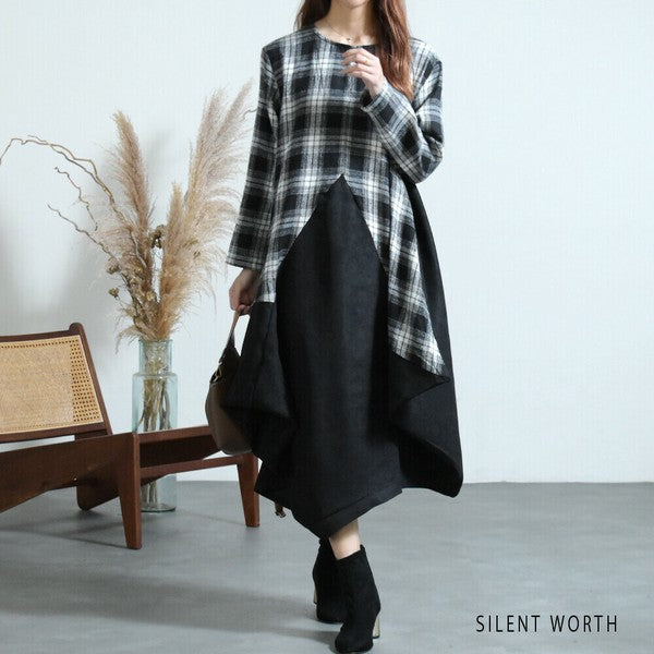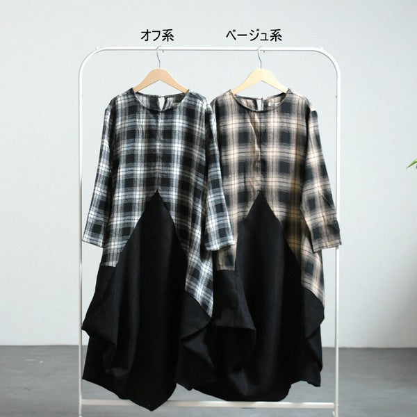 【Mサイズ】起毛チェック柄アシメ配色ワンピース|異素材切替・体型カバー・秋冬・Z-089