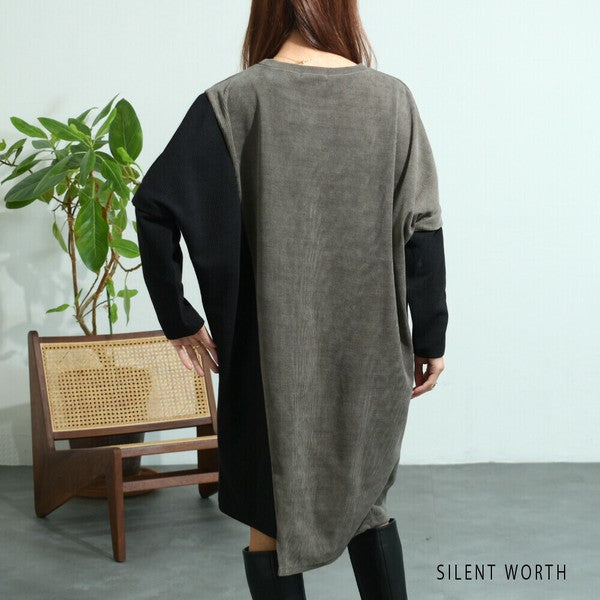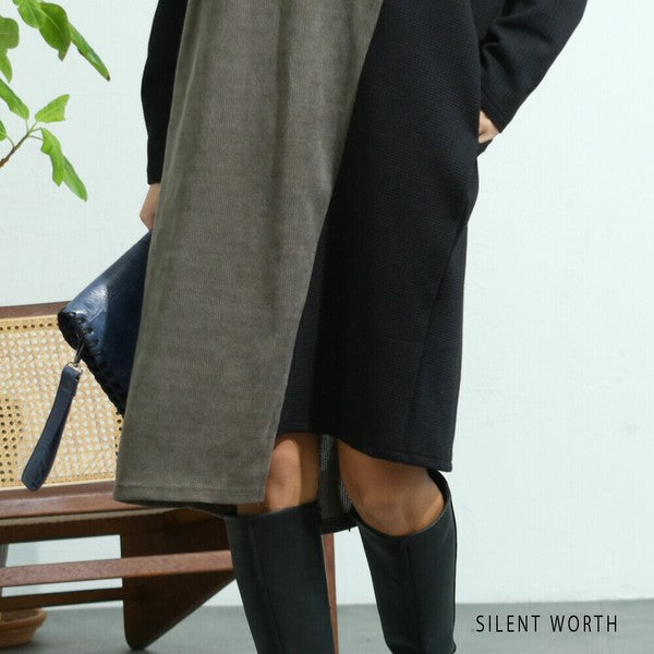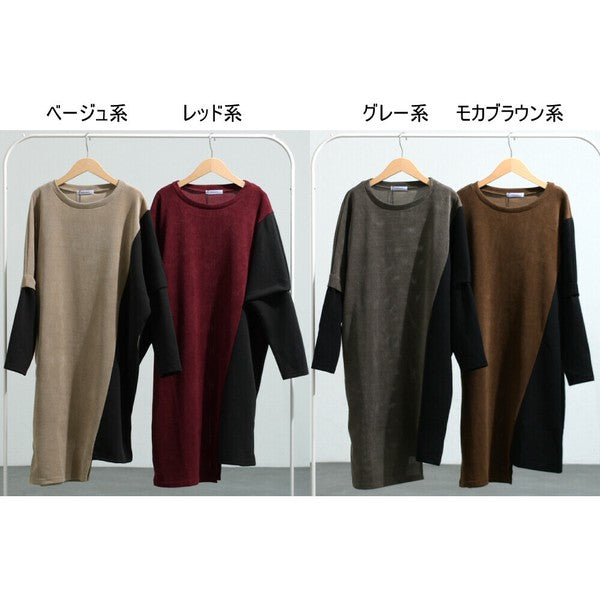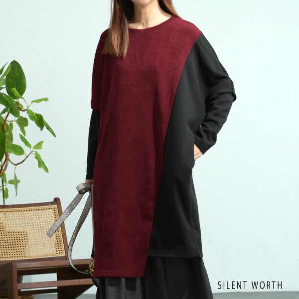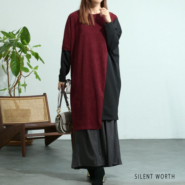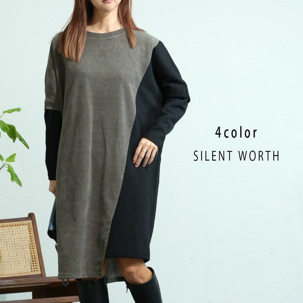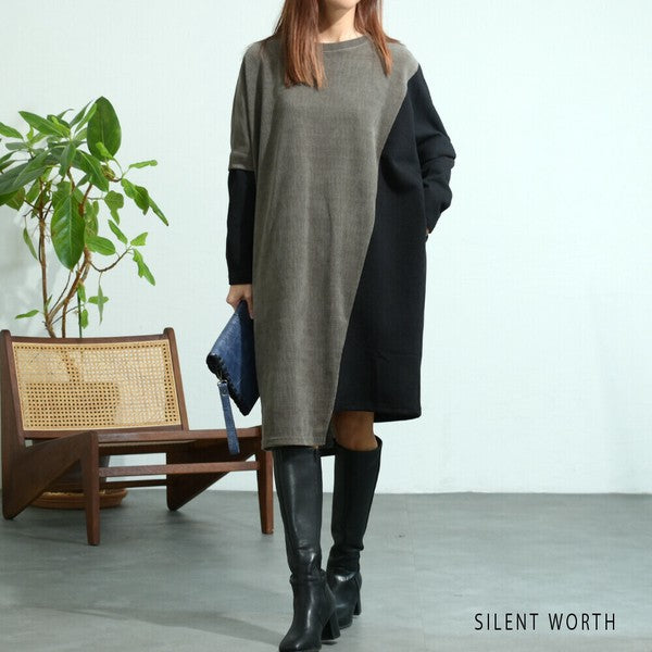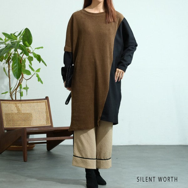 【M〜L】ジャカード異素材アシメ切替ワンピース|体型カバー・大人カジュアル・長袖・秋冬・Z-092