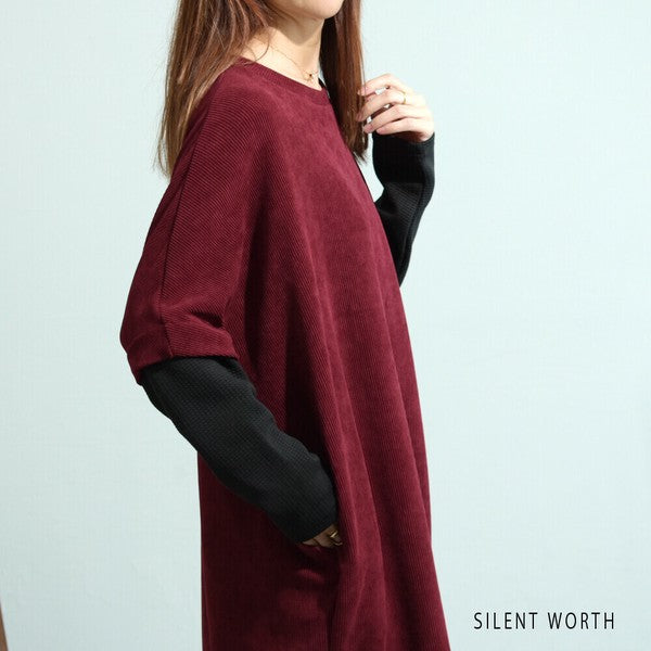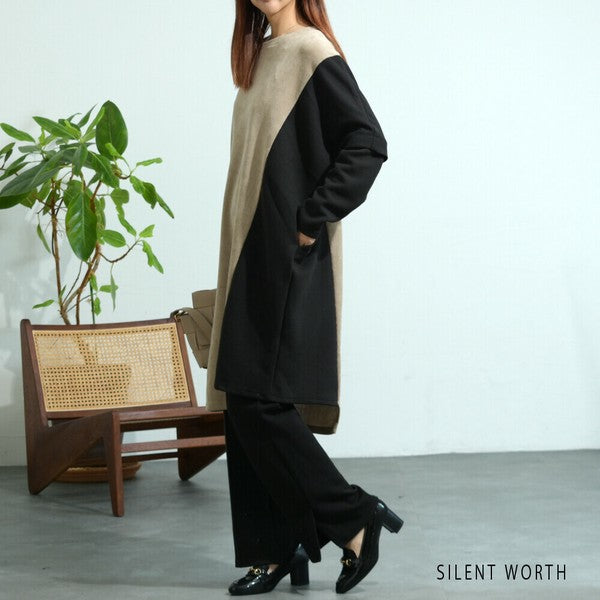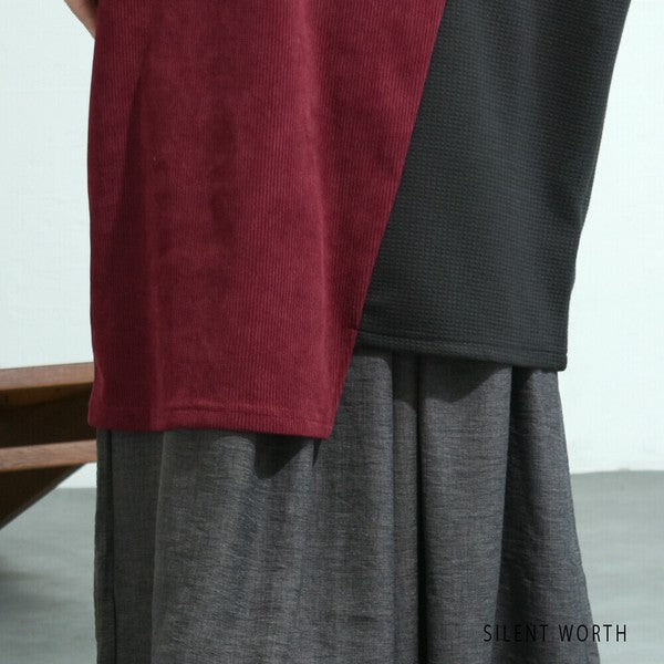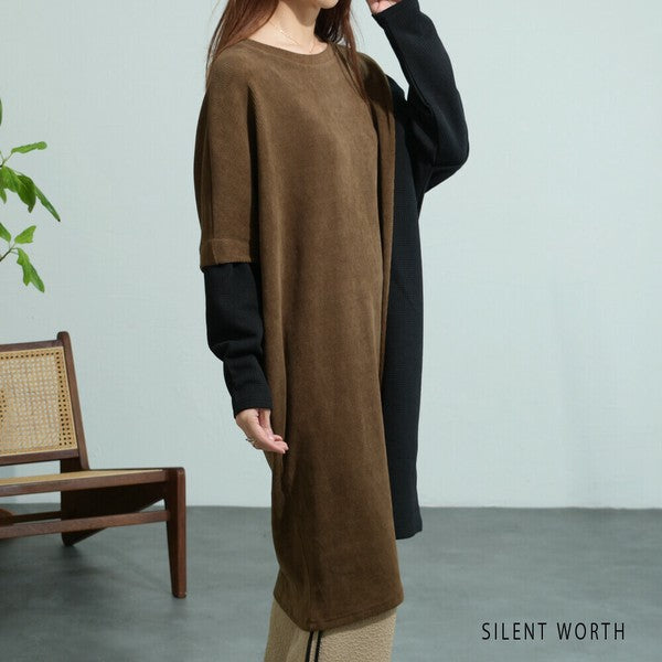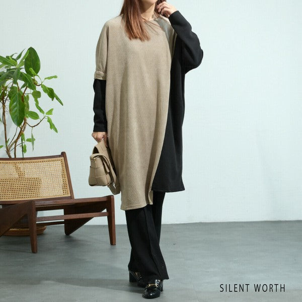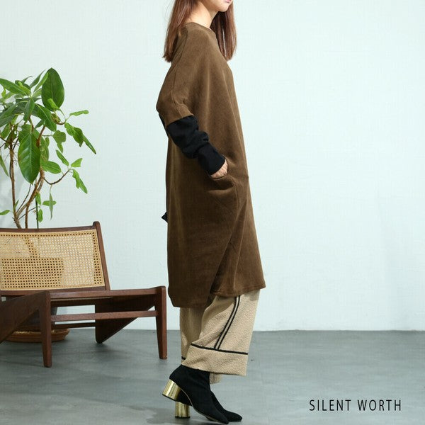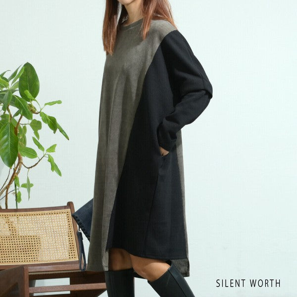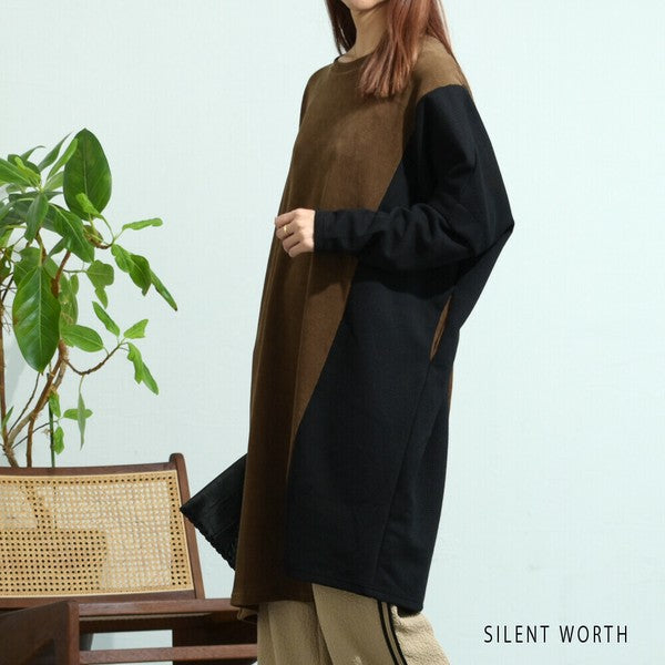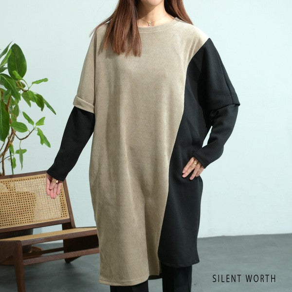 【M〜L】ジャカード異素材アシメ切替ワンピース|体型カバー・大人カジュアル・長袖・秋冬・Z-092