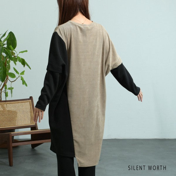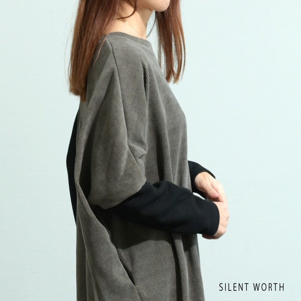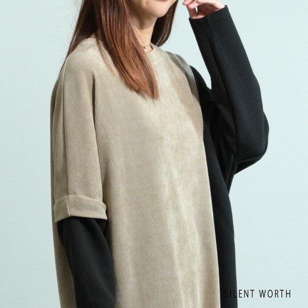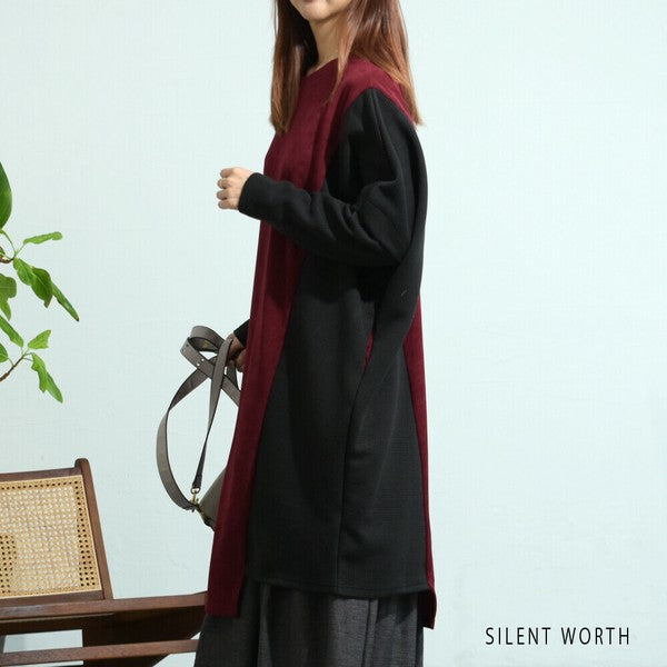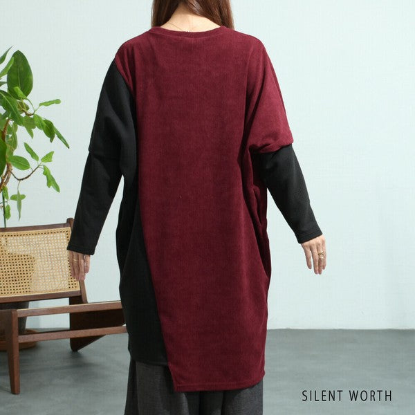 【M〜L】異素材配色デザイン アシメ切替プルオーバー|ゆったり体型カバー カジュアルトップス Z-094