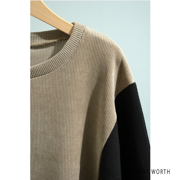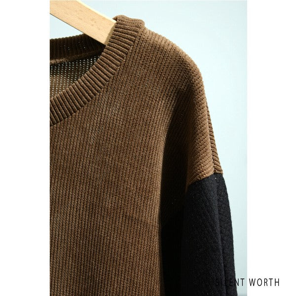 【Mサイズ】ふくれジャカード配色プルオーバー|異素材切替・体型カバー・長袖トップス・秋冬・Z-093