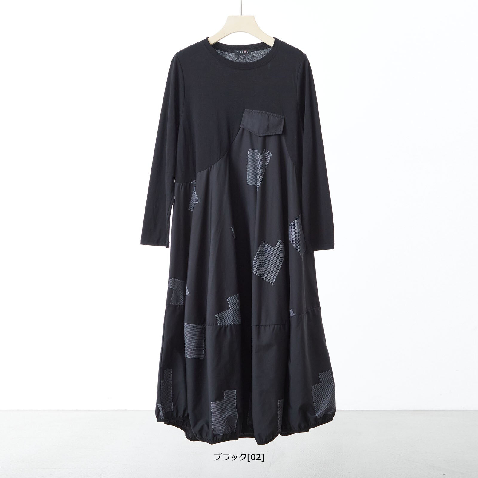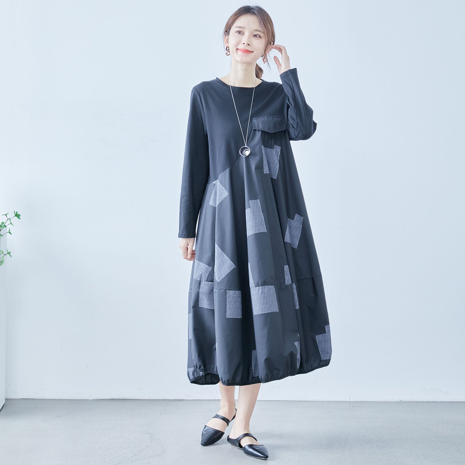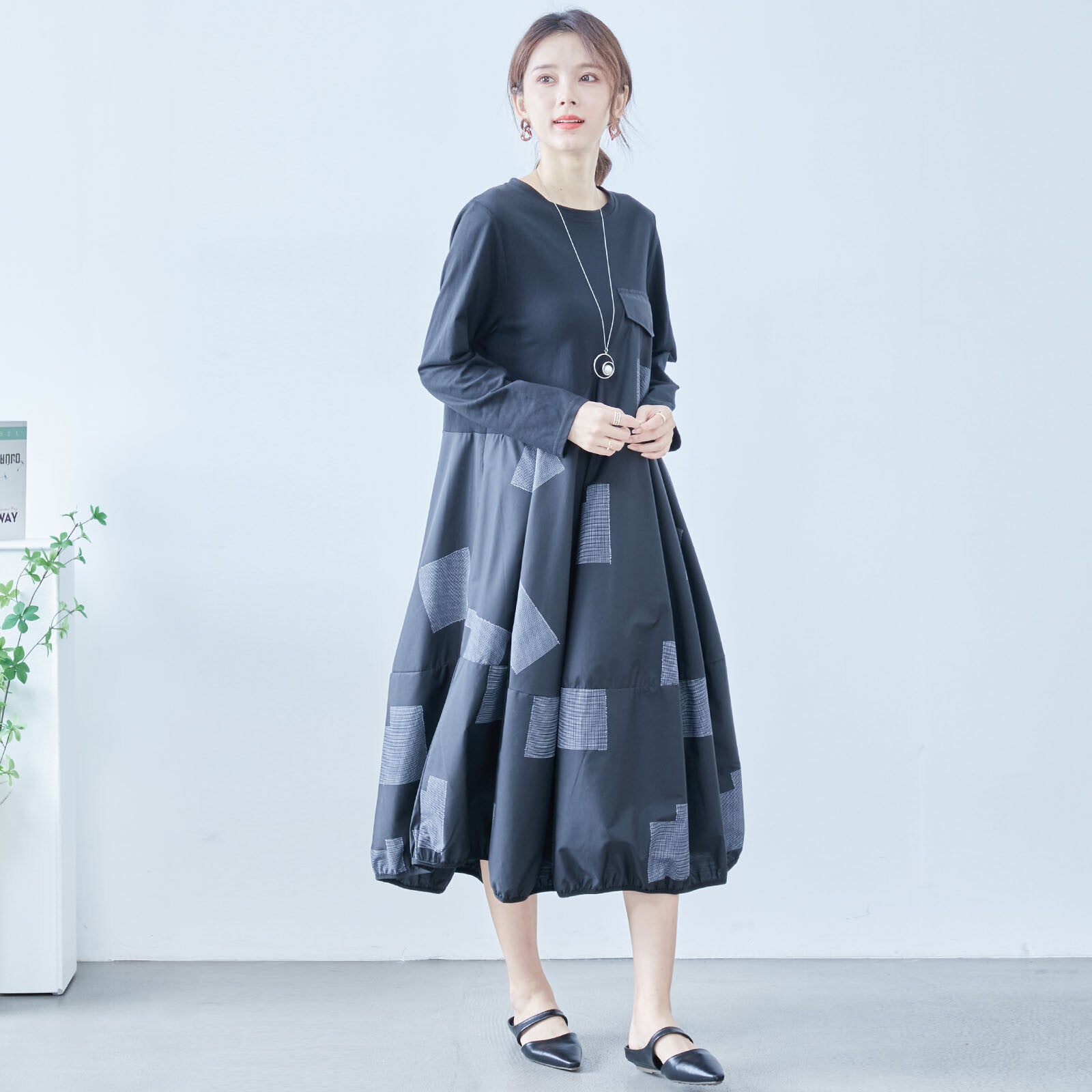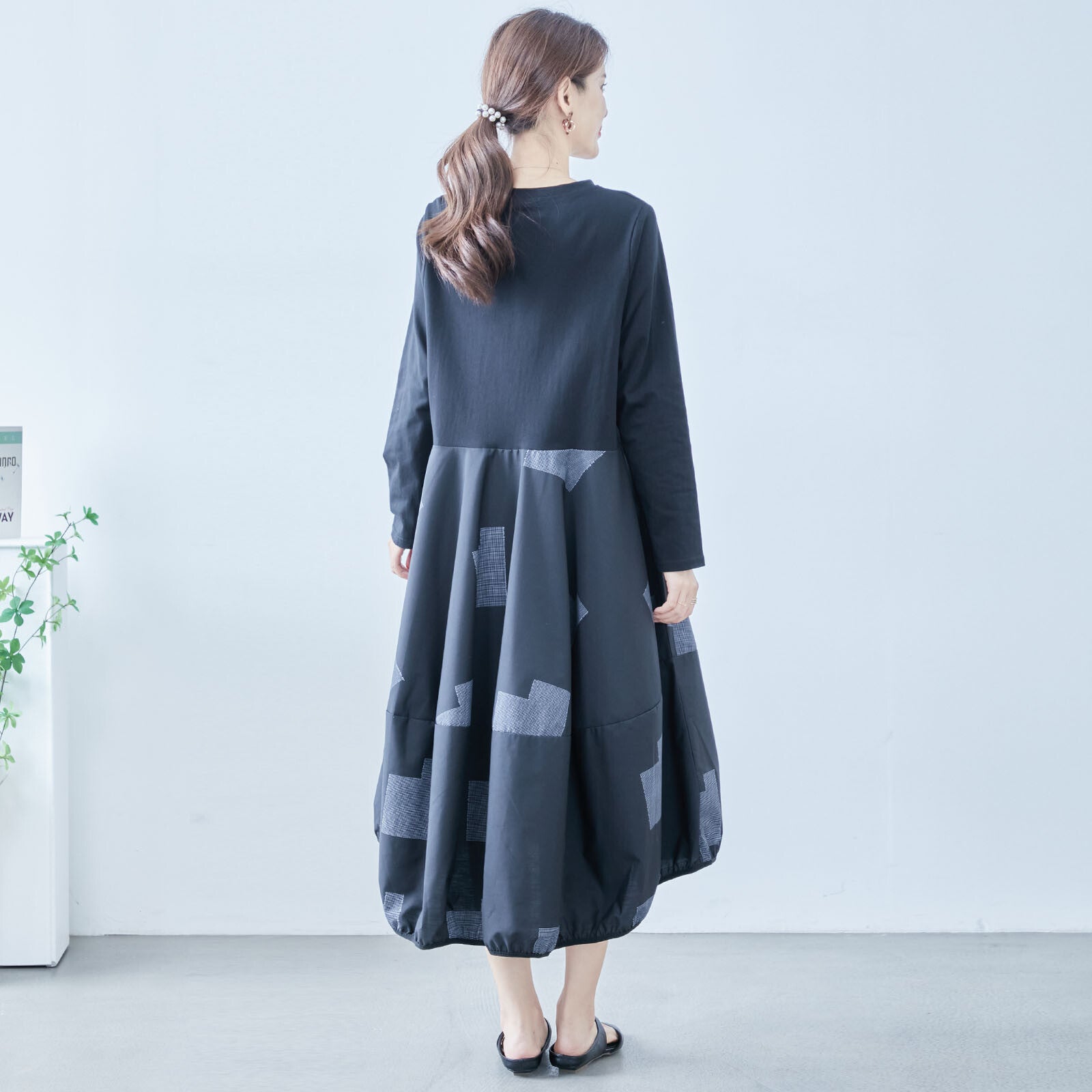 【L〜LL】異素材切替 バルーンシルエット ロングワンピース|モードデザイン・長袖・TRUBE・N83-036A