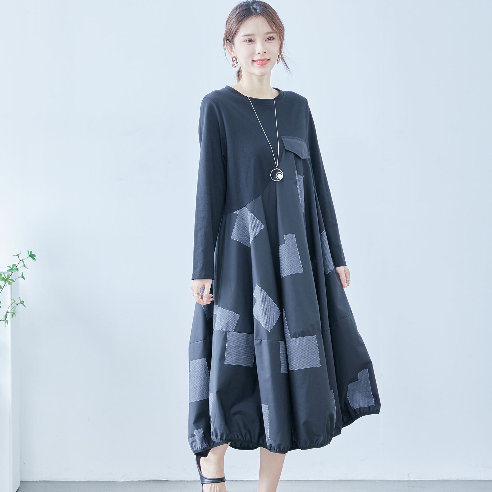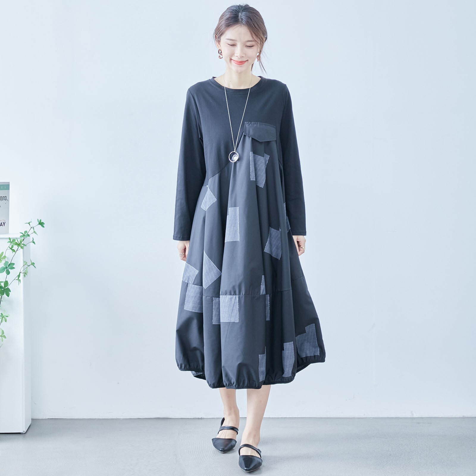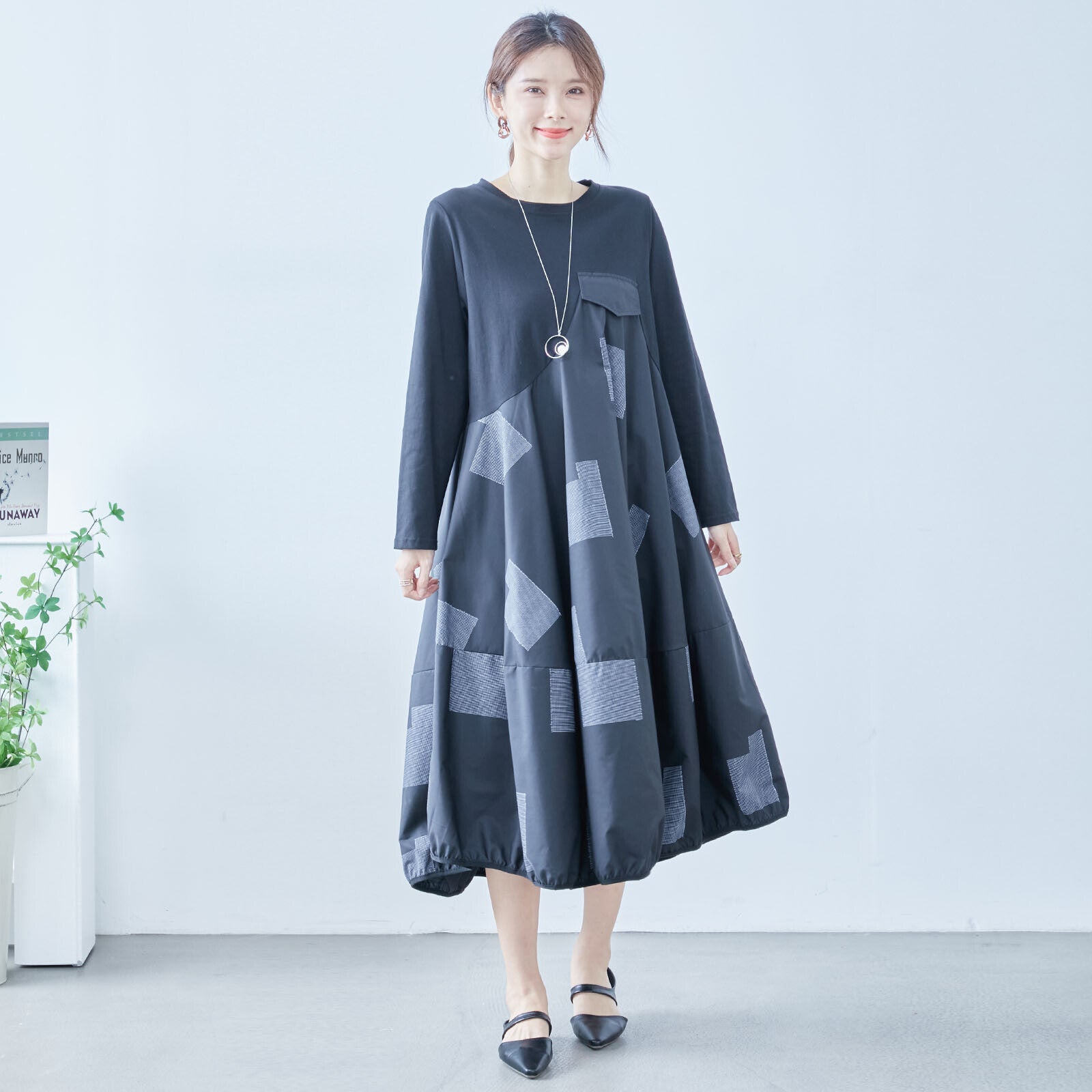 【L〜LL】異素材切替 バルーンシルエット ロングワンピース|モードデザイン・長袖・TRUBE・N83-036A