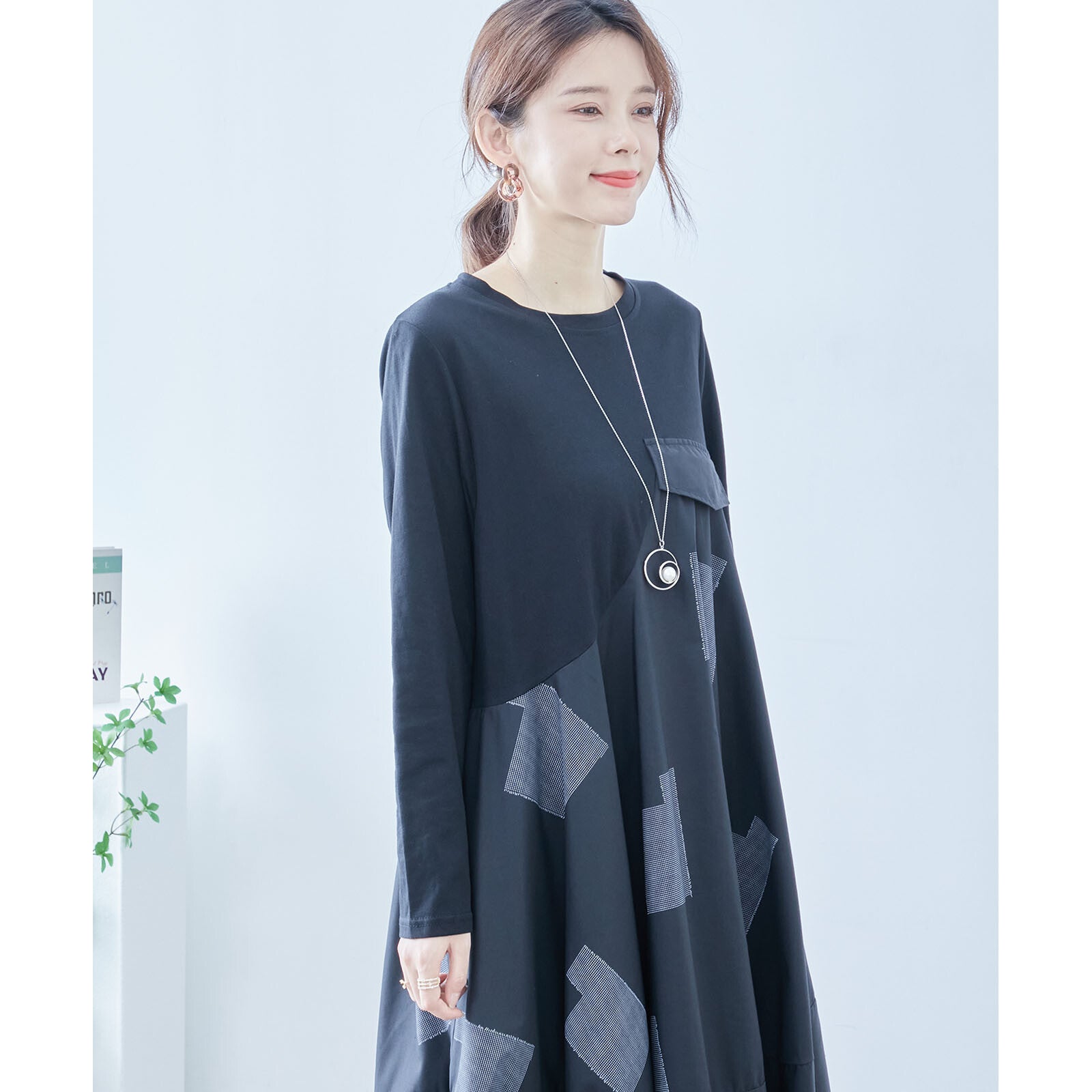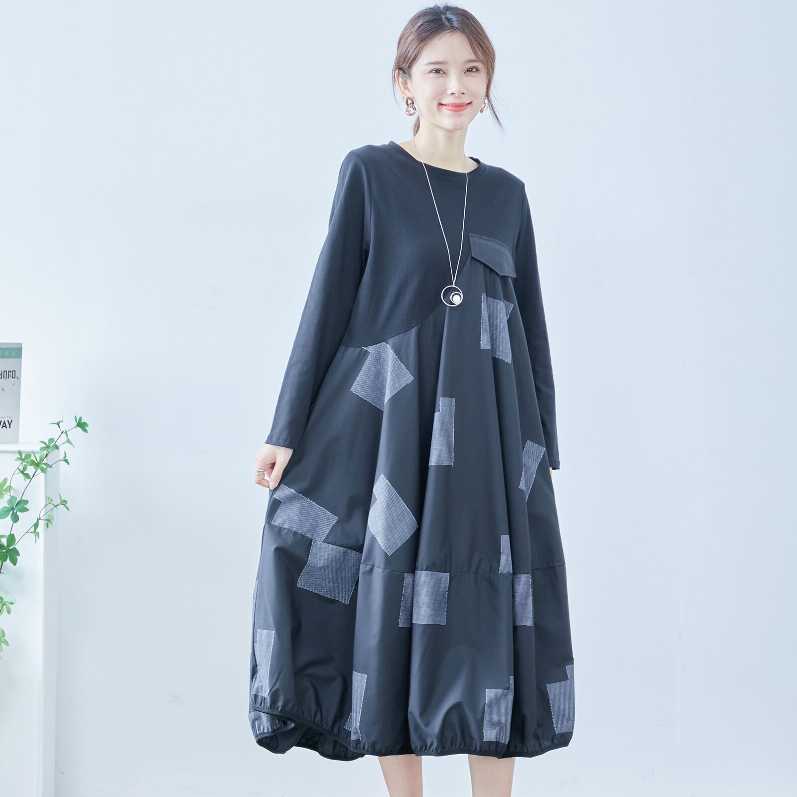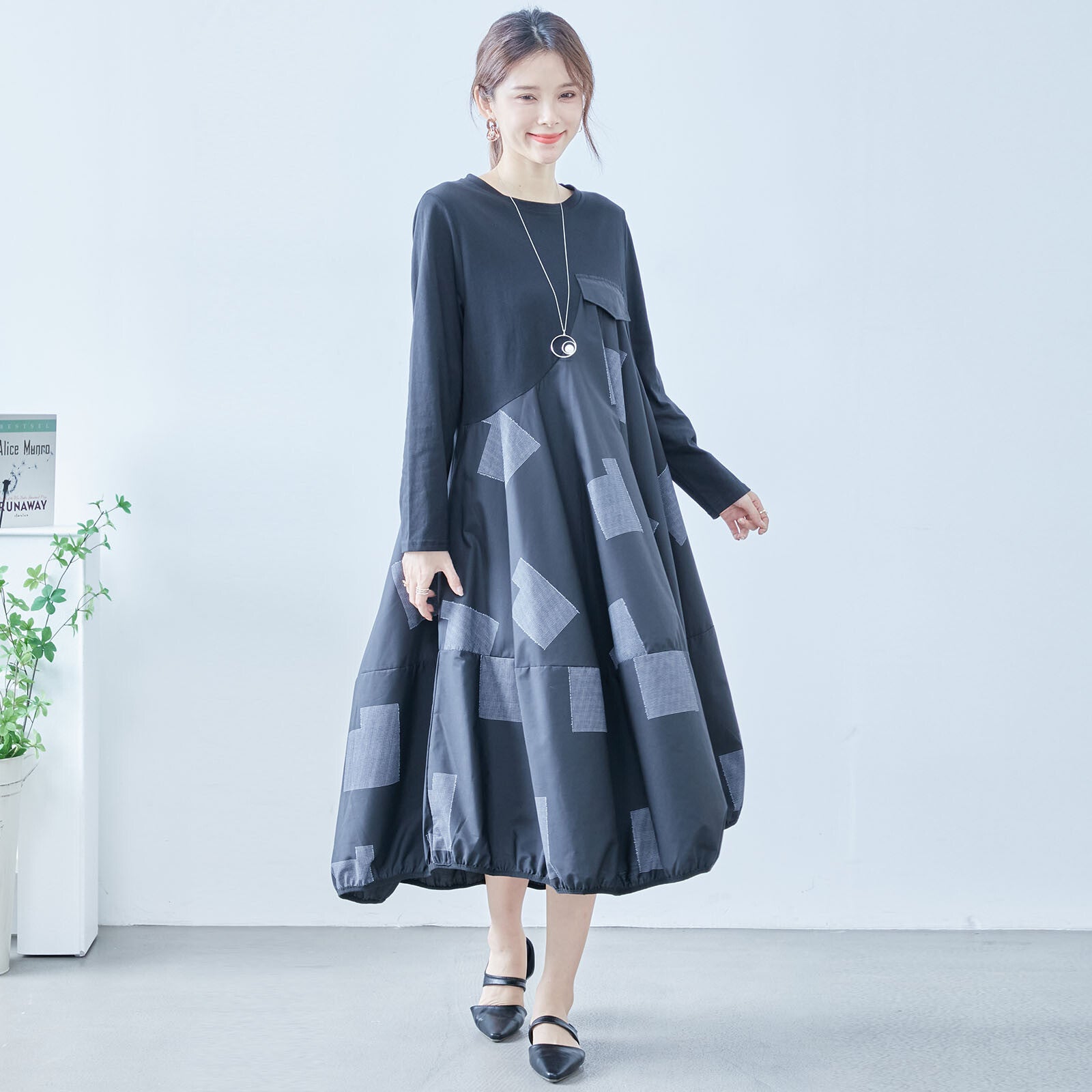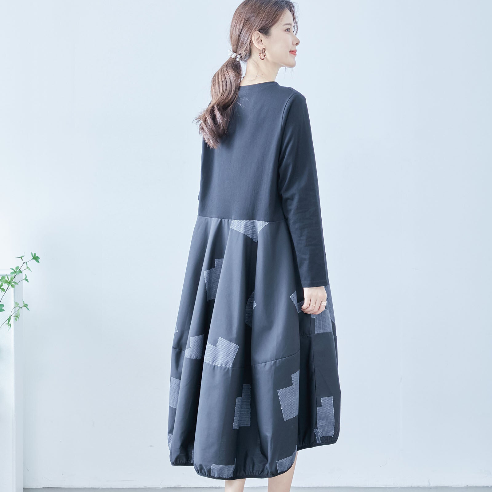 【L〜LL】異素材切替 バルーンシルエット ロングワンピース|モードデザイン・長袖・TRUBE・N83-036A