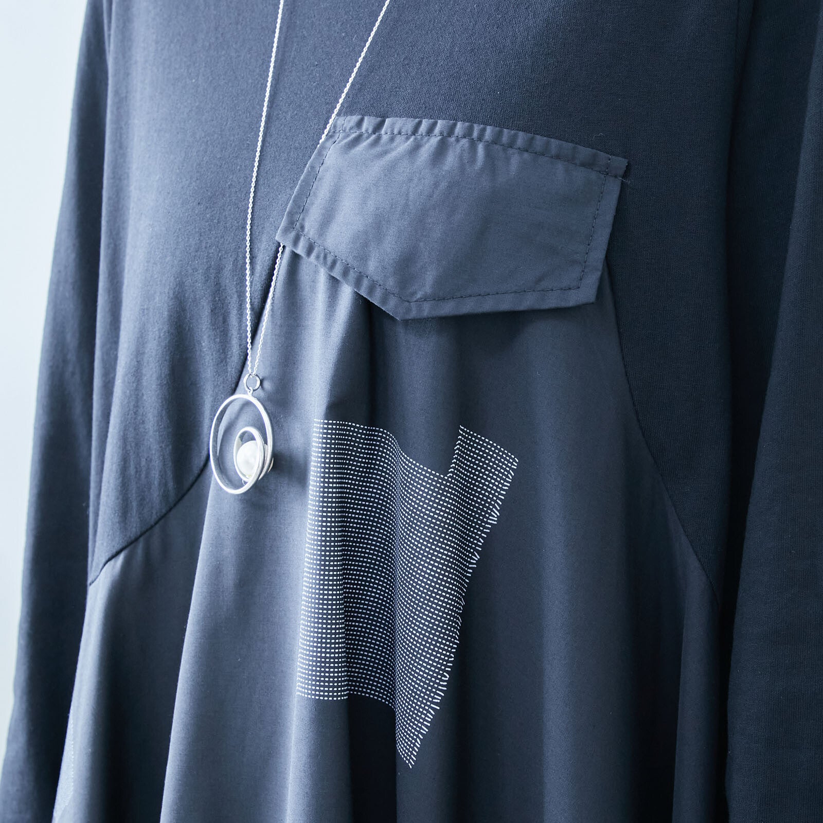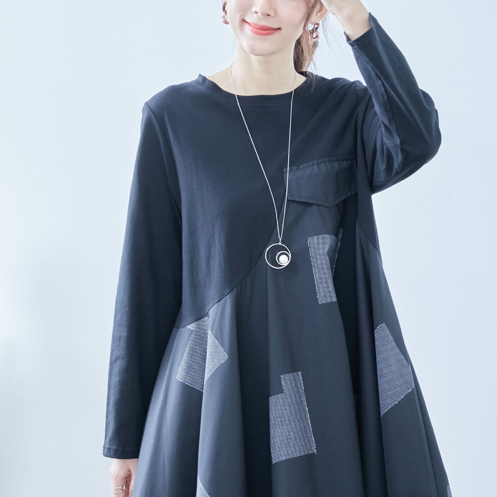 モード感漂う異素材切り替えのバルーンワンピース。無地×柄の絶妙なコンビネーションで、シンプルながら個性を感じさせる一枚に仕上げました。胸元の斜めカットラインが全体にアクセントを加え、たっぷりと生地を使用したふんわりバルーンシルエットで優雅な印象に。7分袖デザインでロングシーズン活躍。無地部分にはストレッチ性もあり、見た目だけでなく快適さも兼ね備えています。スニーカーやパンプスと合わせて、きれいめカジュアルスタイルをお楽しみください。