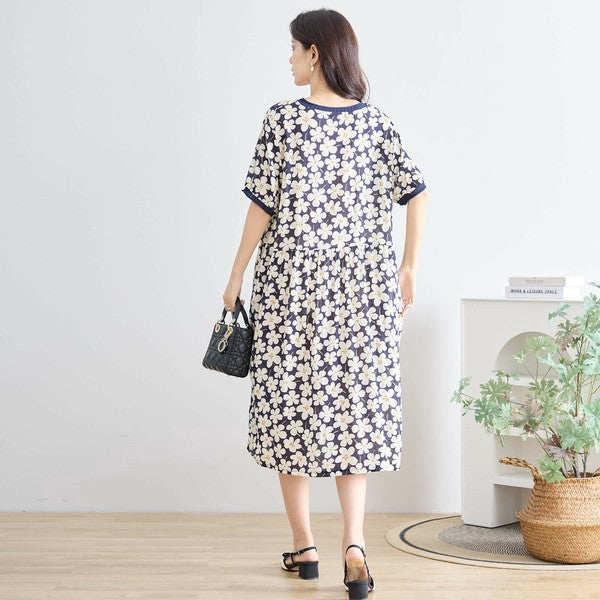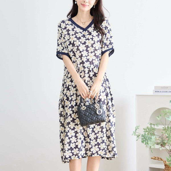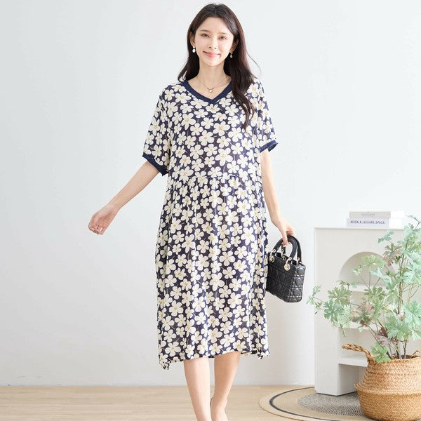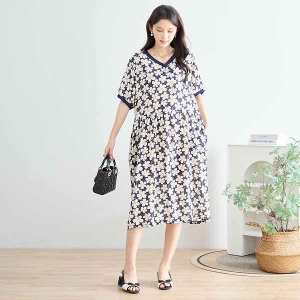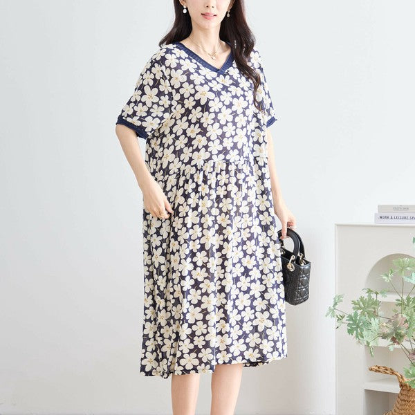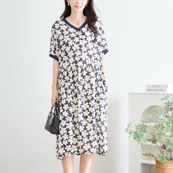 【M〜L】綿100% 花柄コットンワンピース Vネック 半袖 ゆったり 体型カバー N82-362