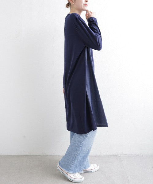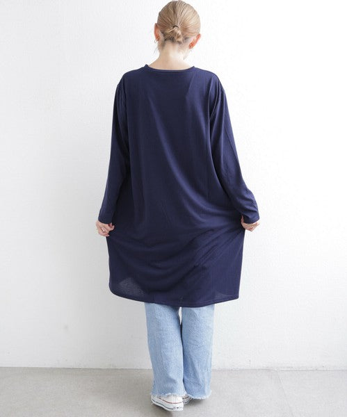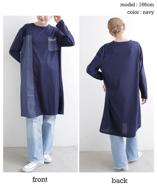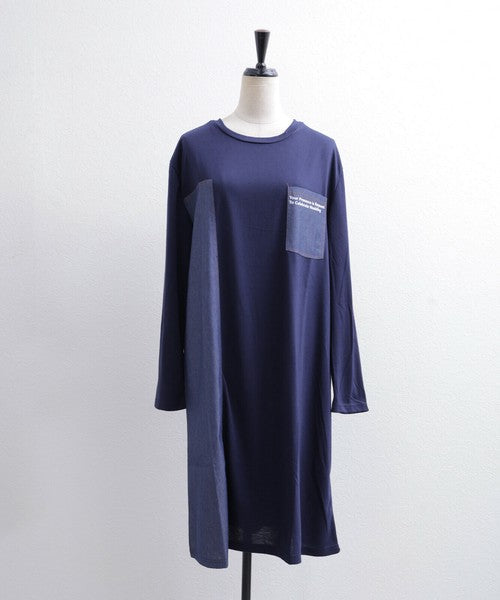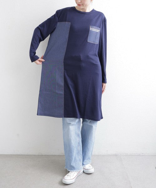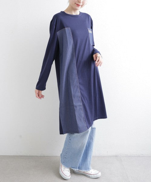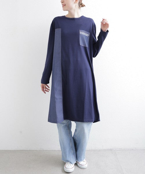 胸元ポケットと縦ラインのデニム切替が印象的なワンピース。カジュアルな中にも洗練された雰囲気を持ち、デイリー使いはもちろん、お出かけにもぴったり。柔らかな生地感で軽やかに着こなせ、季節を問わず長く愛用いただける1枚です。デニムパンツやレギンスとレイヤードすれば大人の抜け感スタイルが完成します。