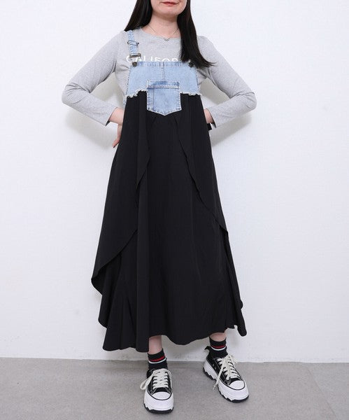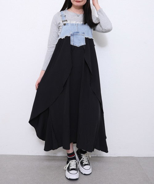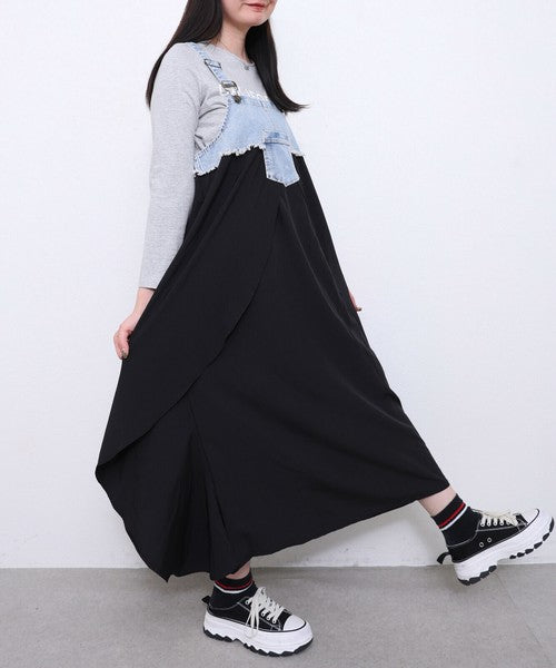【M〜L】デニム切替シフォンジャンパースカート|ふんわり軽やか・体型カバー◎・秋冬新作|Chou Chou 196364