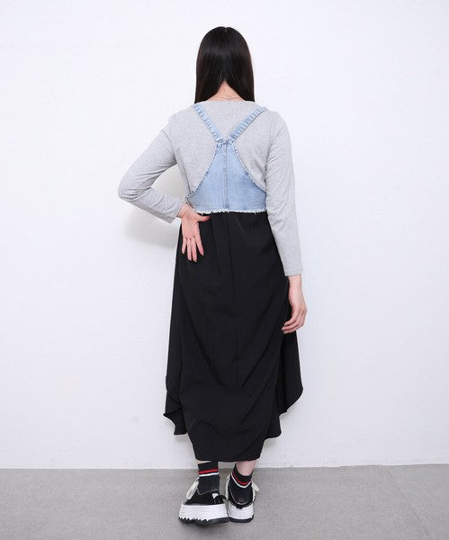 デニムビスチェ風デザインがアクセントになったジャンパースカート。