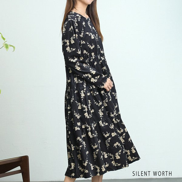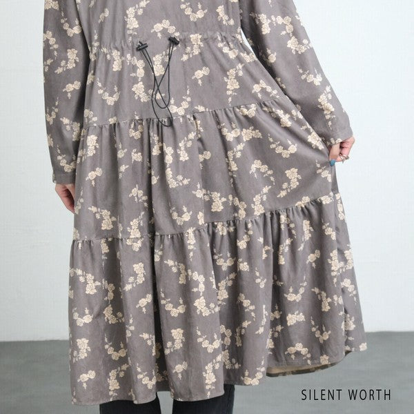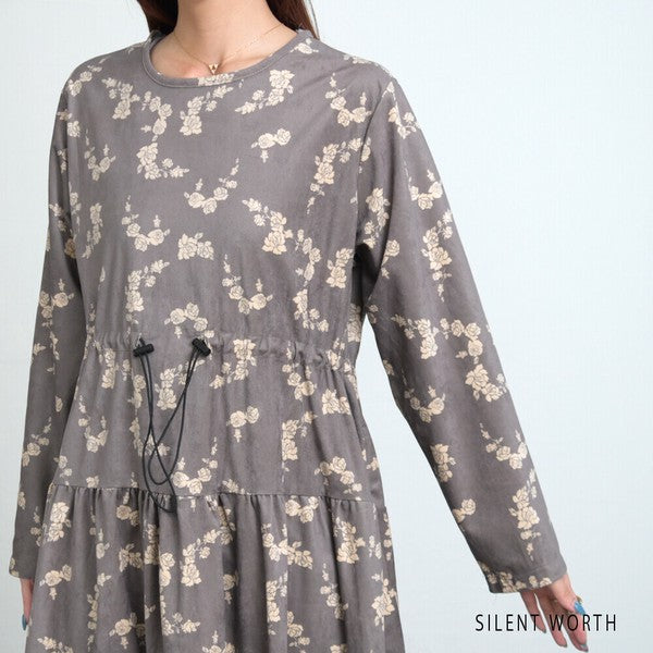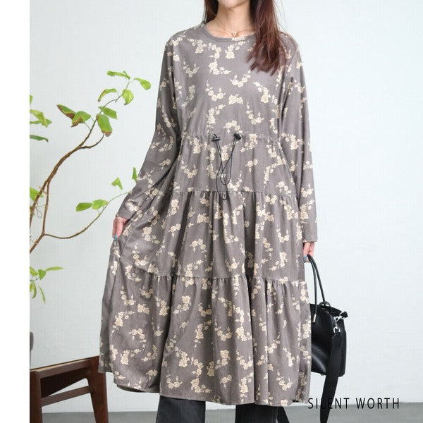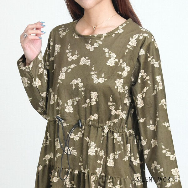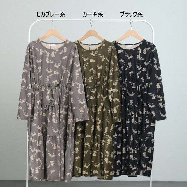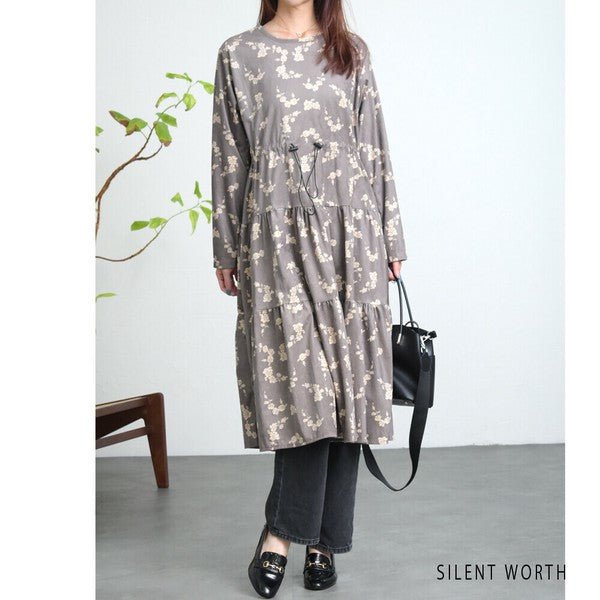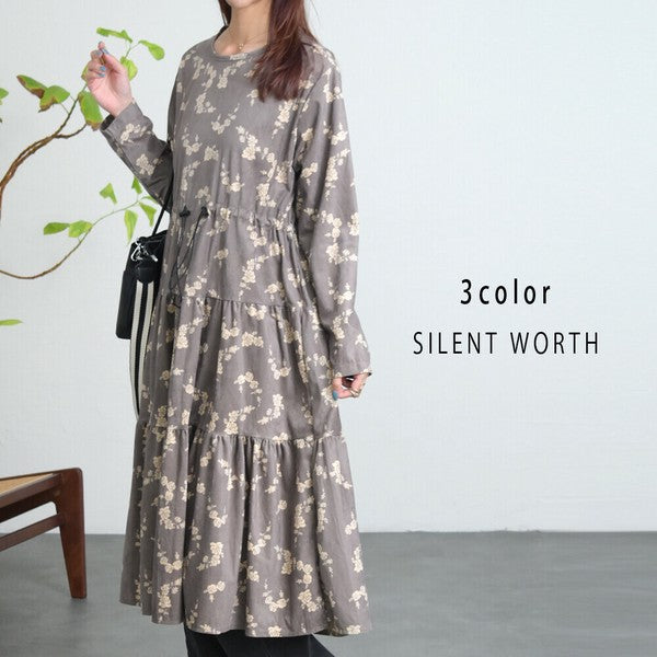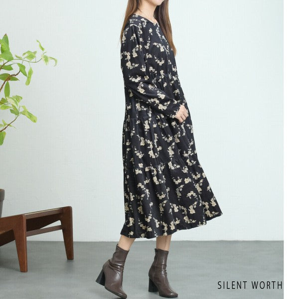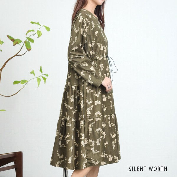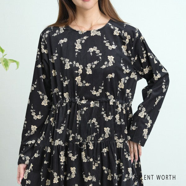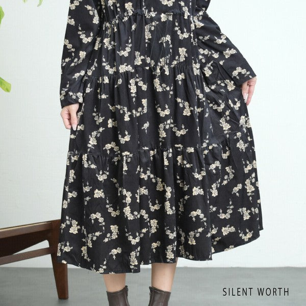 【Mサイズ】花柄ティアードワンピース|ベロア調素材・ウエストシャーリング仕様・長袖・秋冬・N-3004