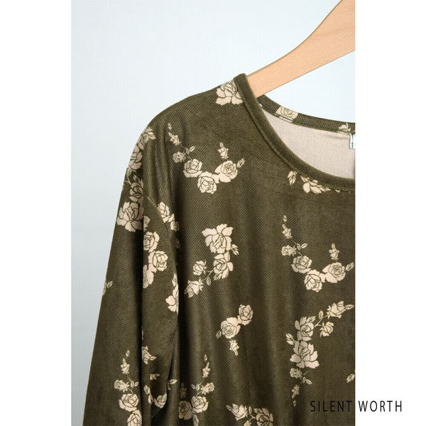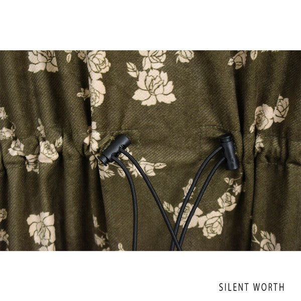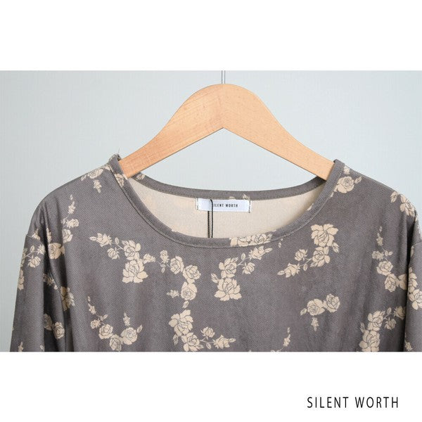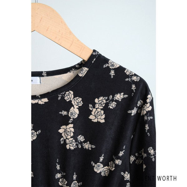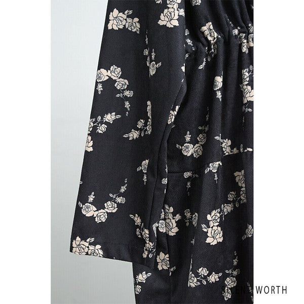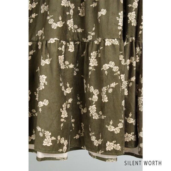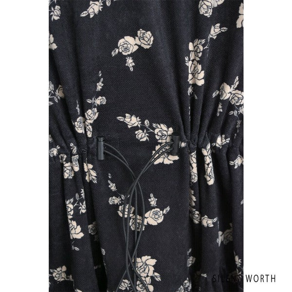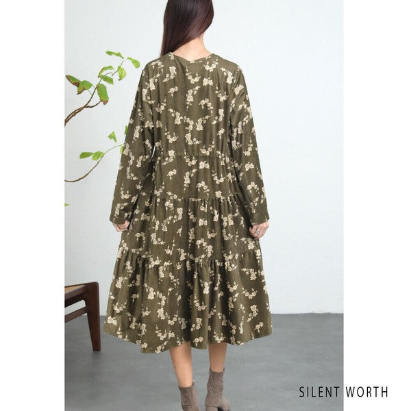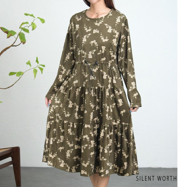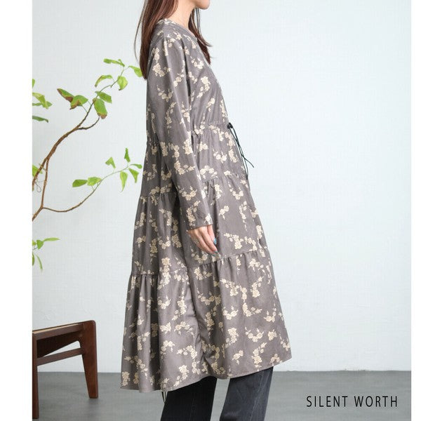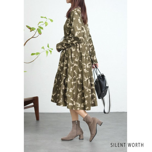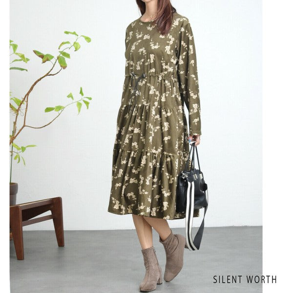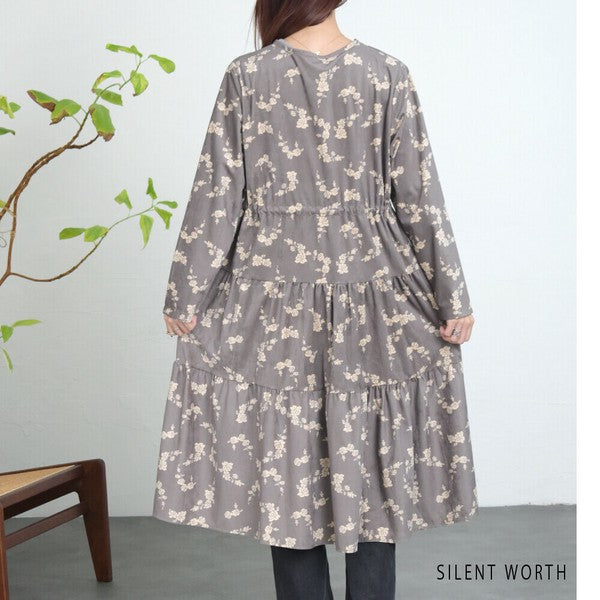 【Mサイズ】花柄ティアードワンピース|ベロア調素材・ウエストシャーリング仕様・長袖・秋冬・N-3004