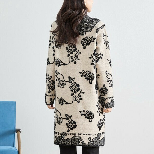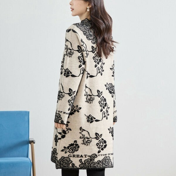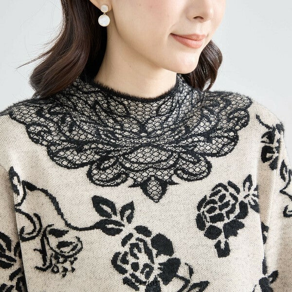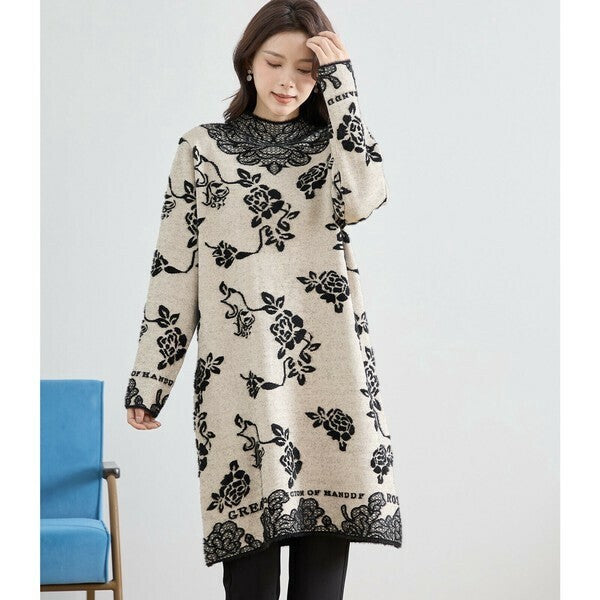 【M〜L】エレガントフラワージャガードニットワンピース|上品レース風ディテール・厚手素材・秋冬・TRUBE R38-303A