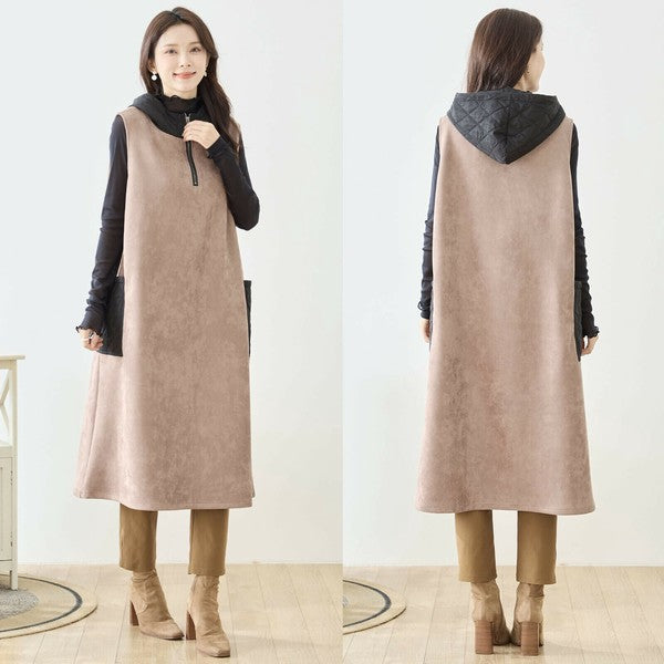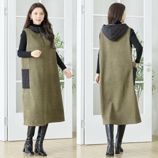 上品なスエード調素材とキルティングフードを組み合わせた、大人のジャンパースカートワンピース。
