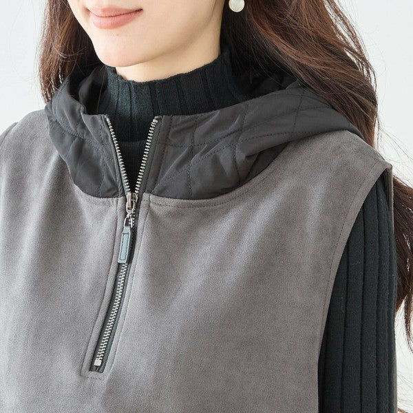・スエードタッチ素材とキルティングフードの異素材切替がポイント