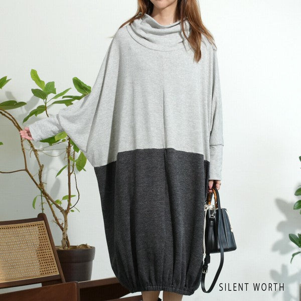 【Fサイズ】裾ギャザー異素材切替ワンピース|ゆったり体型カバー・ドレープシルエット・SILENT WORTH N-2915