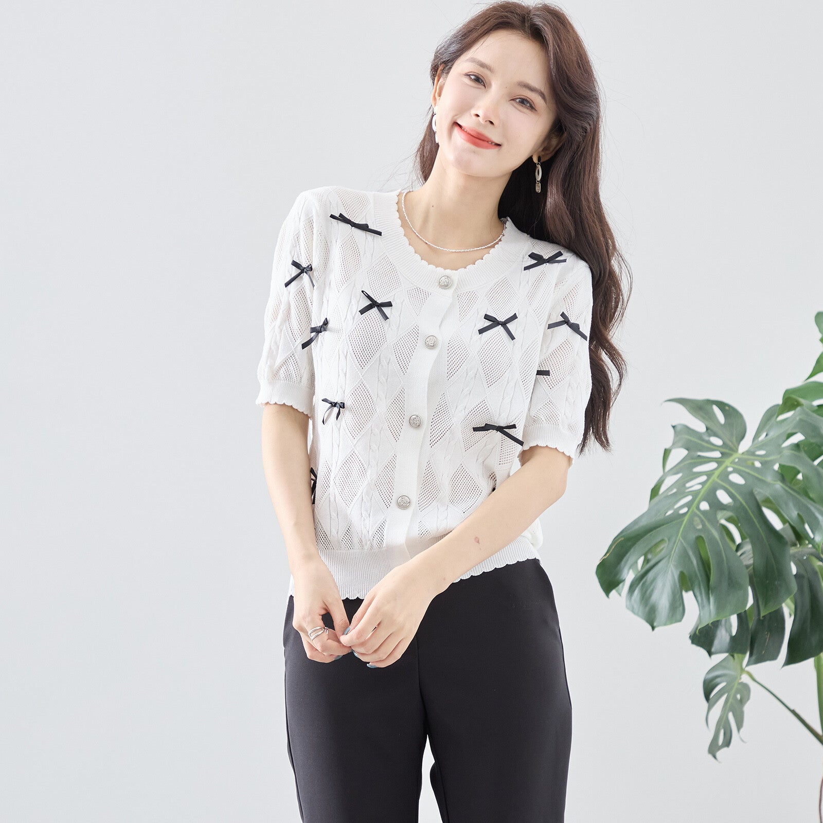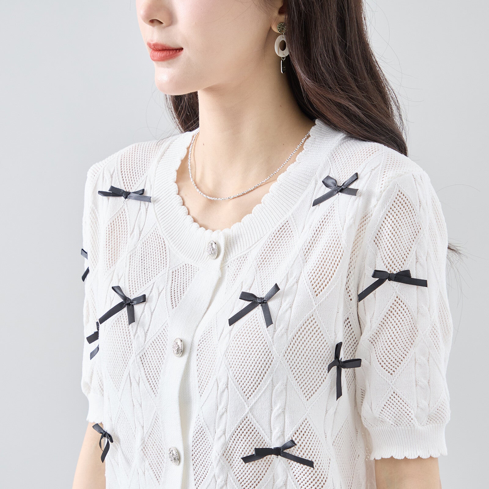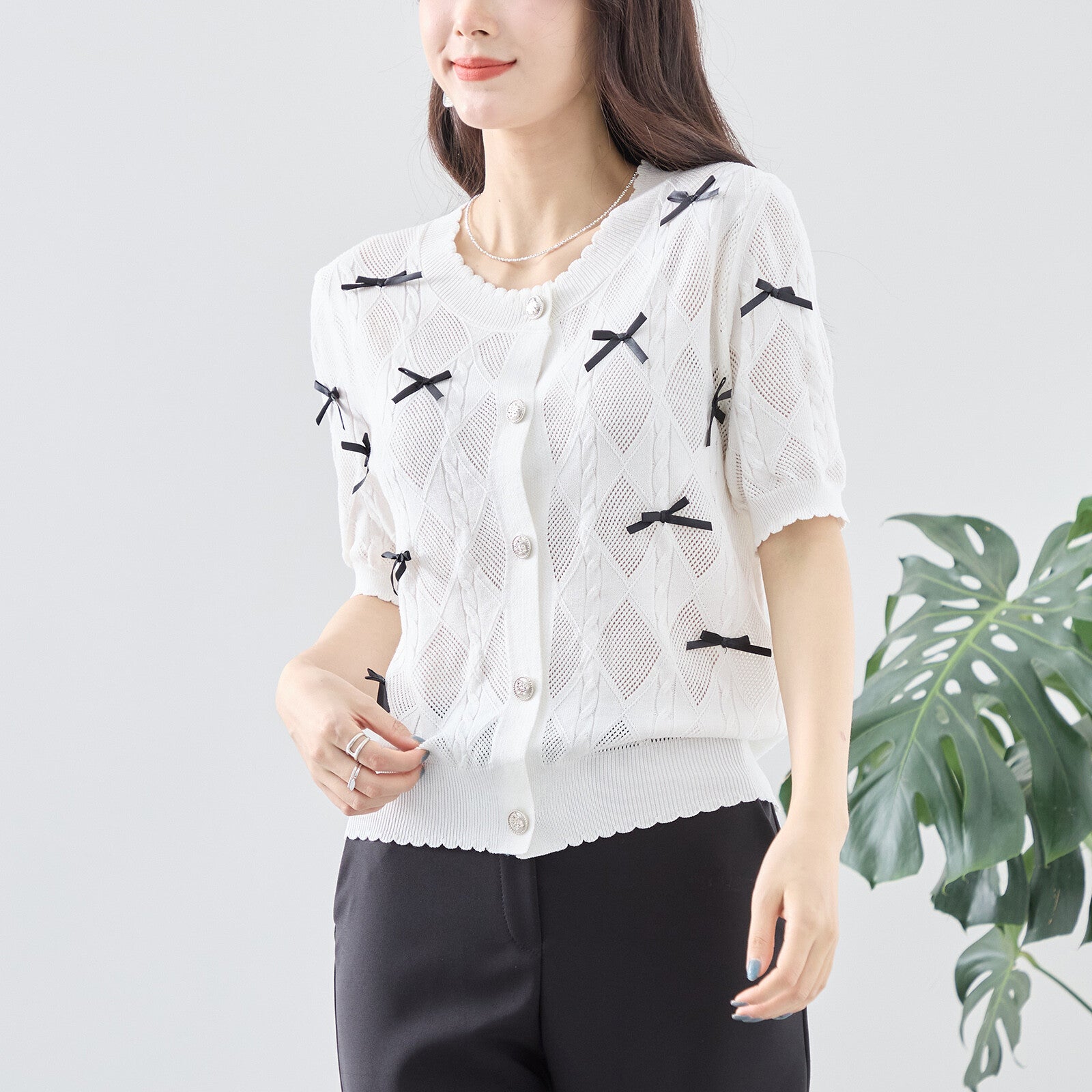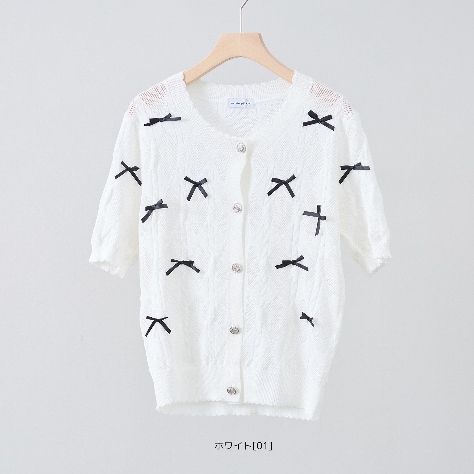 M〜L リボン付きサマーニットカーディガン|前開き 半袖 レディース きれいめ 大人可愛い トップス