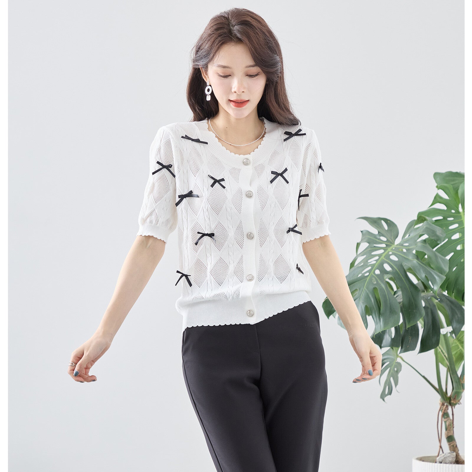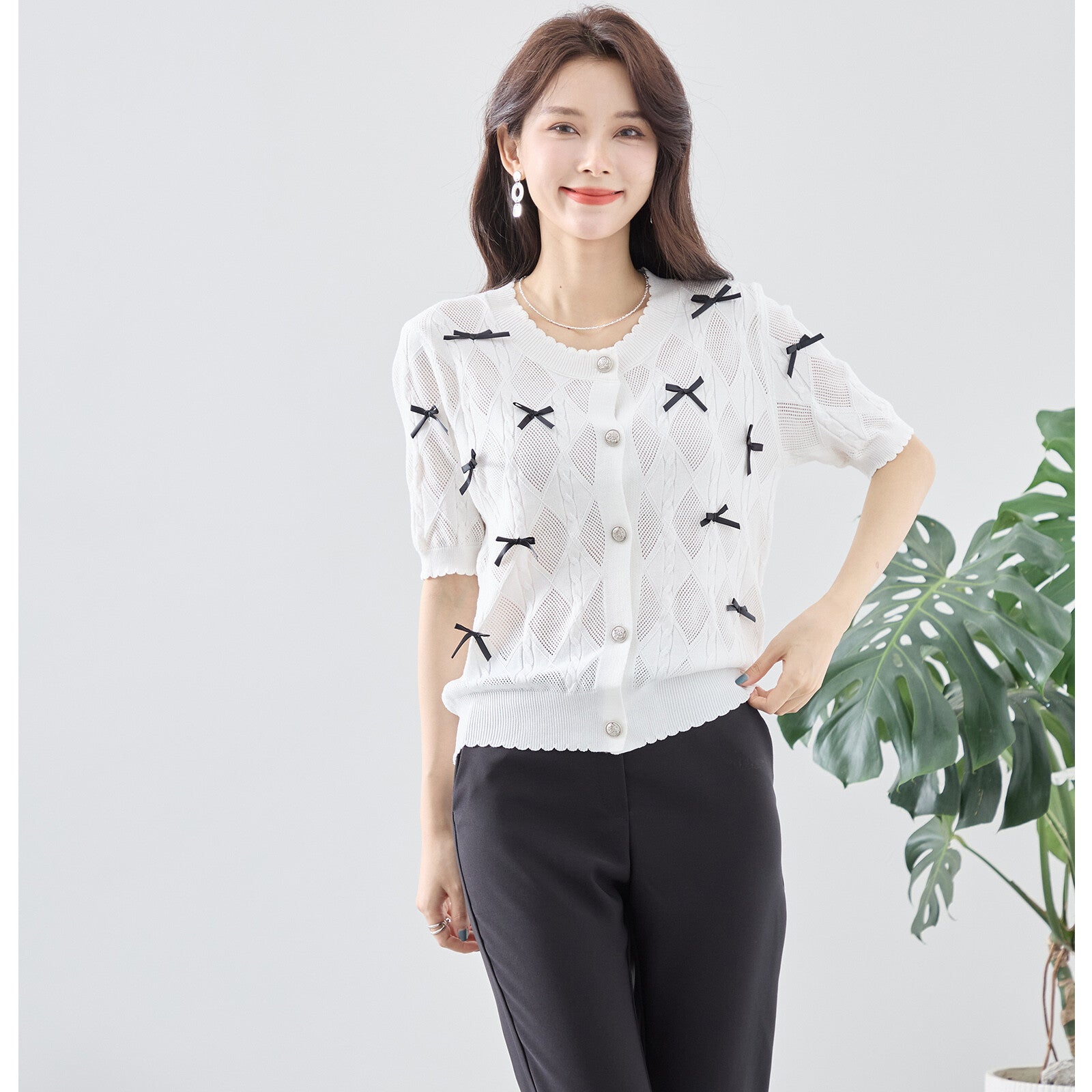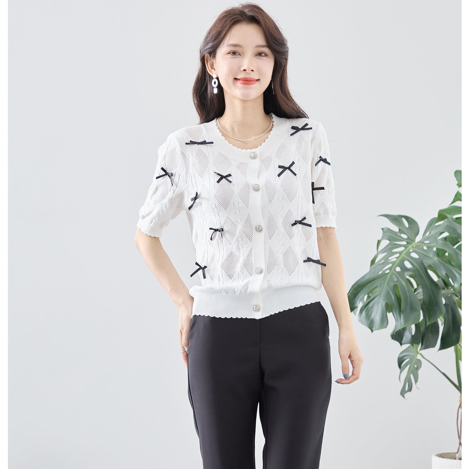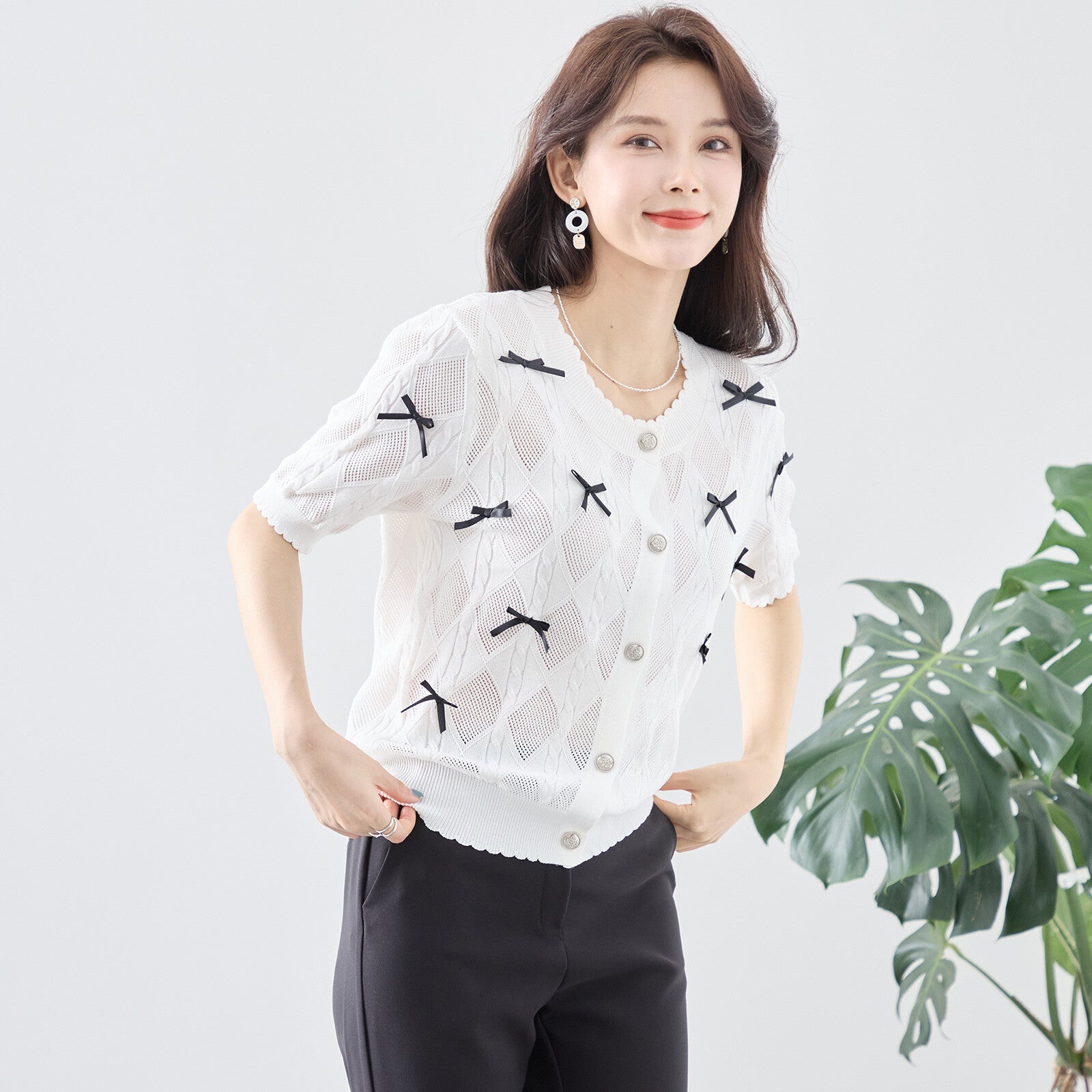 M〜L リボン付きサマーニットカーディガン|前開き 半袖 レディース きれいめ 大人可愛い トップス