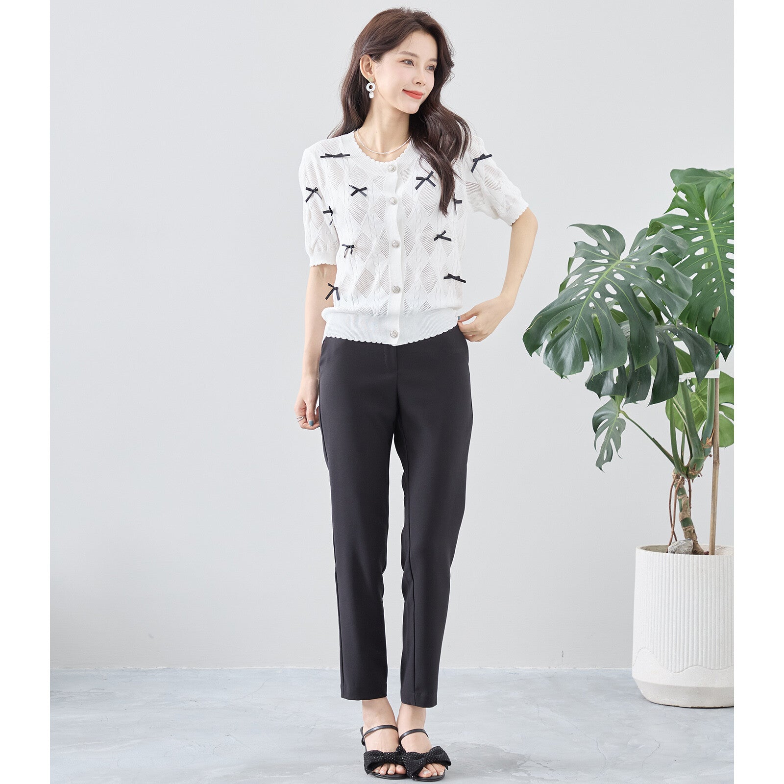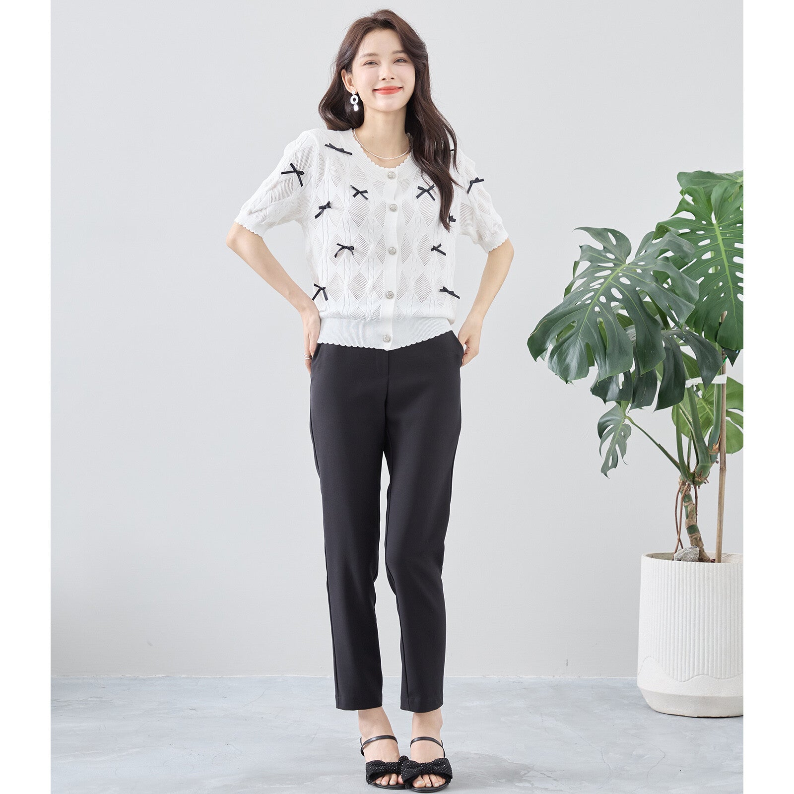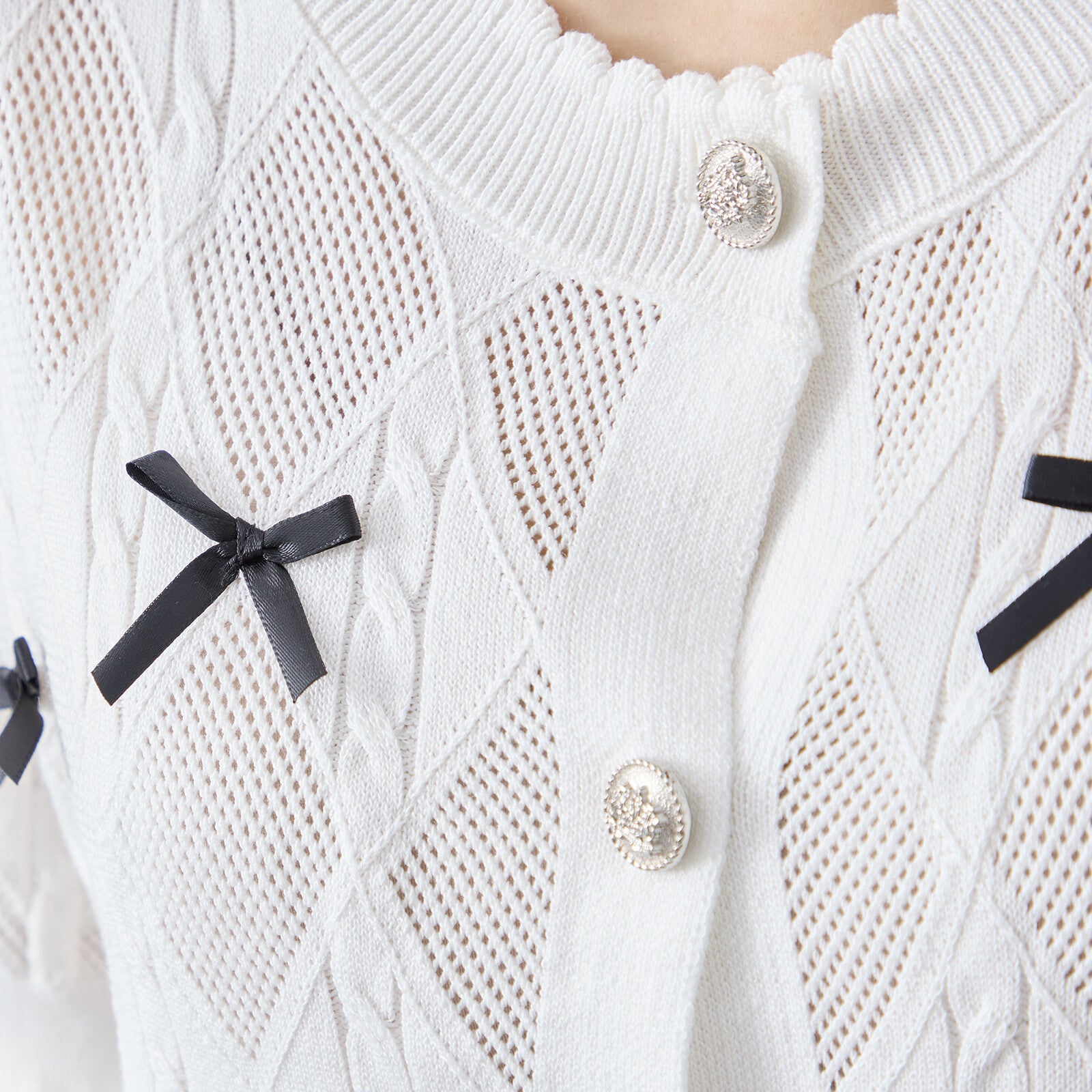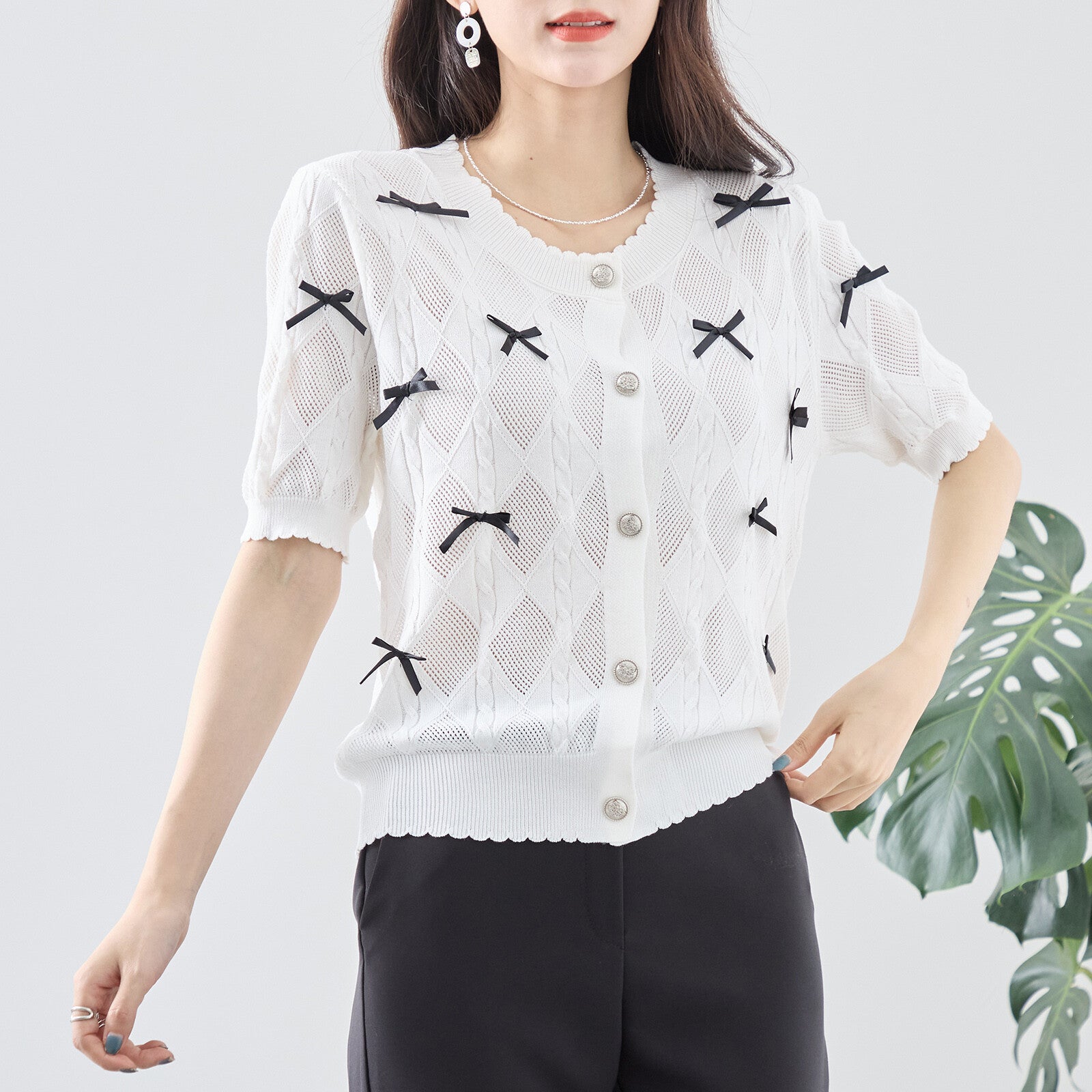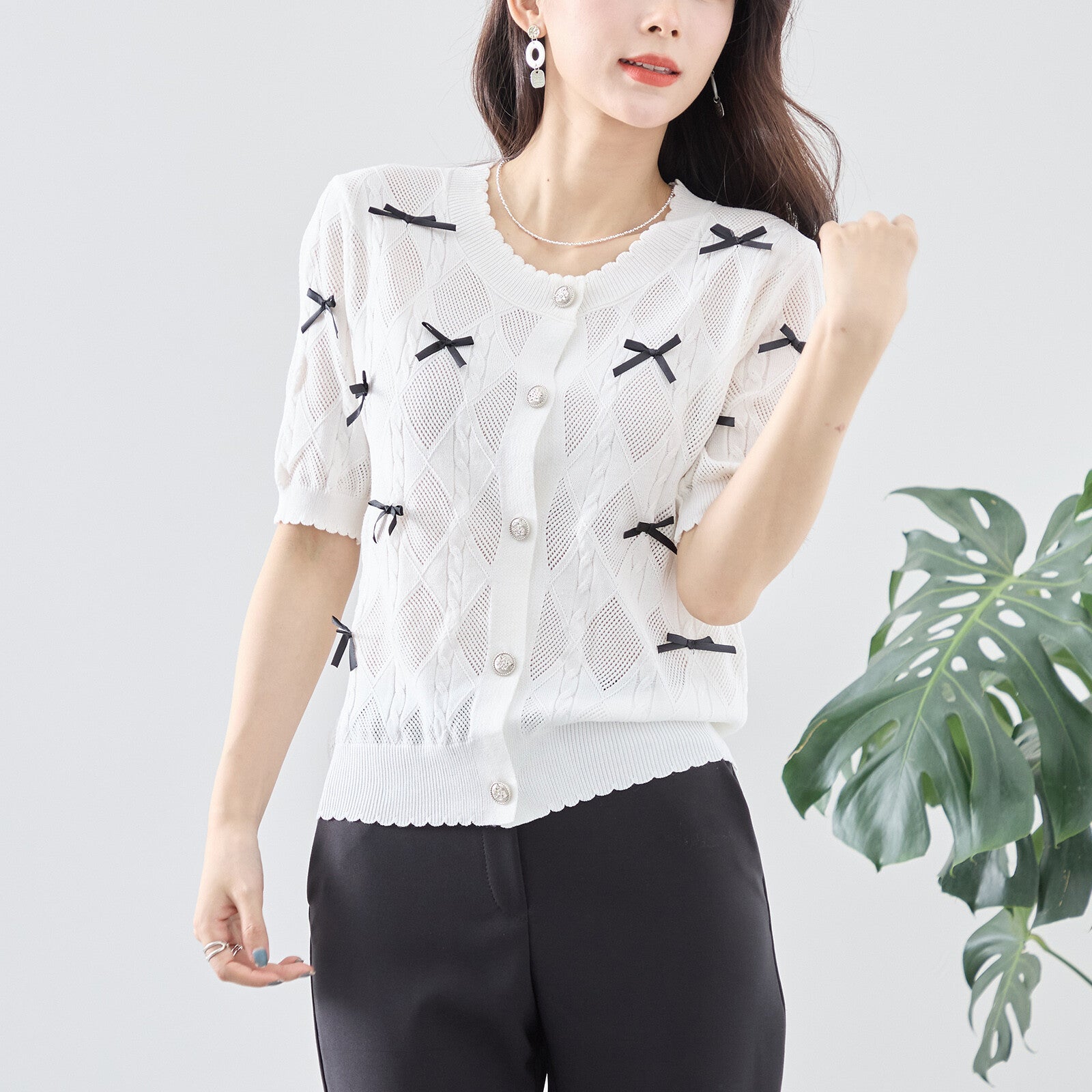 M〜L リボン付きサマーニットカーディガン|前開き 半袖 レディース きれいめ 大人可愛い トップス