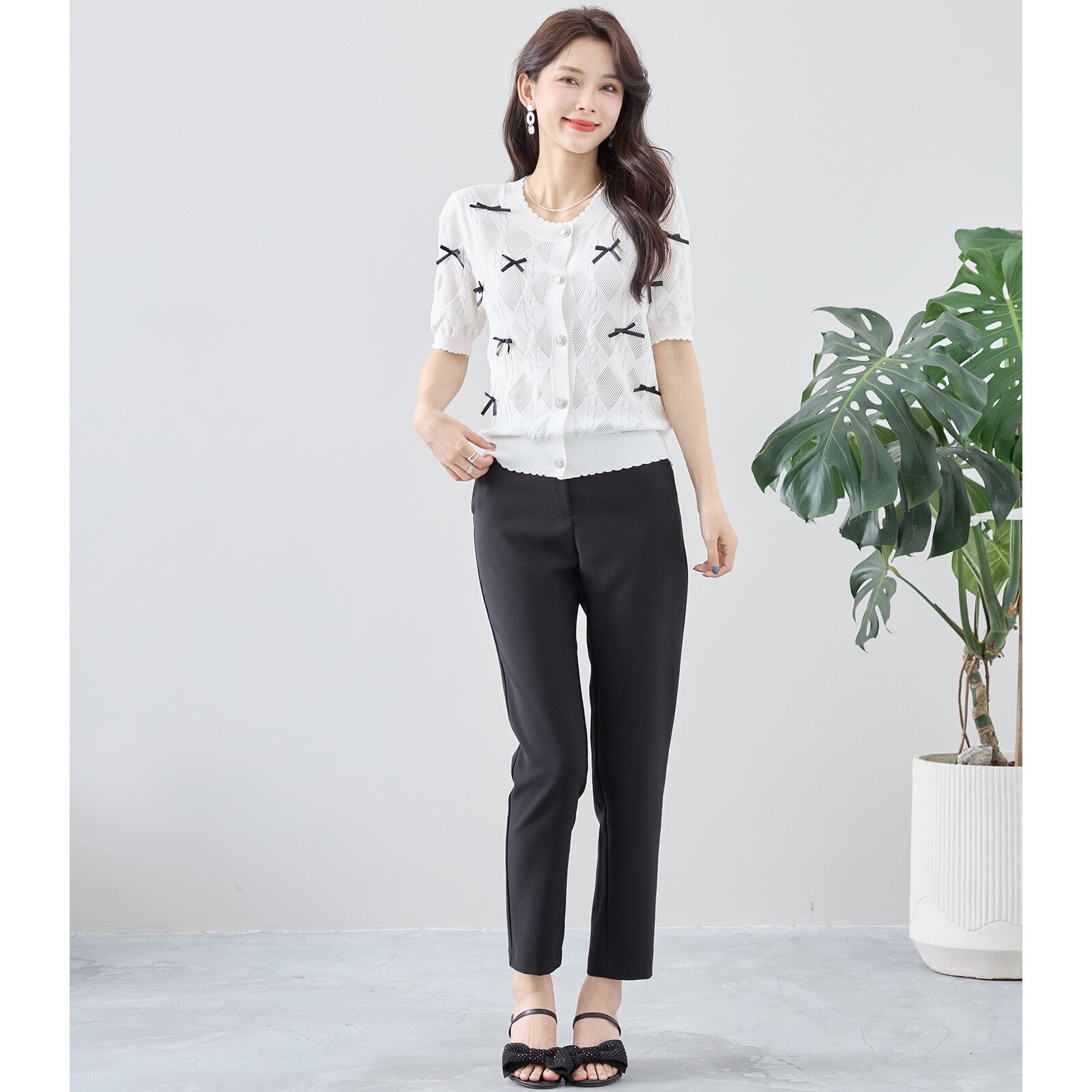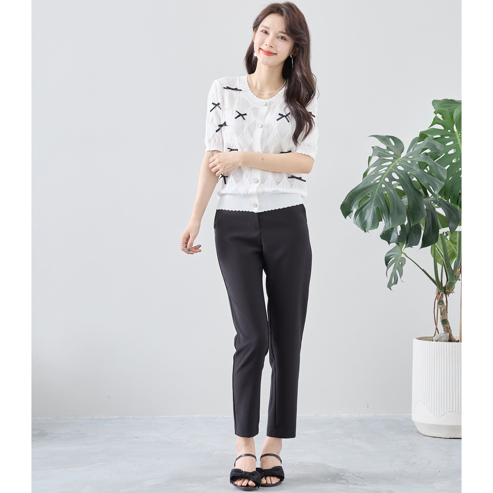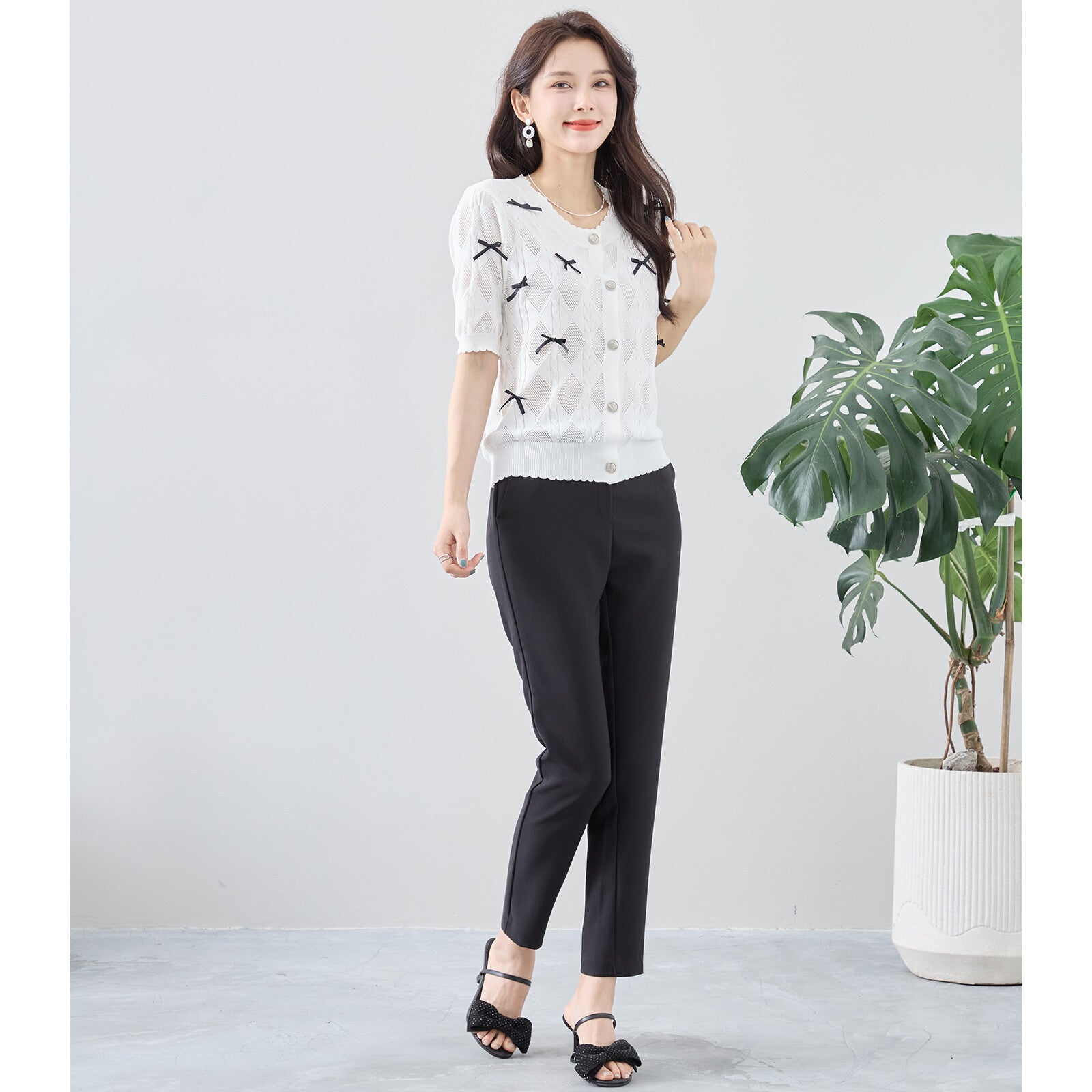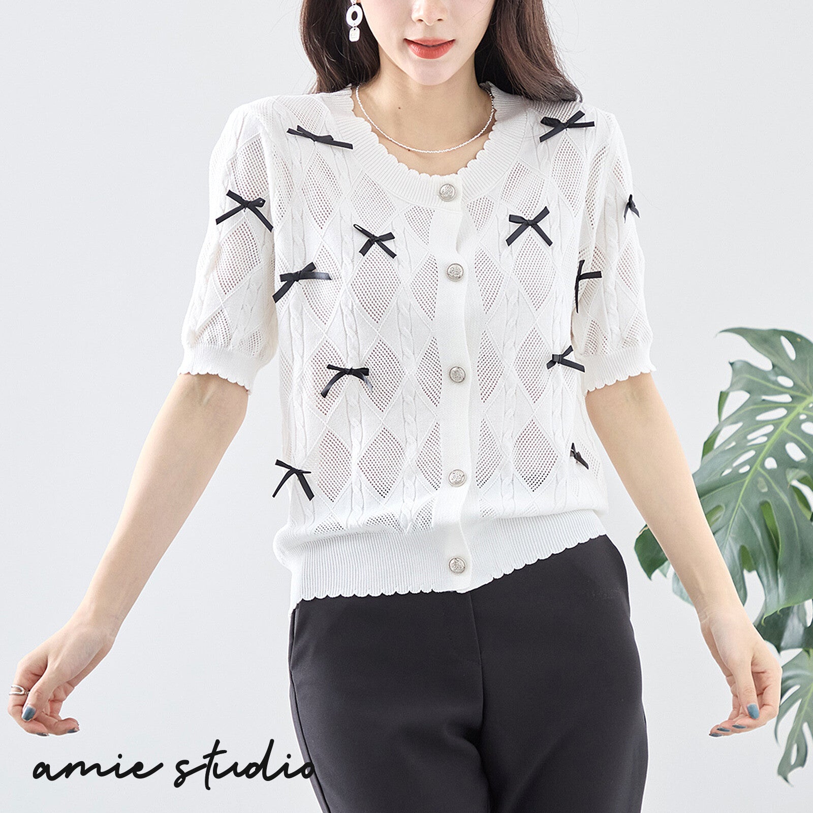 M〜L リボン付きサマーニットカーディガン|前開き 半袖 レディース きれいめ 大人可愛い トップス