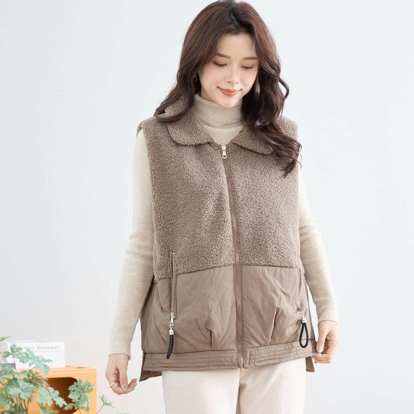 【M〜L】軽量ボア×ナイロン切替ベスト|暖かジップアップ・異素材デザイン・秋冬レイヤードスタイル TRUBE|N32-010A