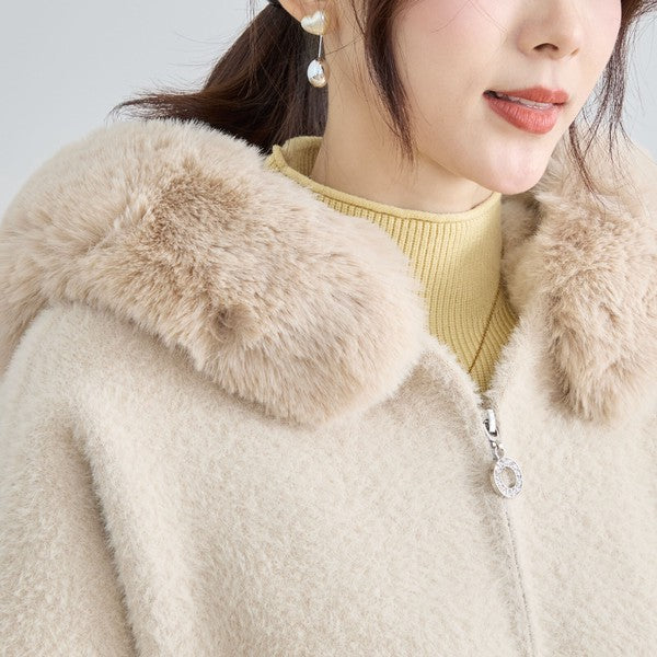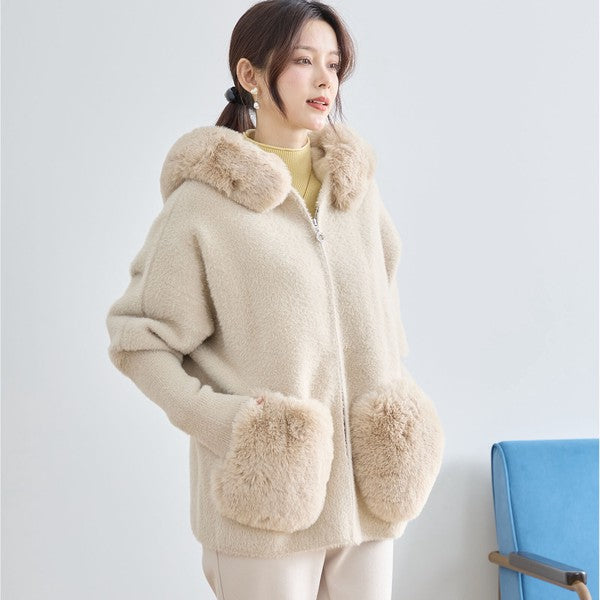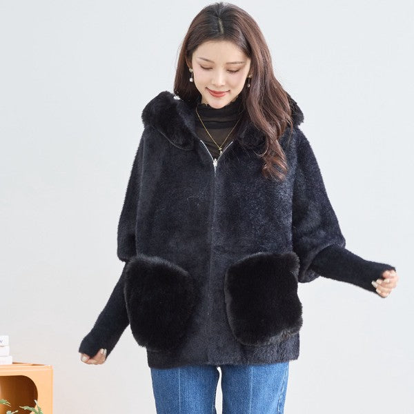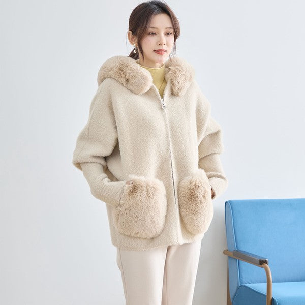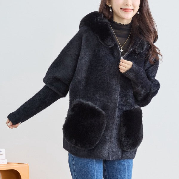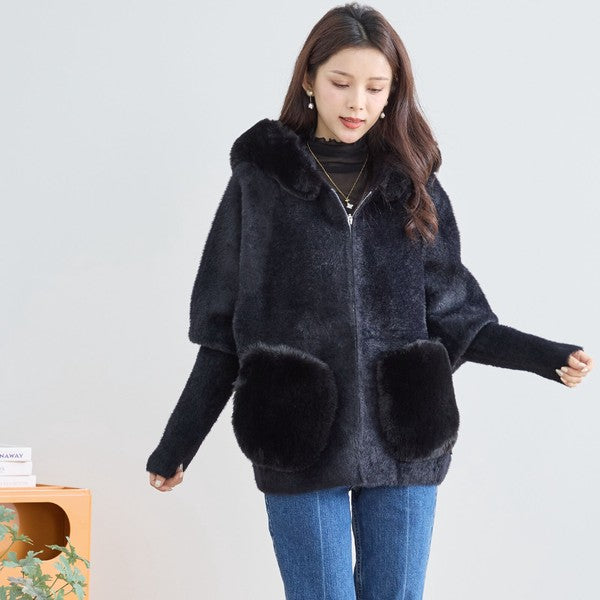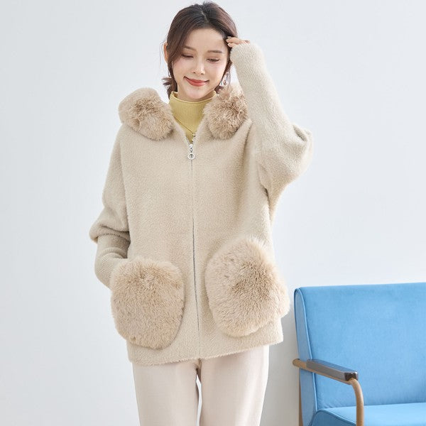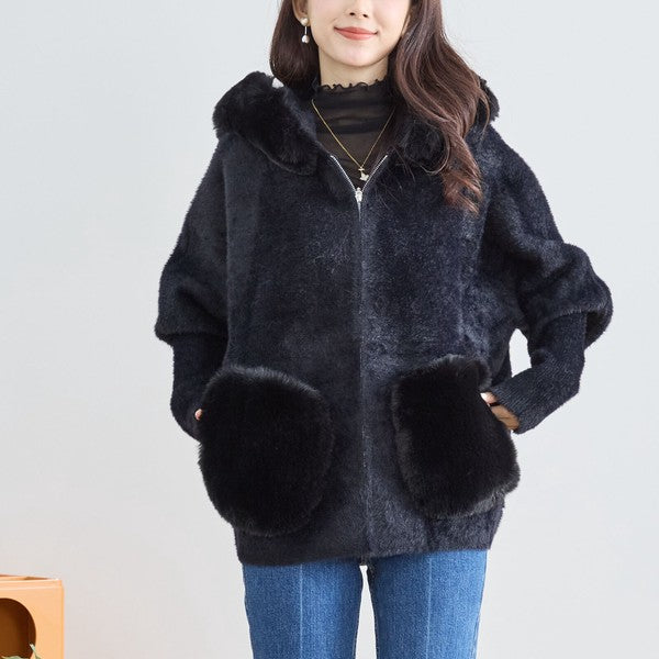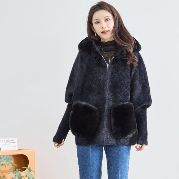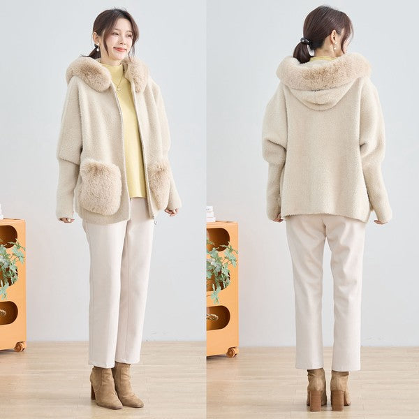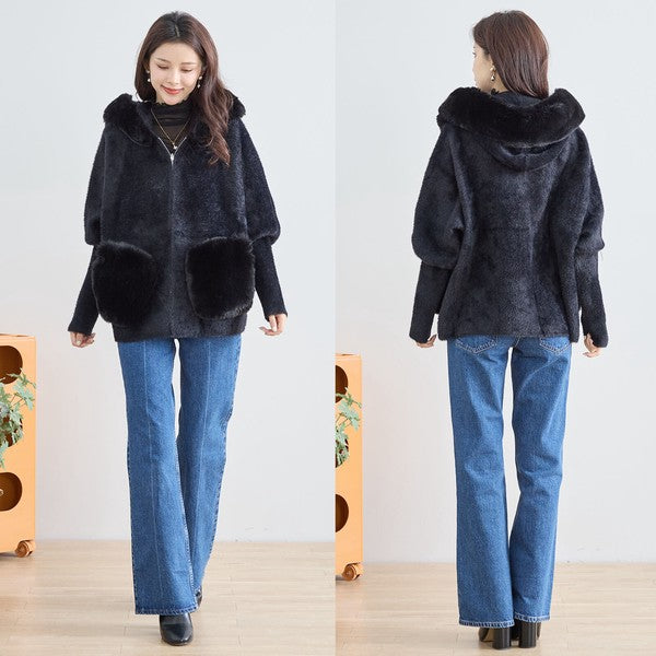 【M〜L】ふわふわポケット付きファーフードブルゾン|暖かリッチ・大人かわいい・TRUBE・N25-091B