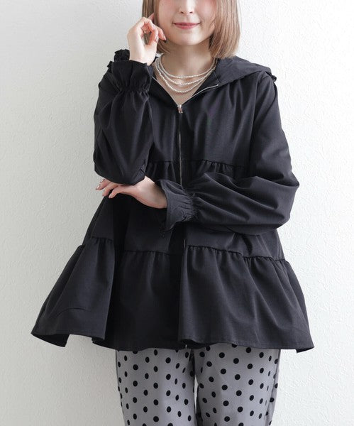 大人可愛い雰囲気を演出するフリルフード付きティアードジャケット。