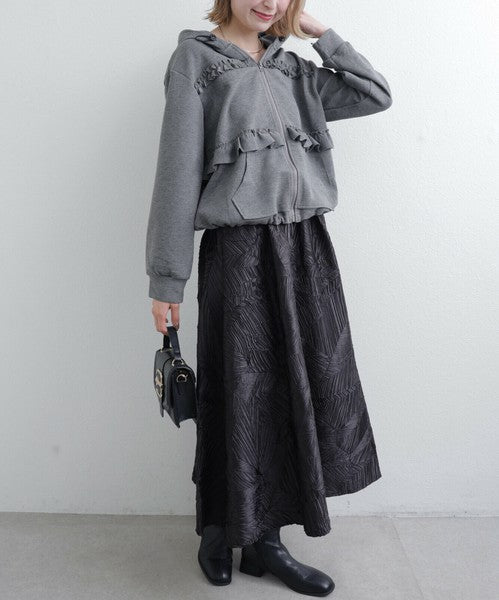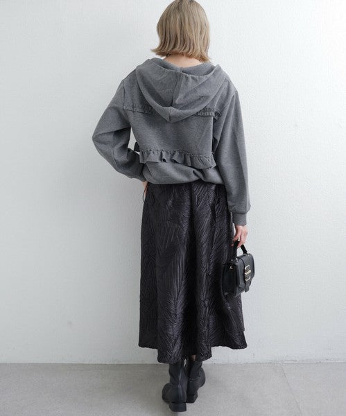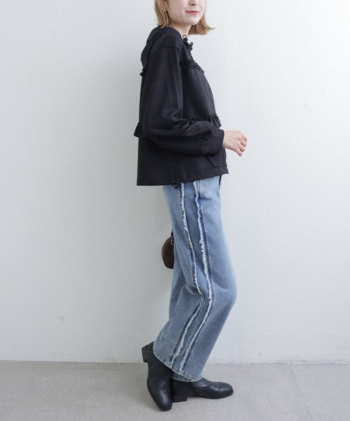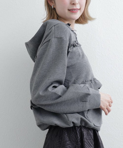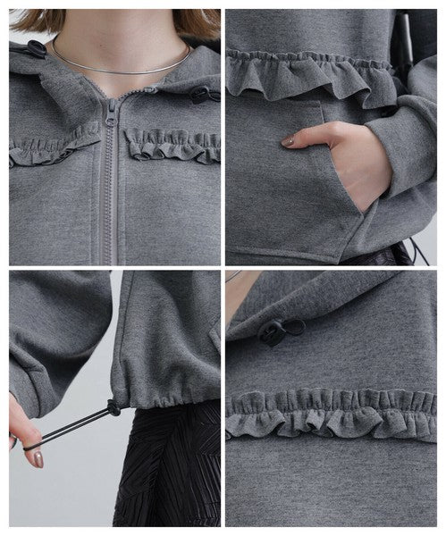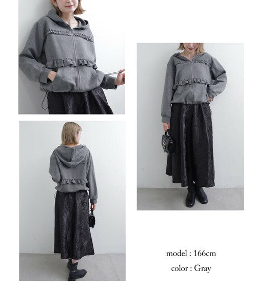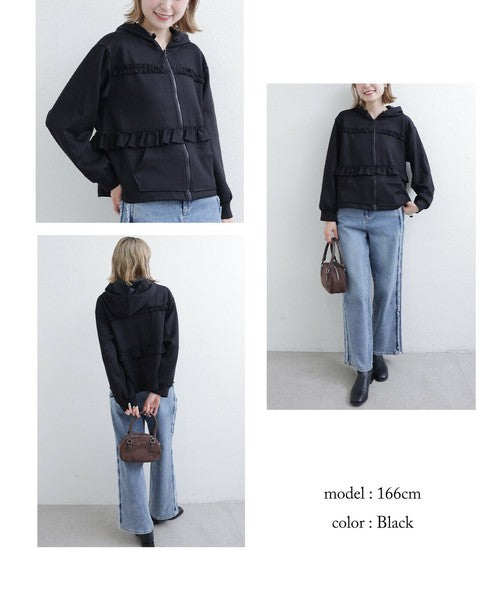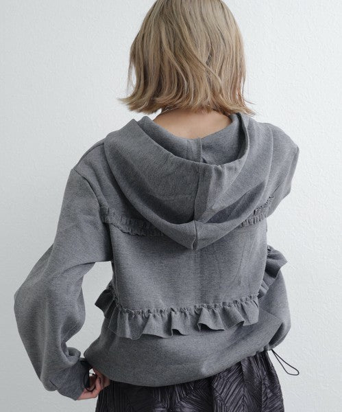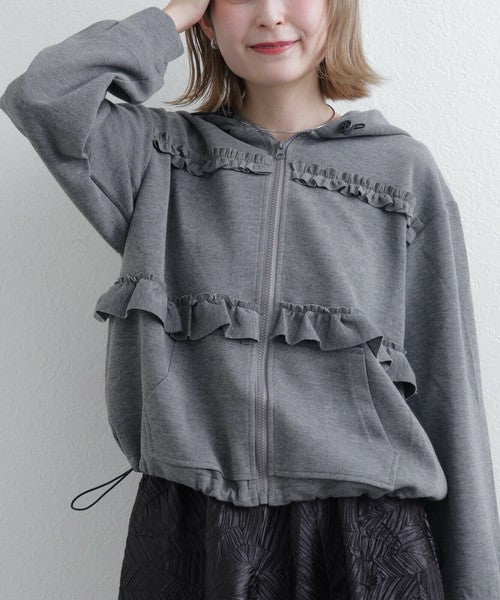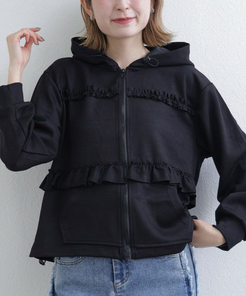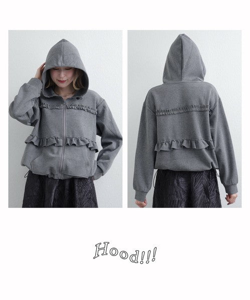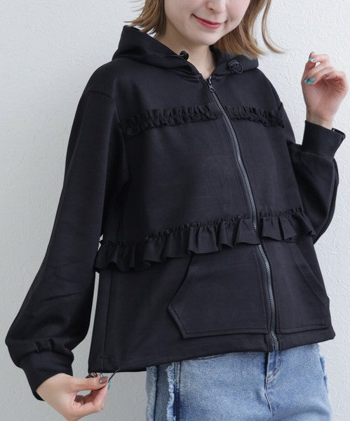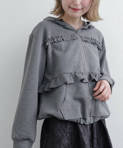 可愛らしい2段フリルをあしらったフード付きジャケット。