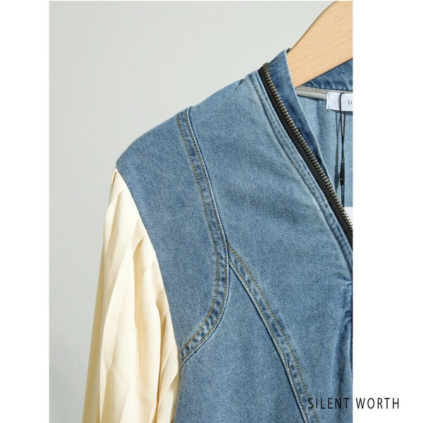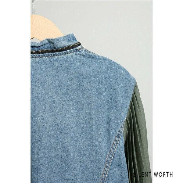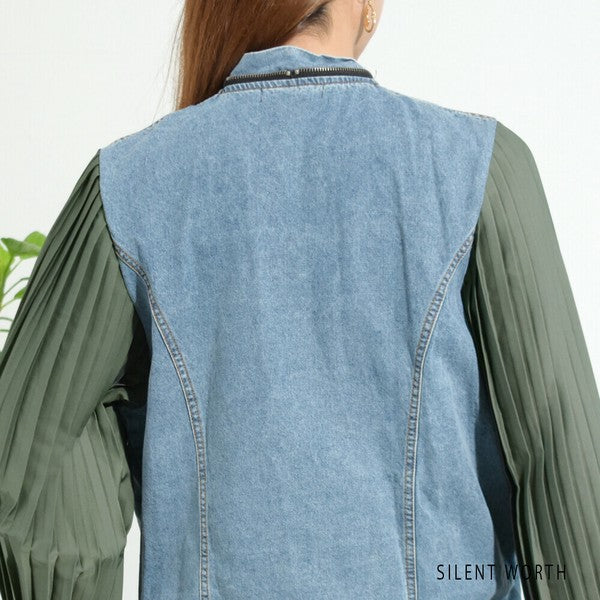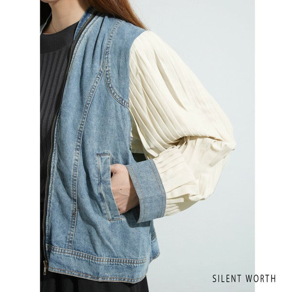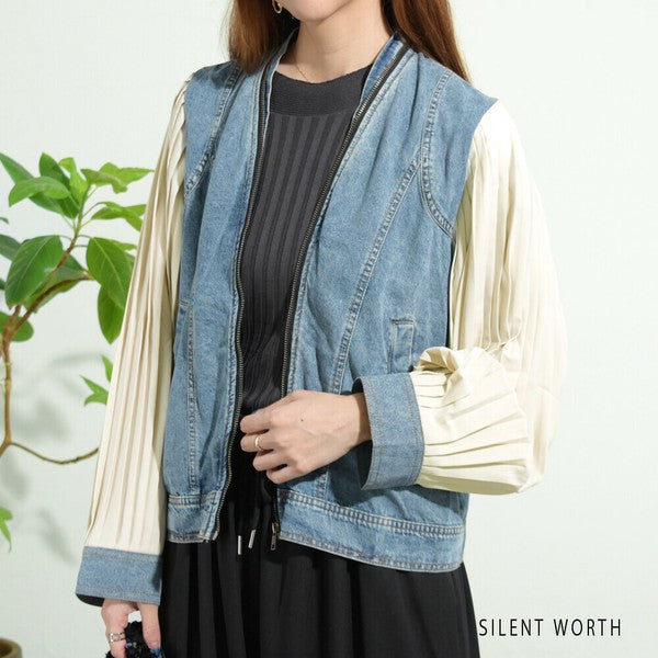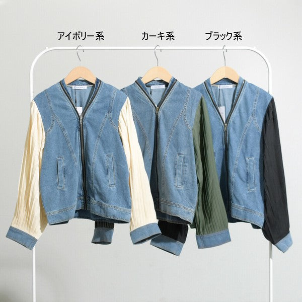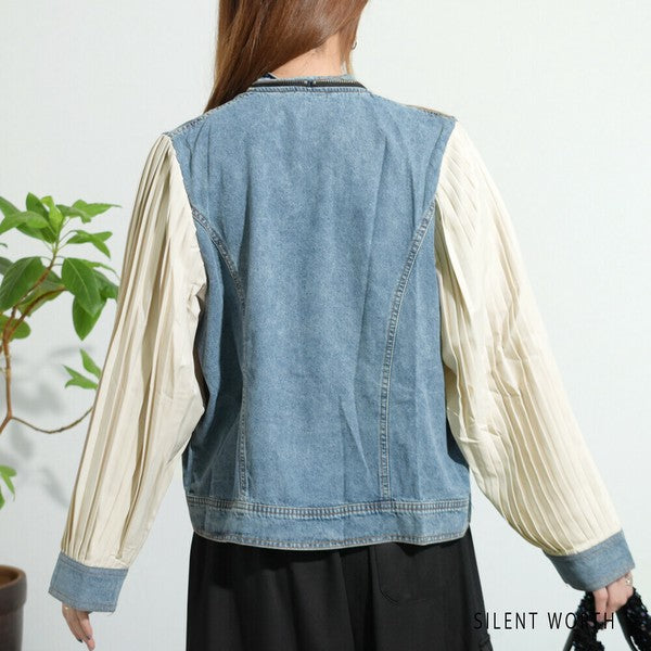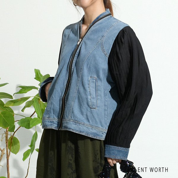 デニム×プリーツスリーブの異素材切替が印象的なジャケット