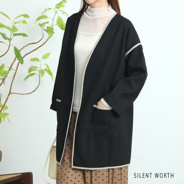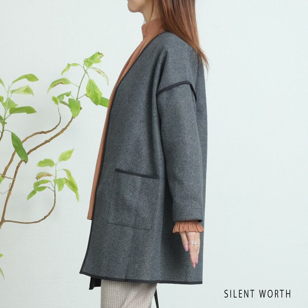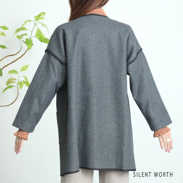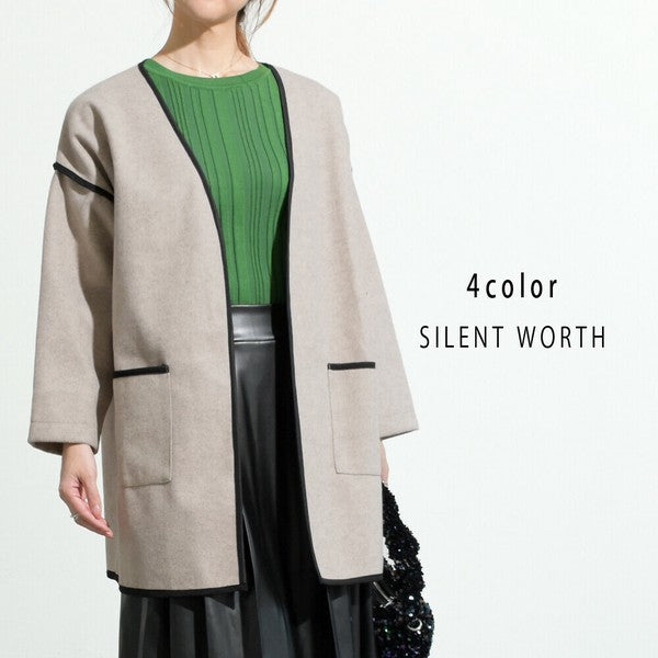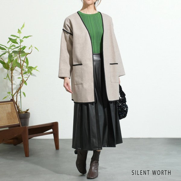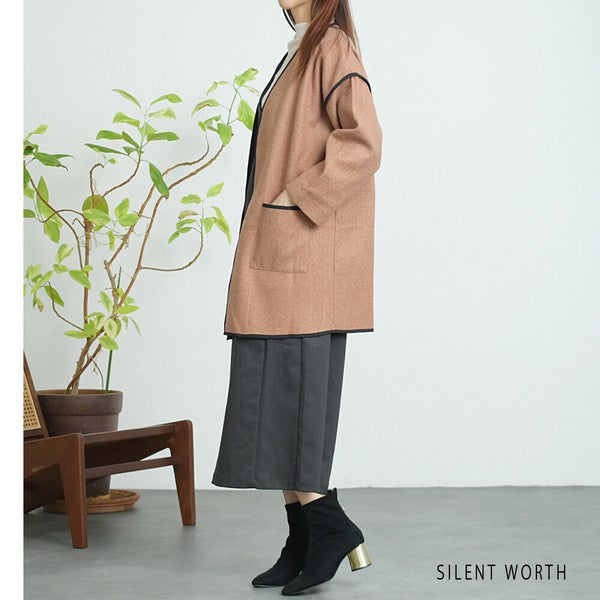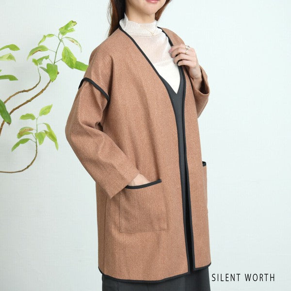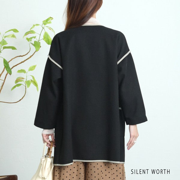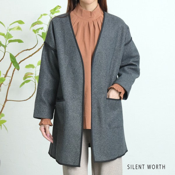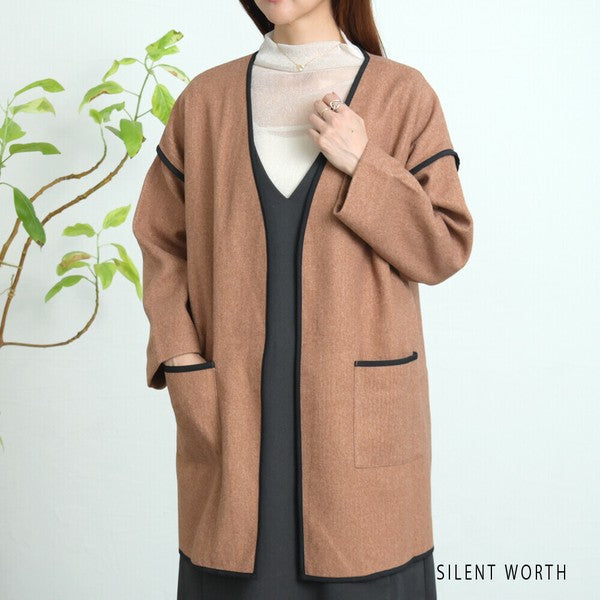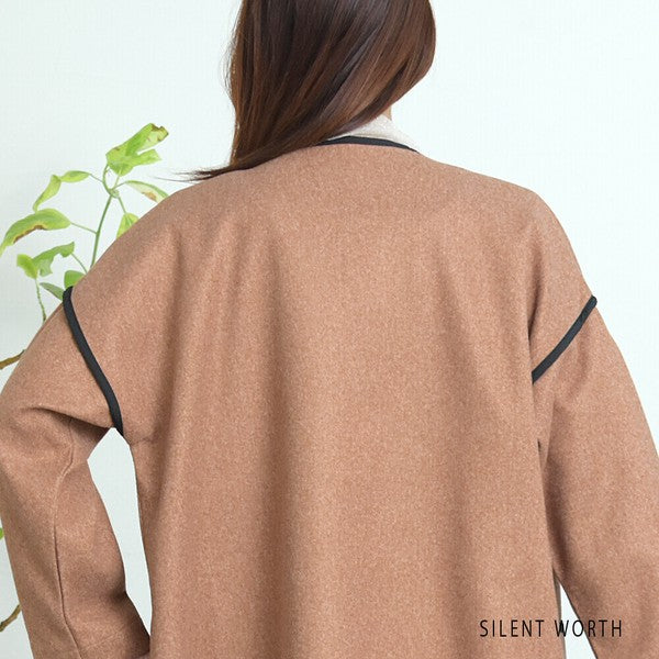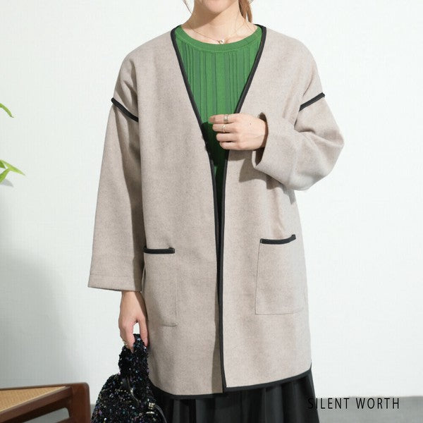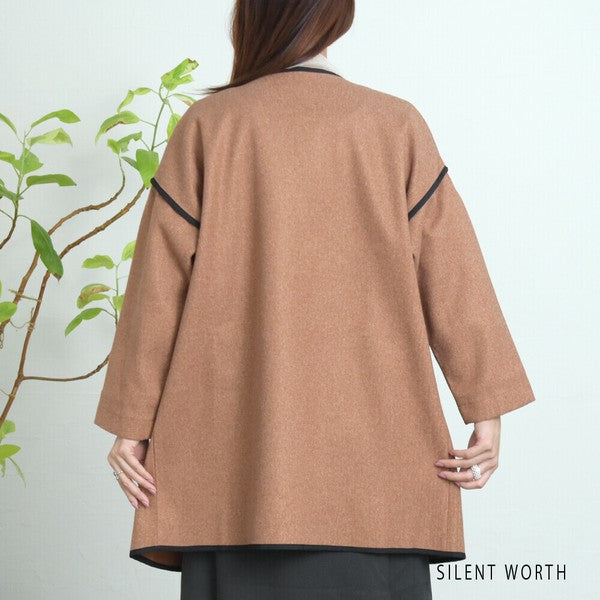 【M〜L相当】配色パイピング起毛ノーカラーコート|軽量アウター・上品シンプル・秋冬アウター・C-3181