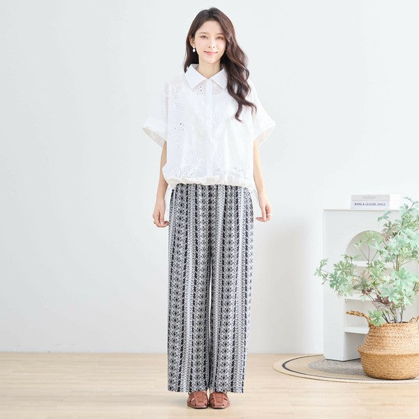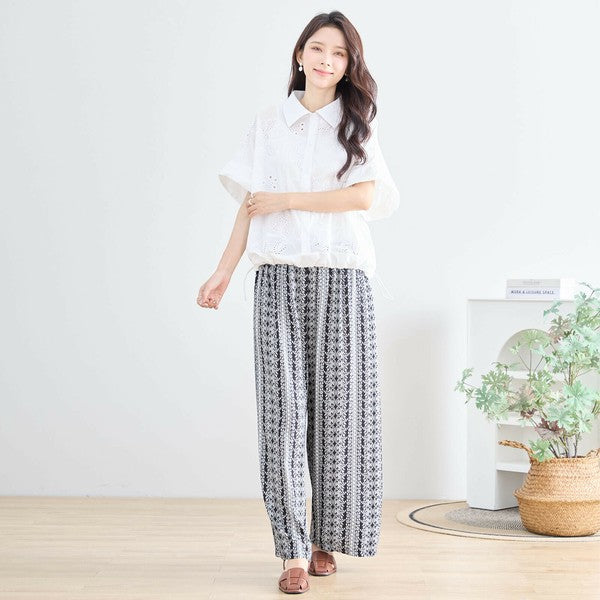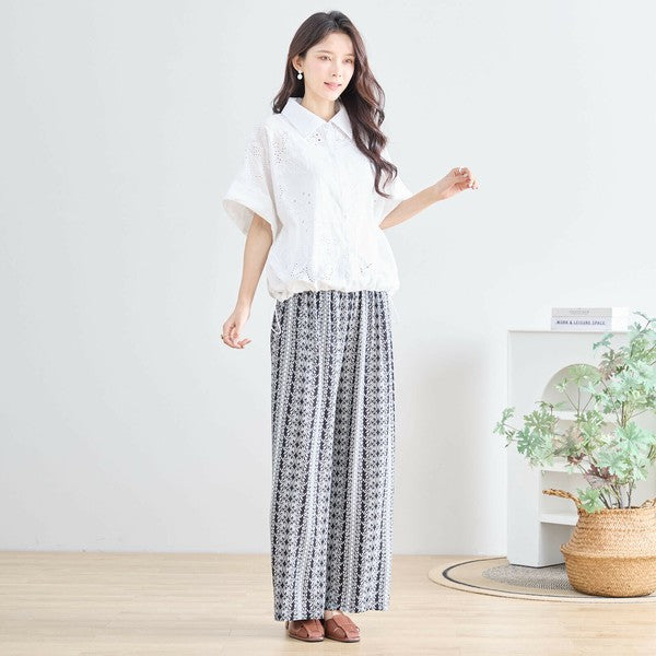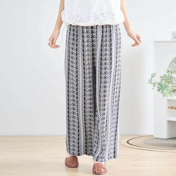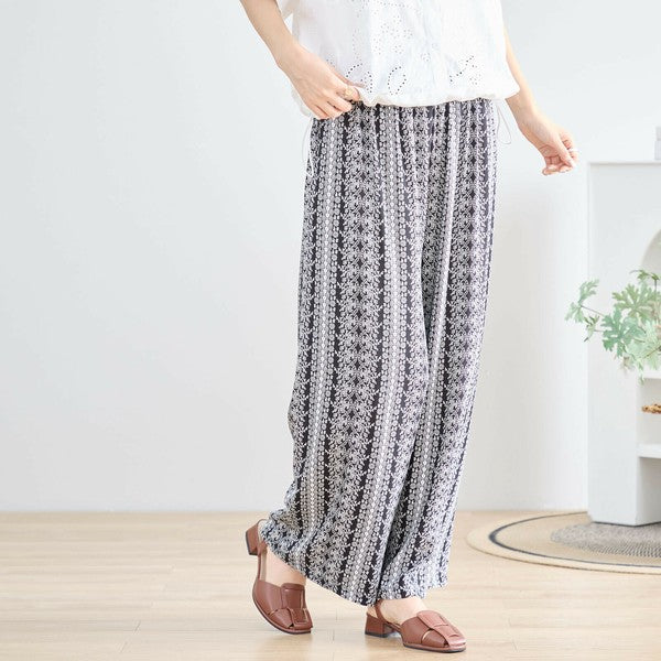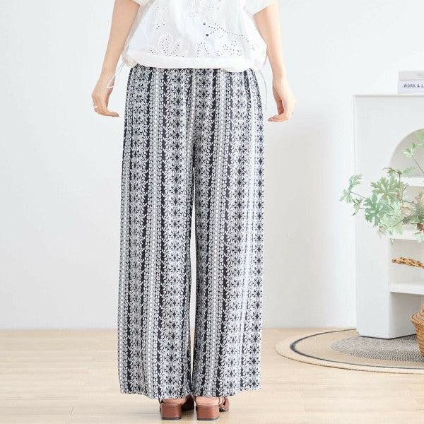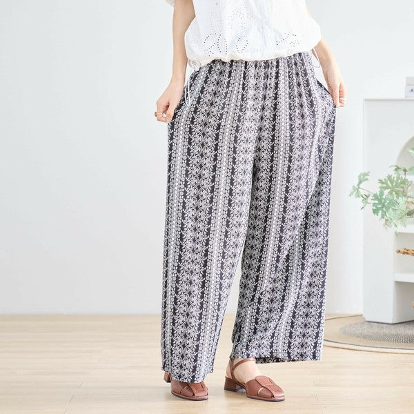 【M〜L】レース柄風フラワープリント ワイドパンツ|縦長ラインで脚長効果(N53-039)