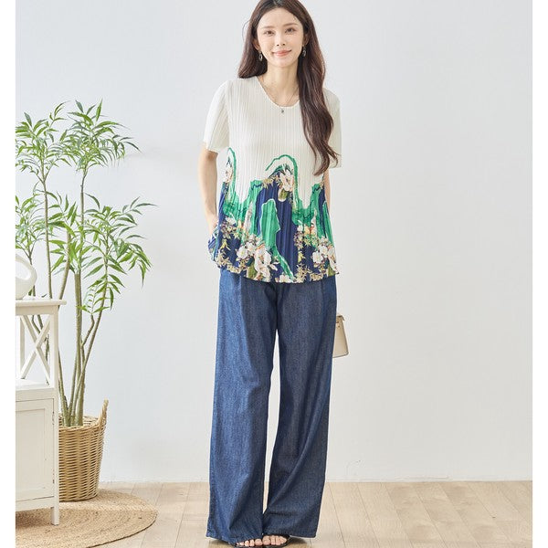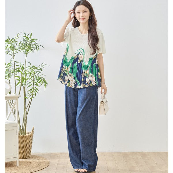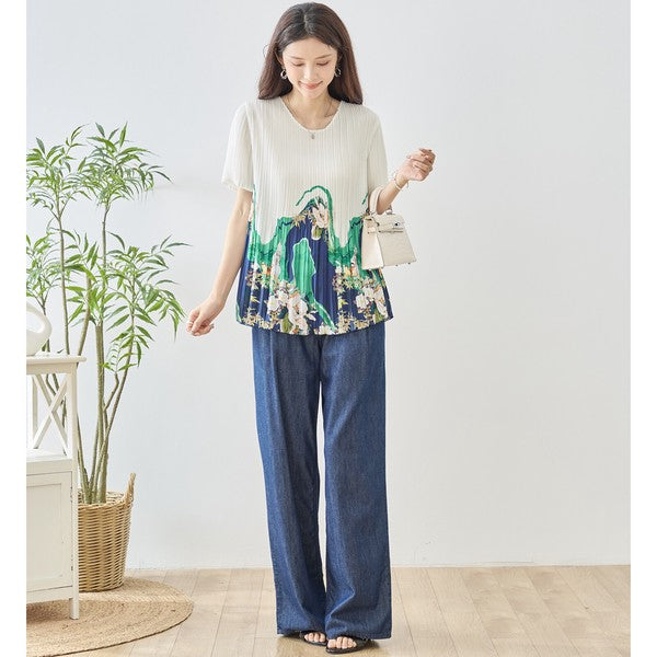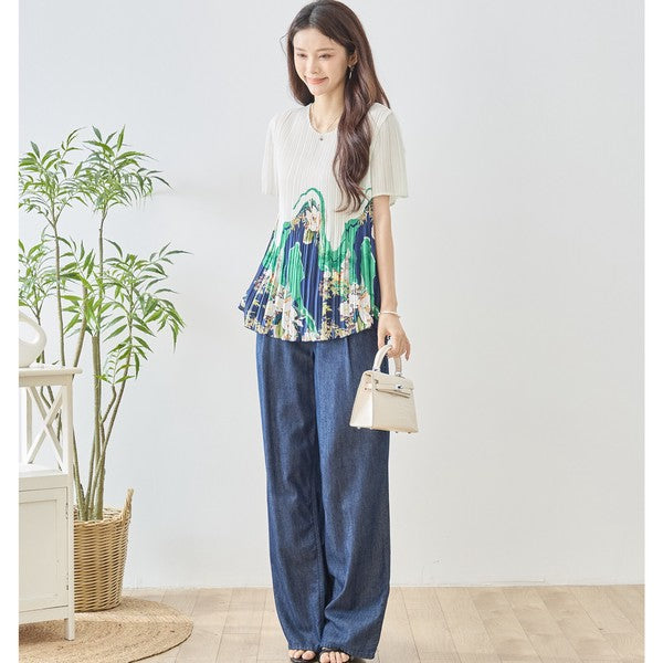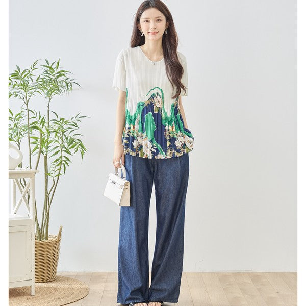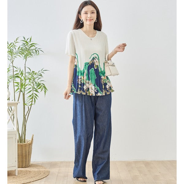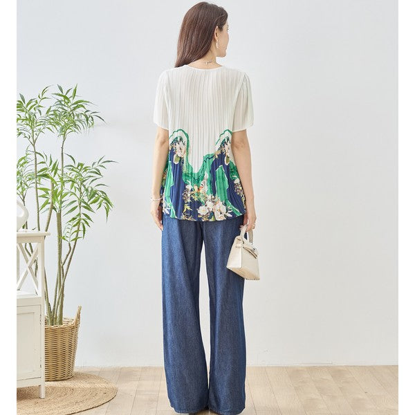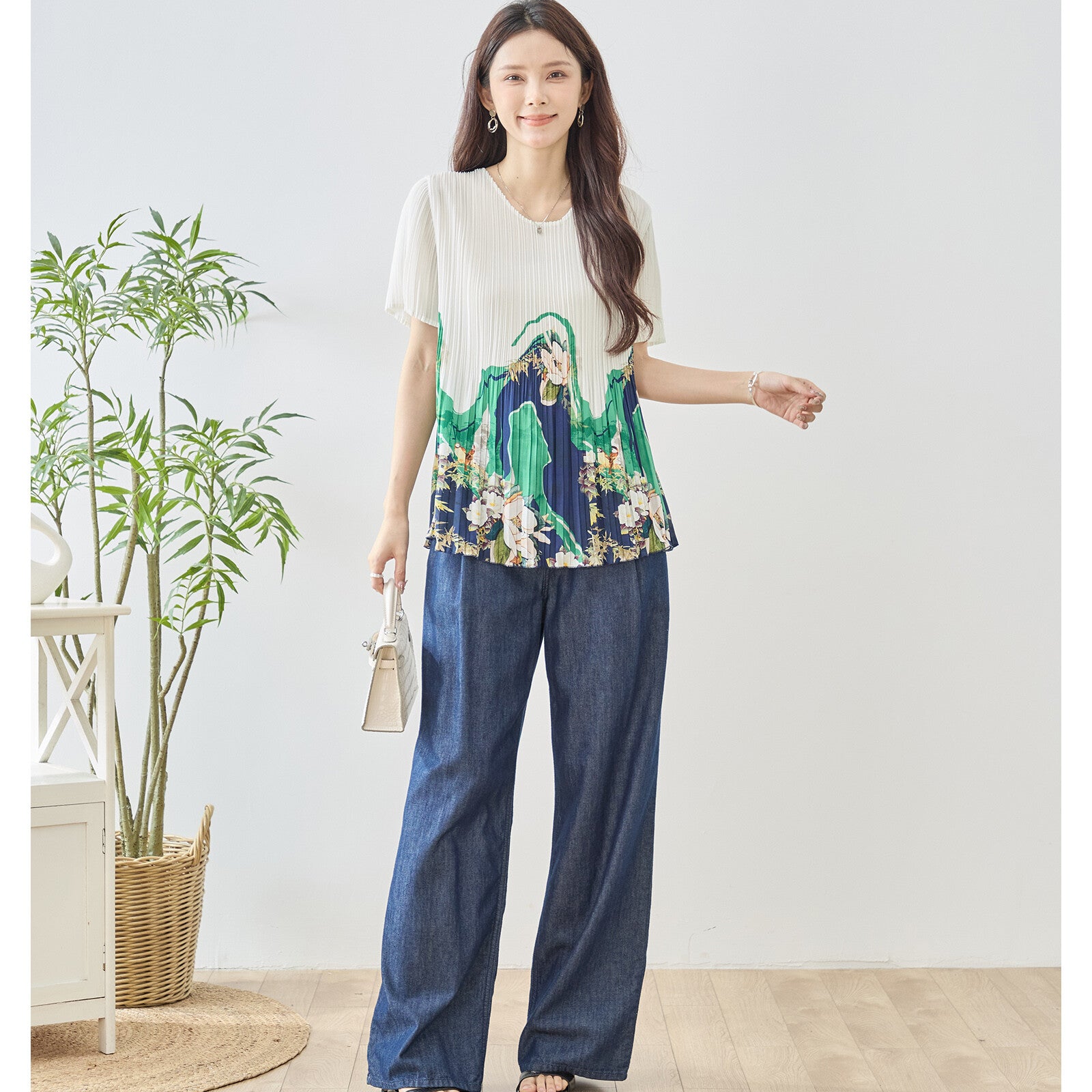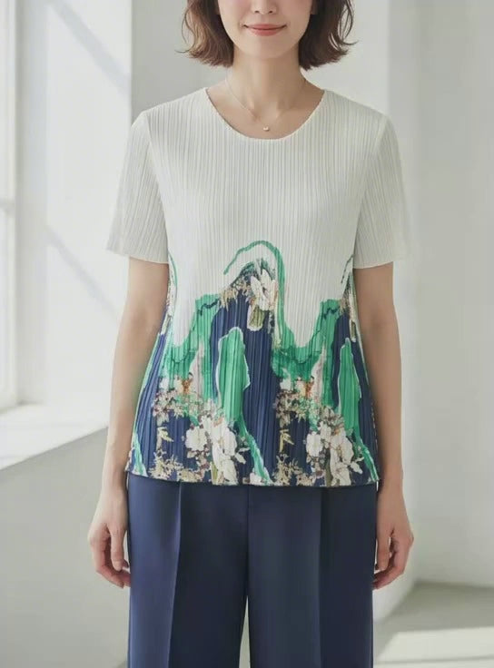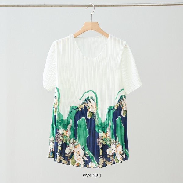 着るだけで生まれる、美しい立体感。絵画のような裾プリントが目を惹く、大人のためのプリーツブラウス。