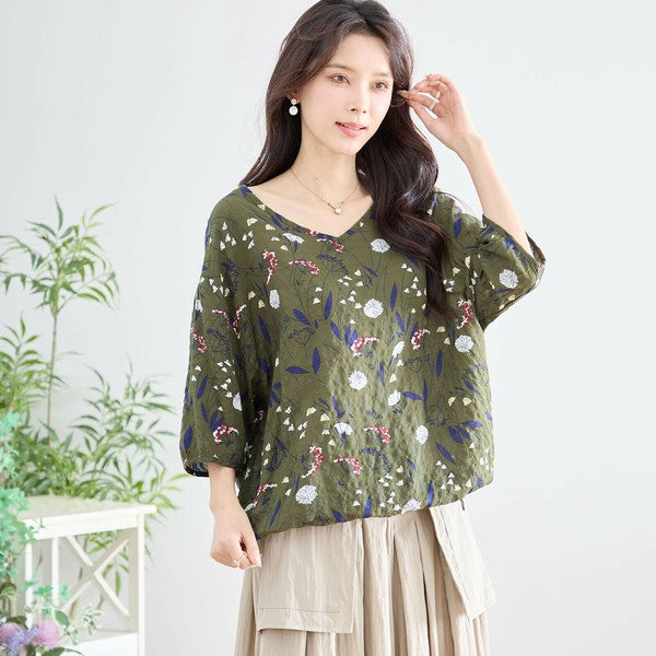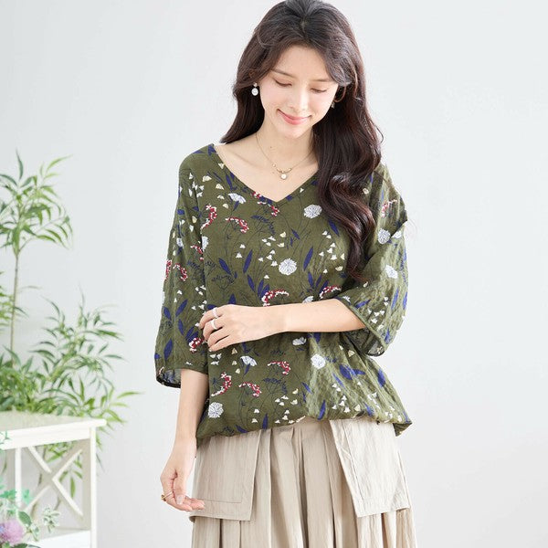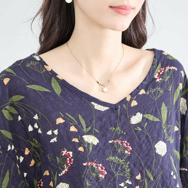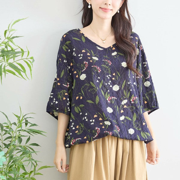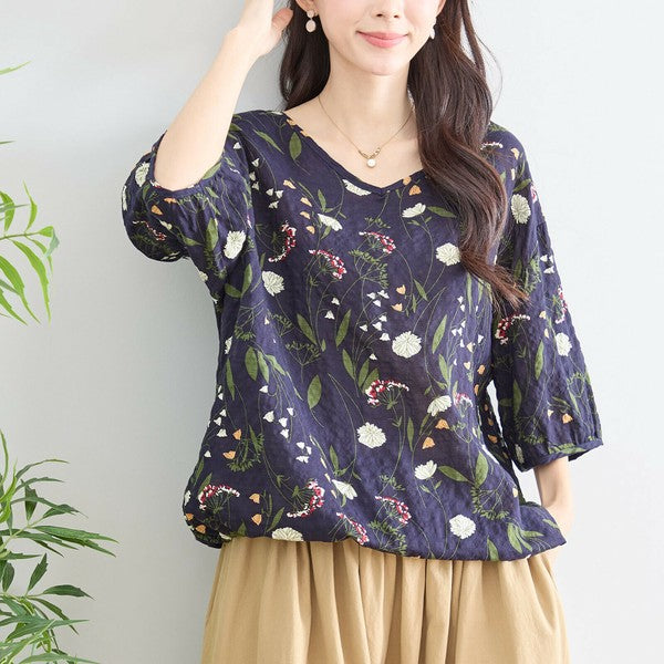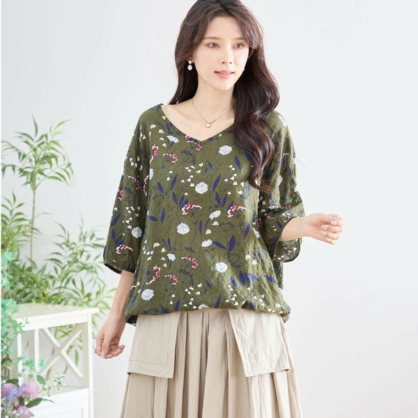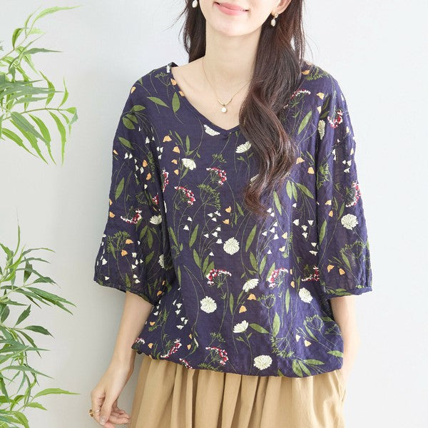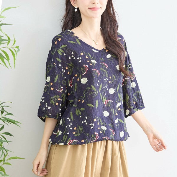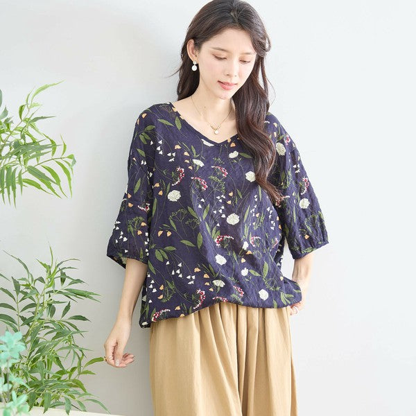 【L〜LL】ボタニカル花柄Vネックコットンプルオーバー|ゆったり七分袖トップス(N13-265)
