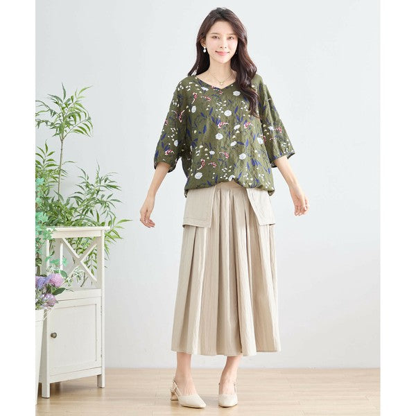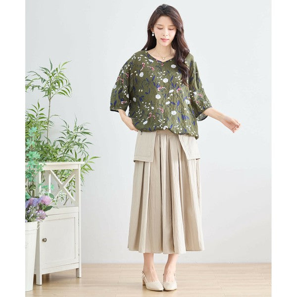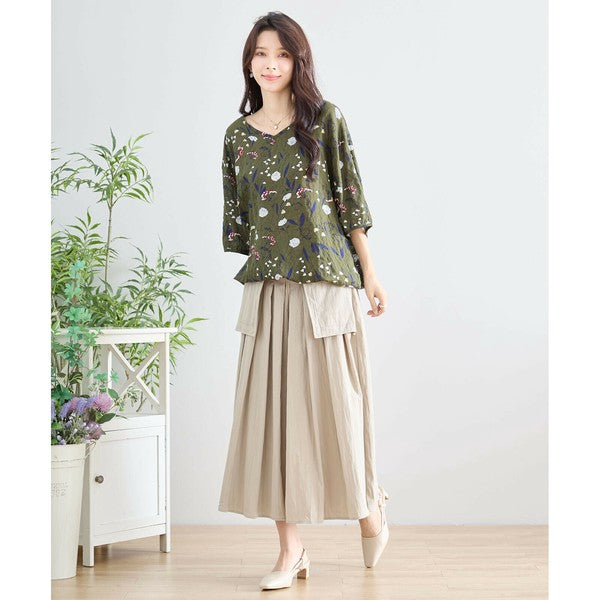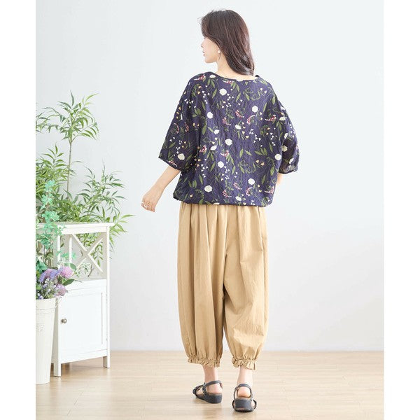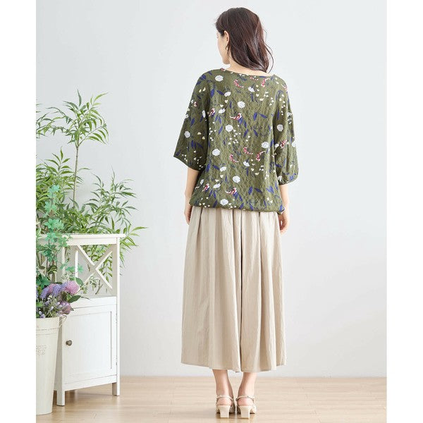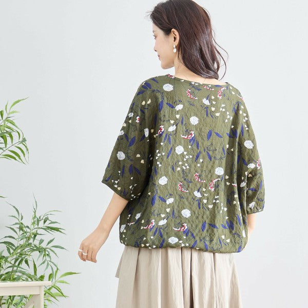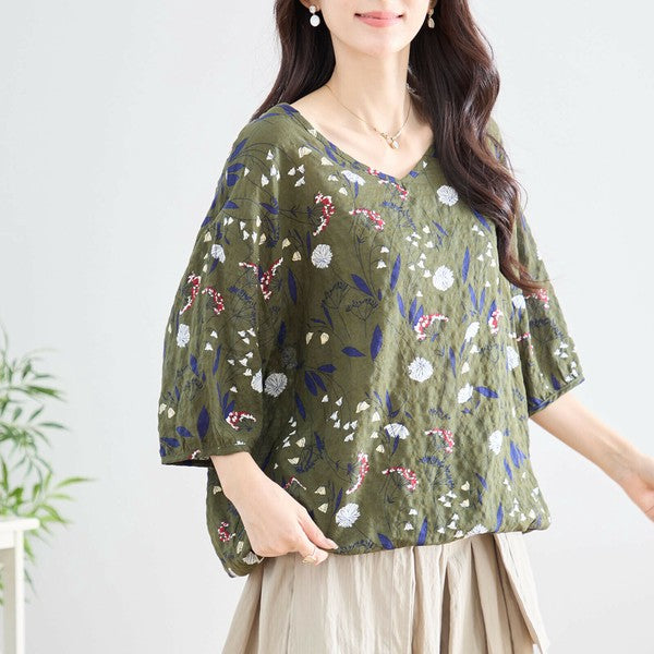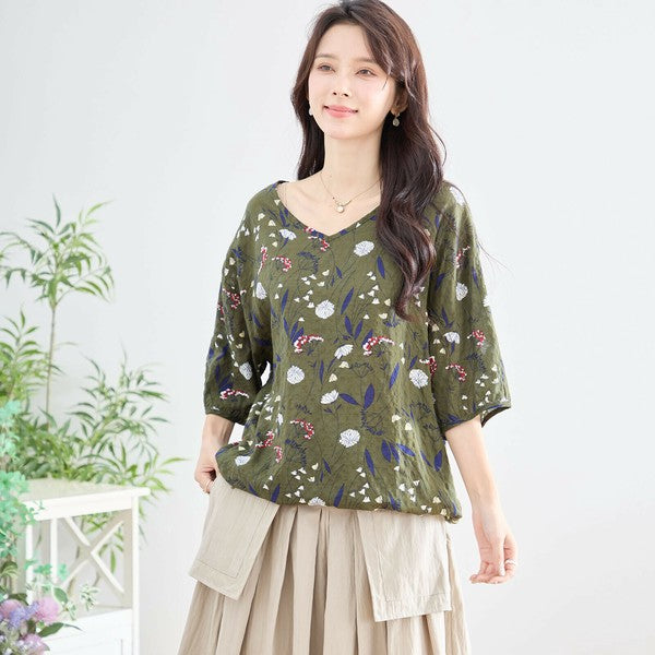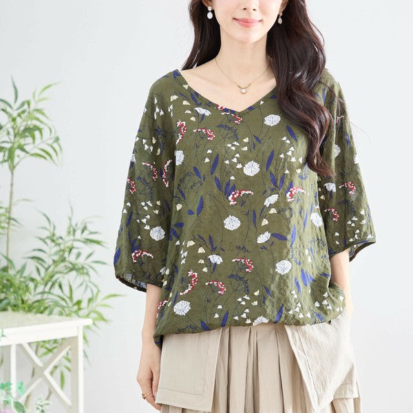 【L〜LL】ボタニカル花柄Vネックコットンプルオーバー|ゆったり七分袖トップス(N13-265)