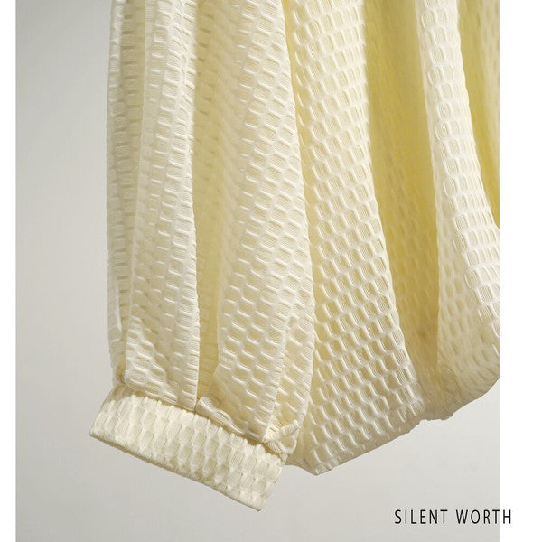 表面に凹凸のあるトレンドの「シアージャカード素材」を使用。 ふんわりとしたバルーンシルエットが女性らしさを引き立てつつ、シンプルなクルーネックで甘さを程よく抑えました。