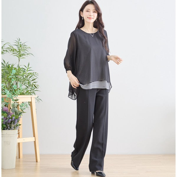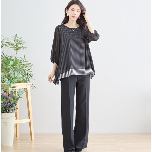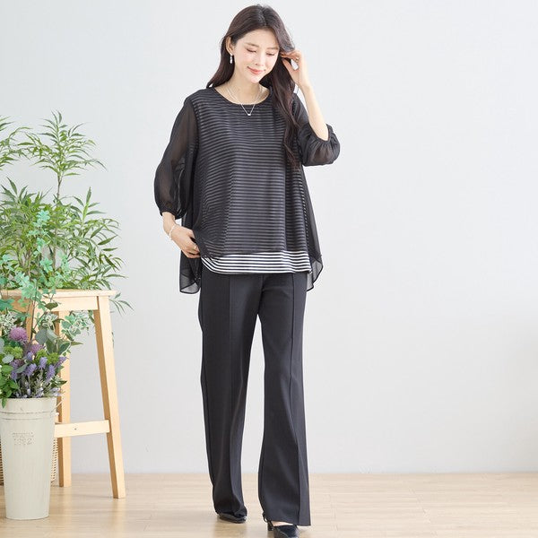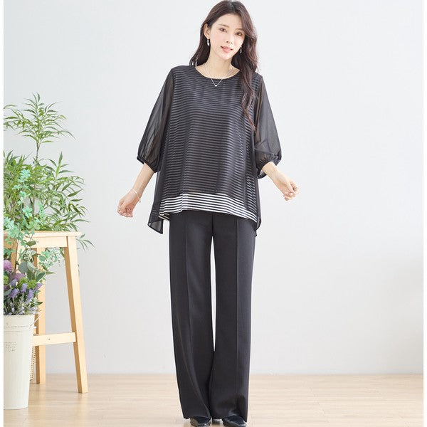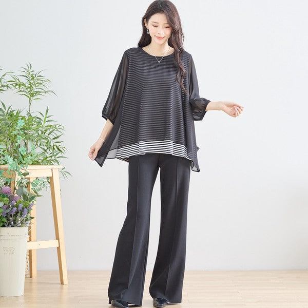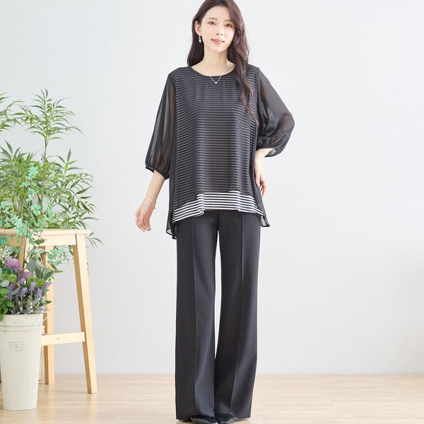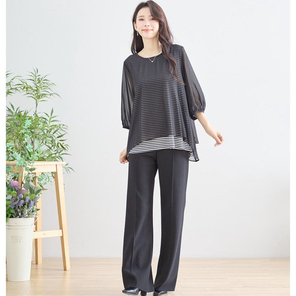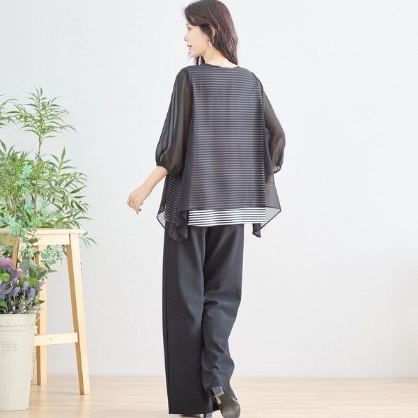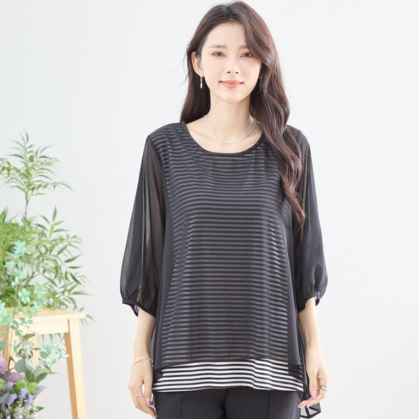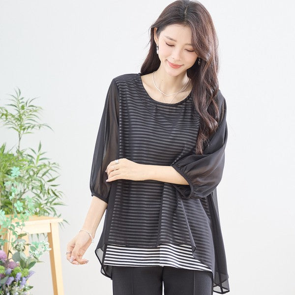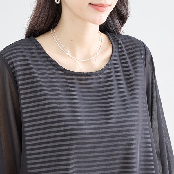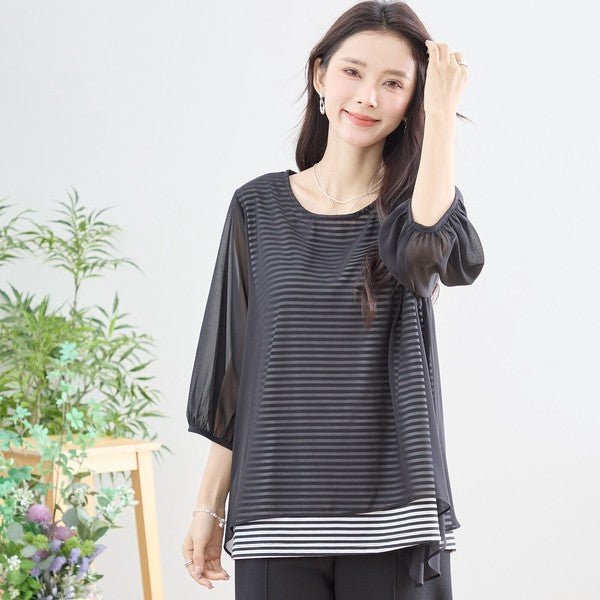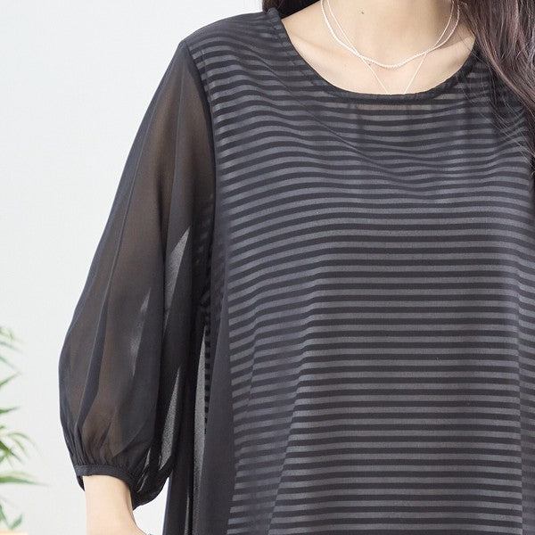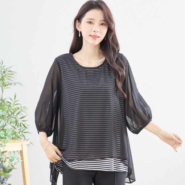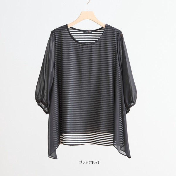 シアーレイヤード ボーダーデザイントップス 7分袖 ゆったり 体型カバー きれいめ