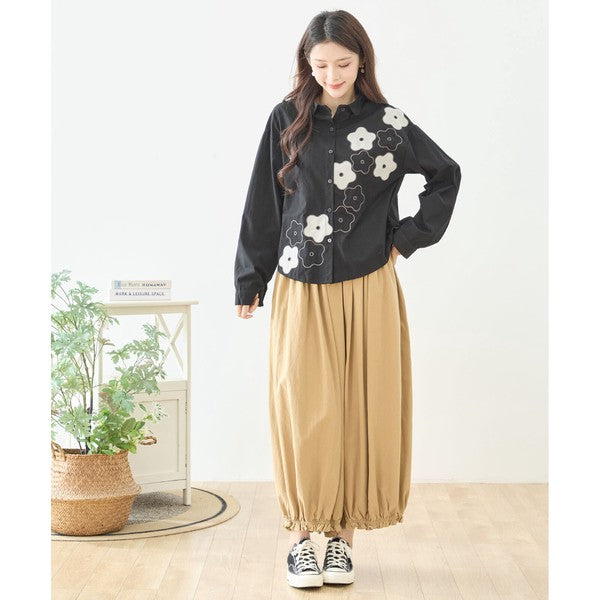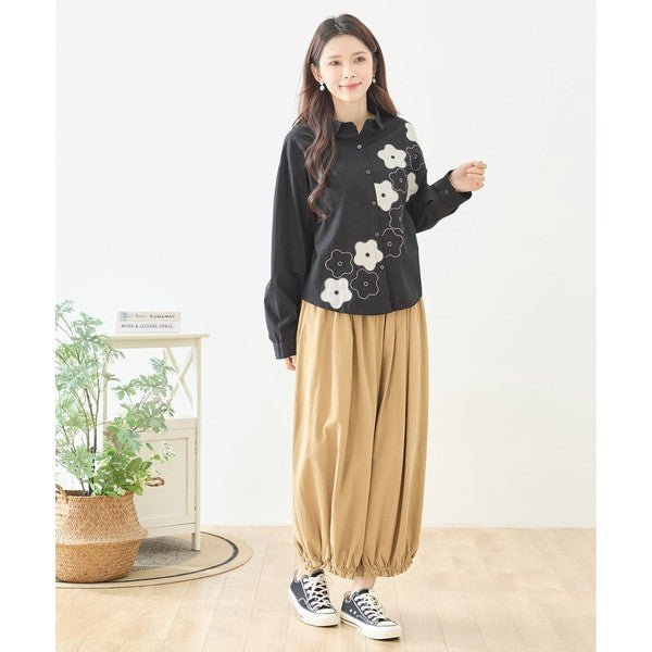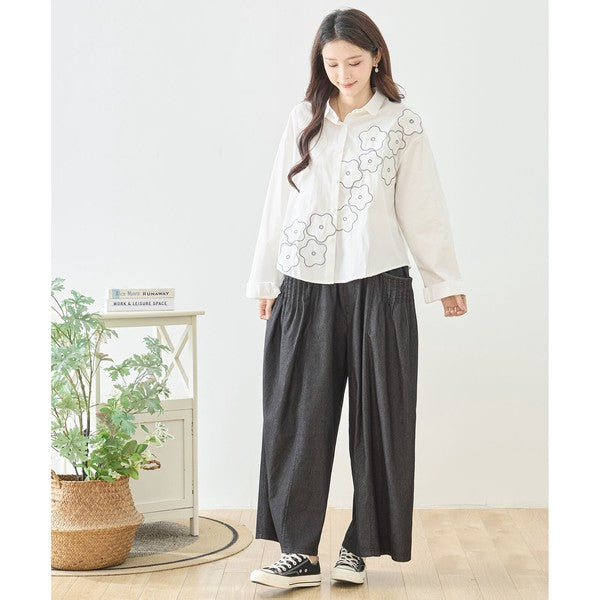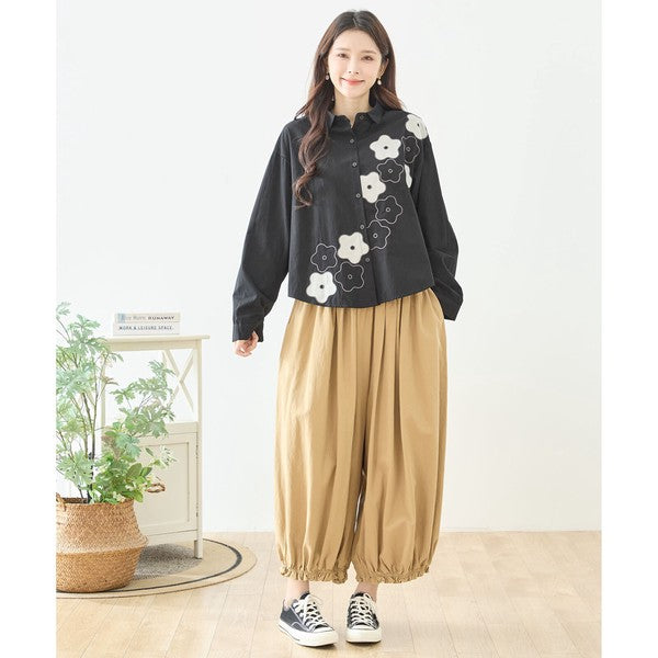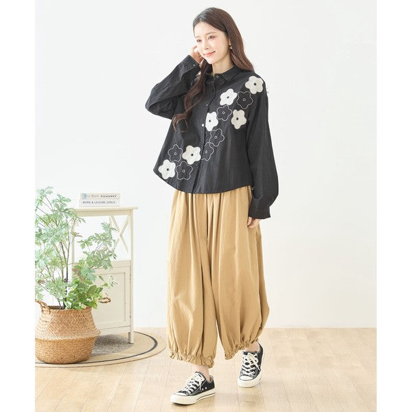 裾のお花パッチワークが大人可愛いTRUBEのワイドパンツ。綿100%の心地よい素材とウエスト総ゴムで、一日中ストレスフリーな履き心地。体型カバーと個性を両立する、Mikonosublueおすすめのリラックスパンツです。